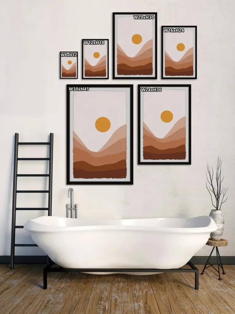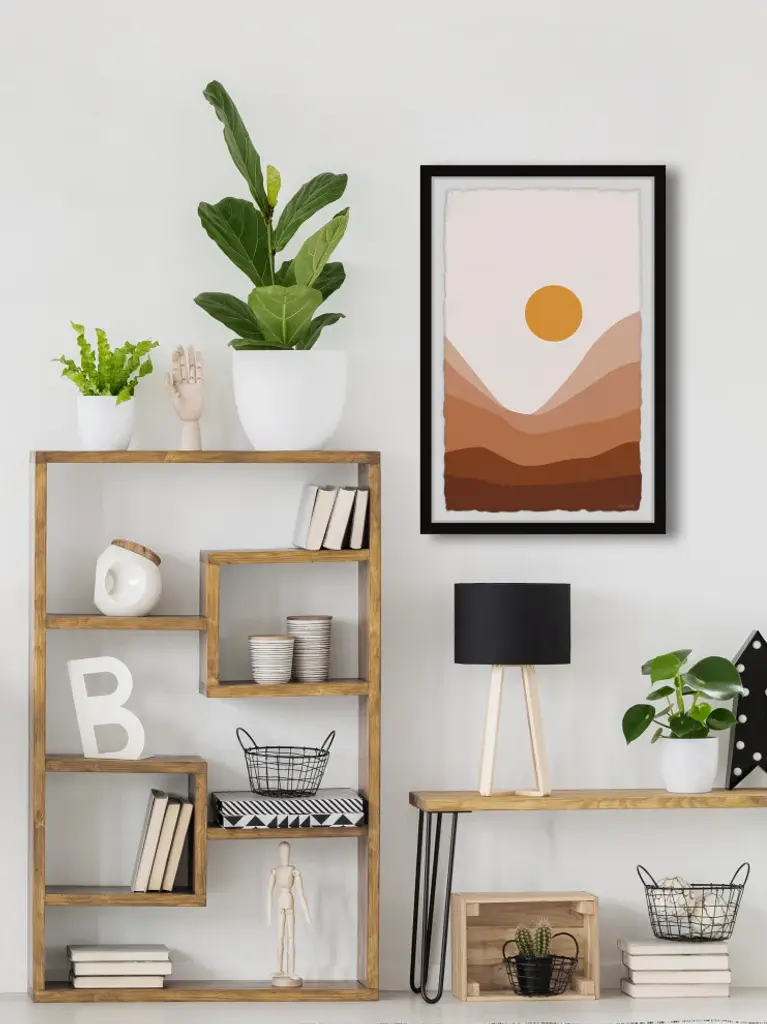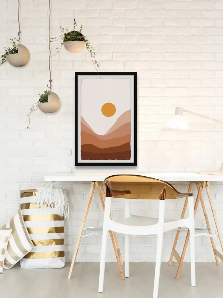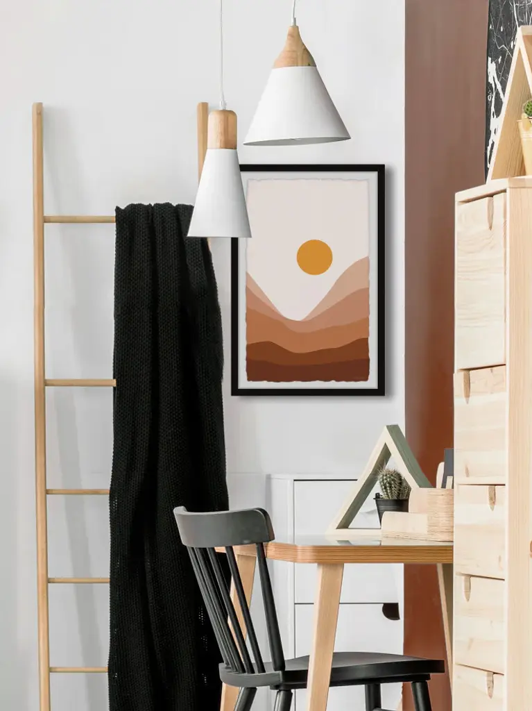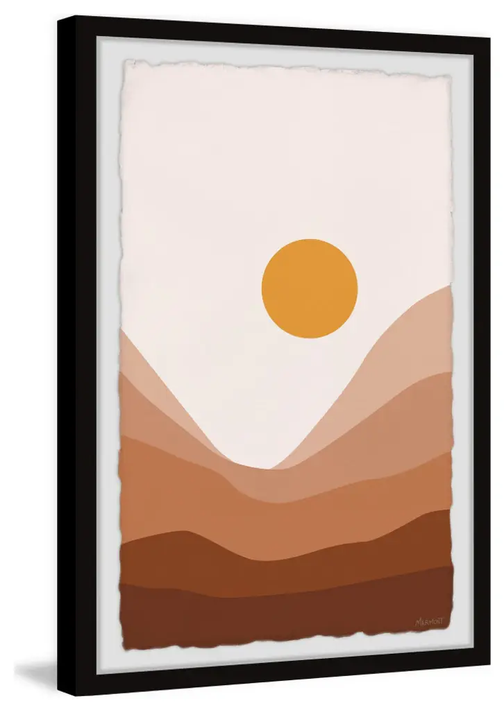 Make your space more vibrant with this drawing print that features overlapping mountains and a large yellow sun in the sky. Proudly printed in the USA, this piece is printed on high quality archive paper and professionally hand-framed. With wall-mounting hooks included, this artful accent is ready to hang up as soon as it reaches your front door.- Top quality Giclee print on high resolution Archive Paper- Hand cut deckled edges- High quality durable non-warping frame- Finished under shatter resistant plexiglass- Arrives ready to hang- Includes a certificate of authenticity- Printed in the USA