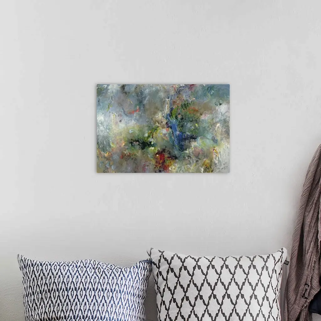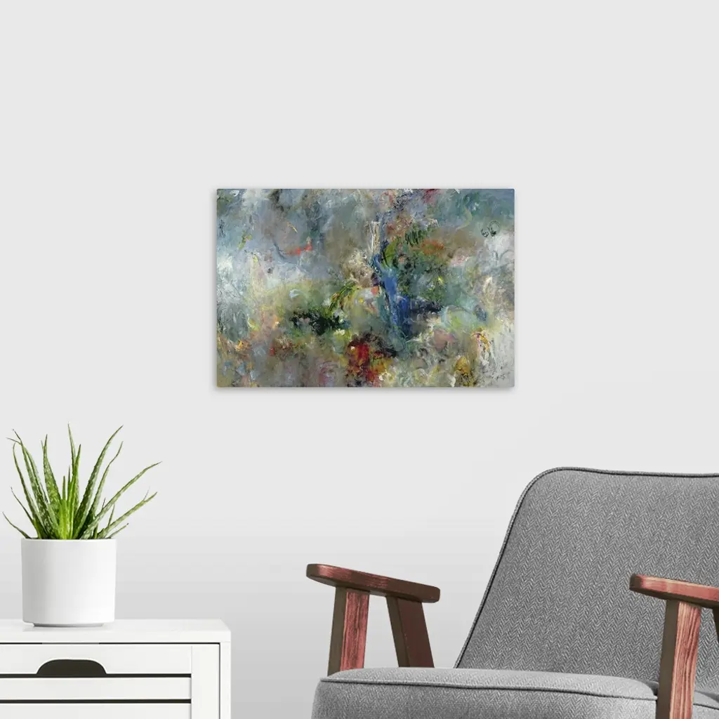 Large, horizontal abstract painting of multicolored layers of paint in swirling brushstrokes in many directions, painted mainly in cooler tones.