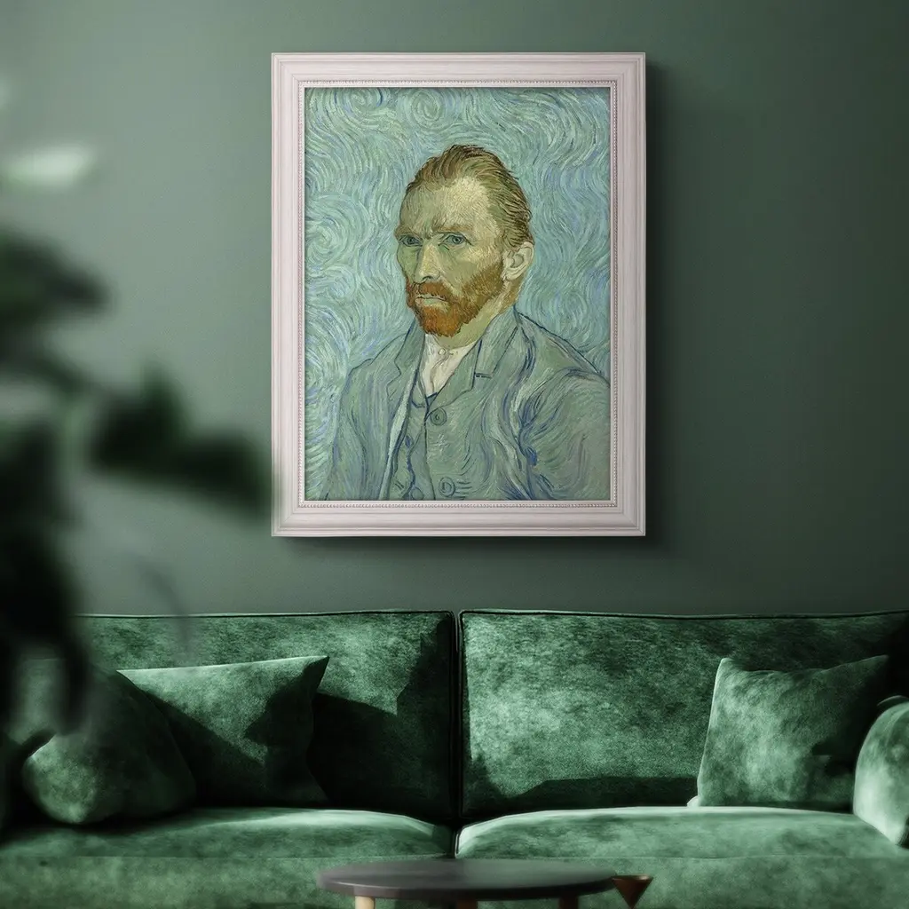 Van Gogh self-portrait Premium Framed Canvas- Ready to Hang A Premium Framed Canvas created to last. Framed in distressed wood and available in an array of sizes and colors Featuring a beveled a solid wood stretcher bar, each piece comes ready to hand 3 SIZES AVAILABLE 16''X20'' - Overall Size 18'X27'' - Overall Size 24''x36'' - Overall Size Each piece is made to order. Each piece comes with hanging hardware. Made in the USA Ready to Hang Giclee Paper Print Acrylic Glass Beveled Matt Board