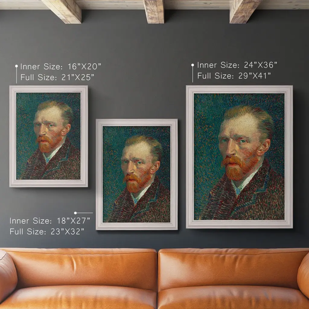 Van Gogh self-portrait Premium Framed Canvas- Ready to Hang A Premium Framed Canvas created to last. Framed in distressed wood and available in an array of sizes and colors Featuring a beveled a solid wood stretcher bar, each piece comes ready to hand 3 SIZES AVAILABLE 16''X20'' - Overall Size 18'X27'' - Overall Size 24''x36'' - Overall Size Each piece is made to order. Each piece comes with hanging hardware. Made in the USA Ready to Hang Giclee Paper Print Acrylic Glass Beveled Matt Board