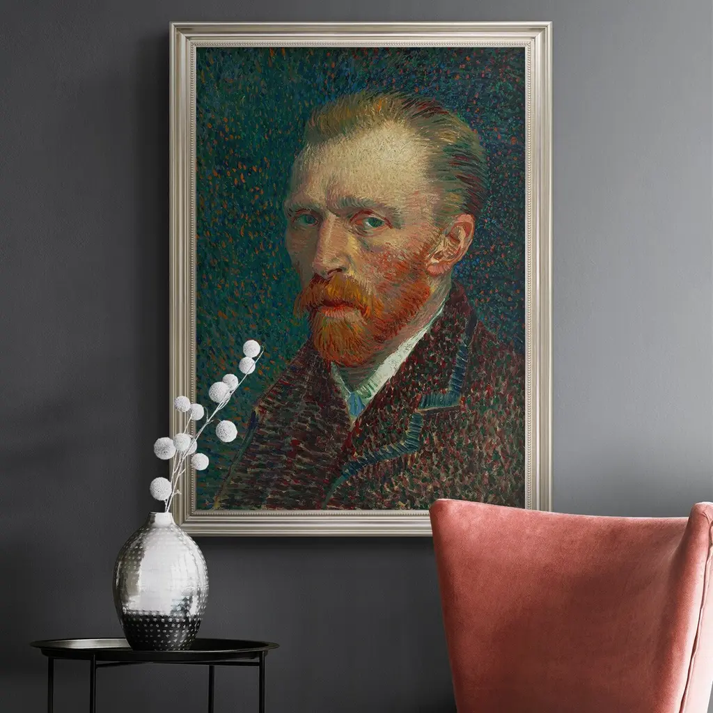 Van Gogh self-portrait Premium Framed Canvas- Ready to Hang A Premium Framed Canvas created to last. Framed in distressed wood and available in an array of sizes and colors Featuring a beveled a solid wood stretcher bar, each piece comes ready to hand 3 SIZES AVAILABLE 16''X20'' - Overall Size 18'X27'' - Overall Size 24''x36'' - Overall Size Each piece is made to order. Each piece comes with hanging hardware. Made in the USA Ready to Hang Giclee Paper Print Acrylic Glass Beveled Matt Board
