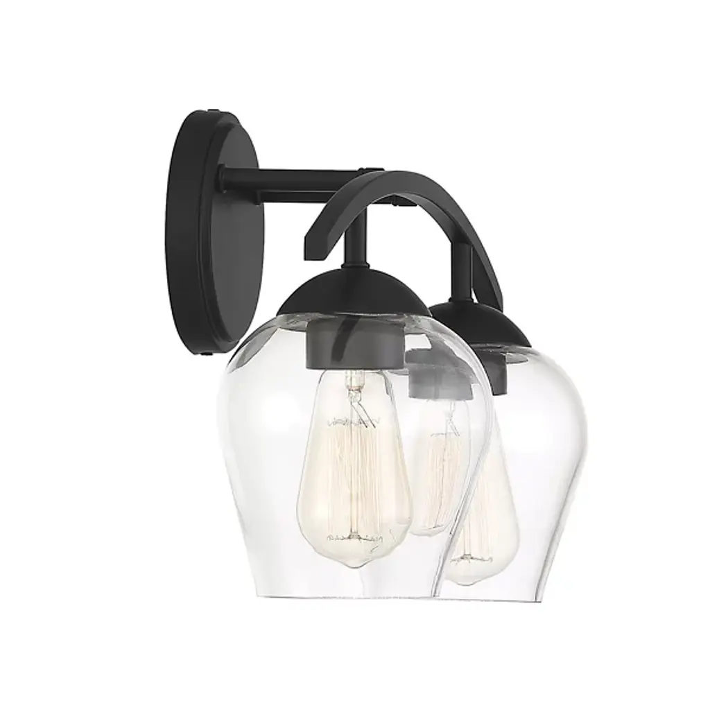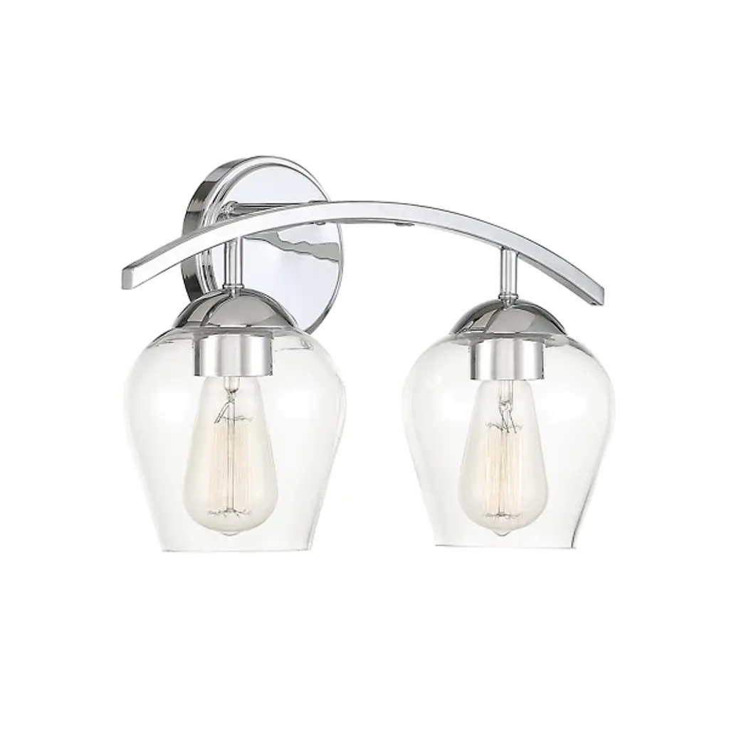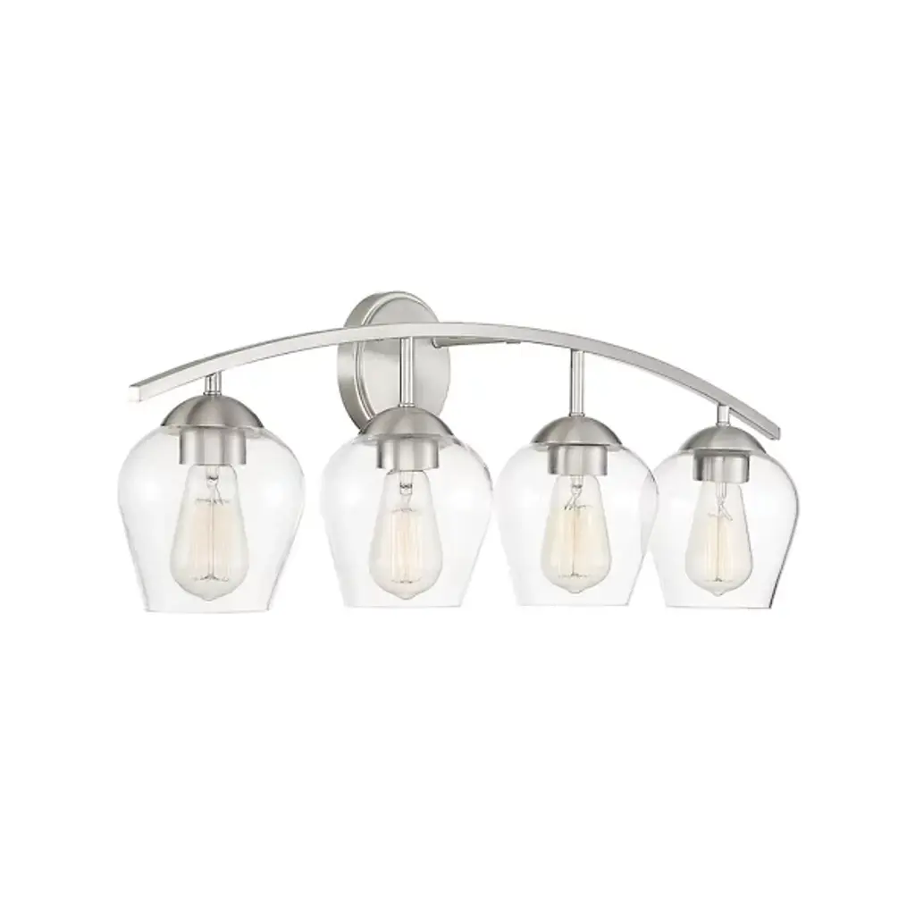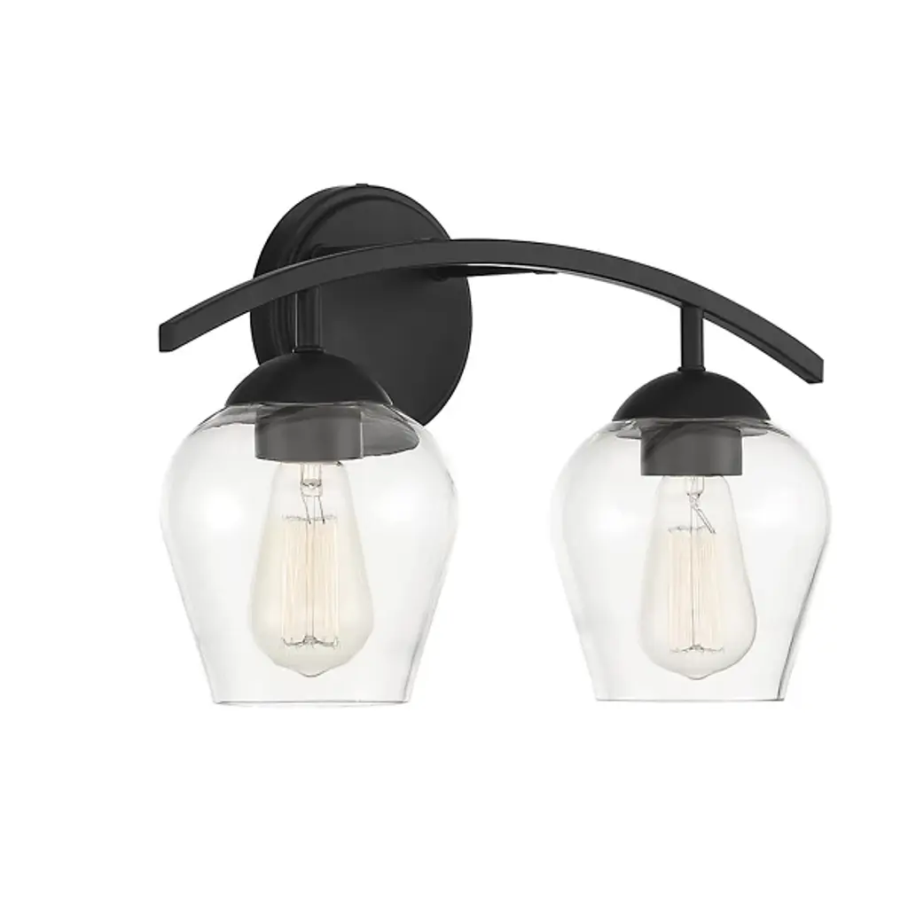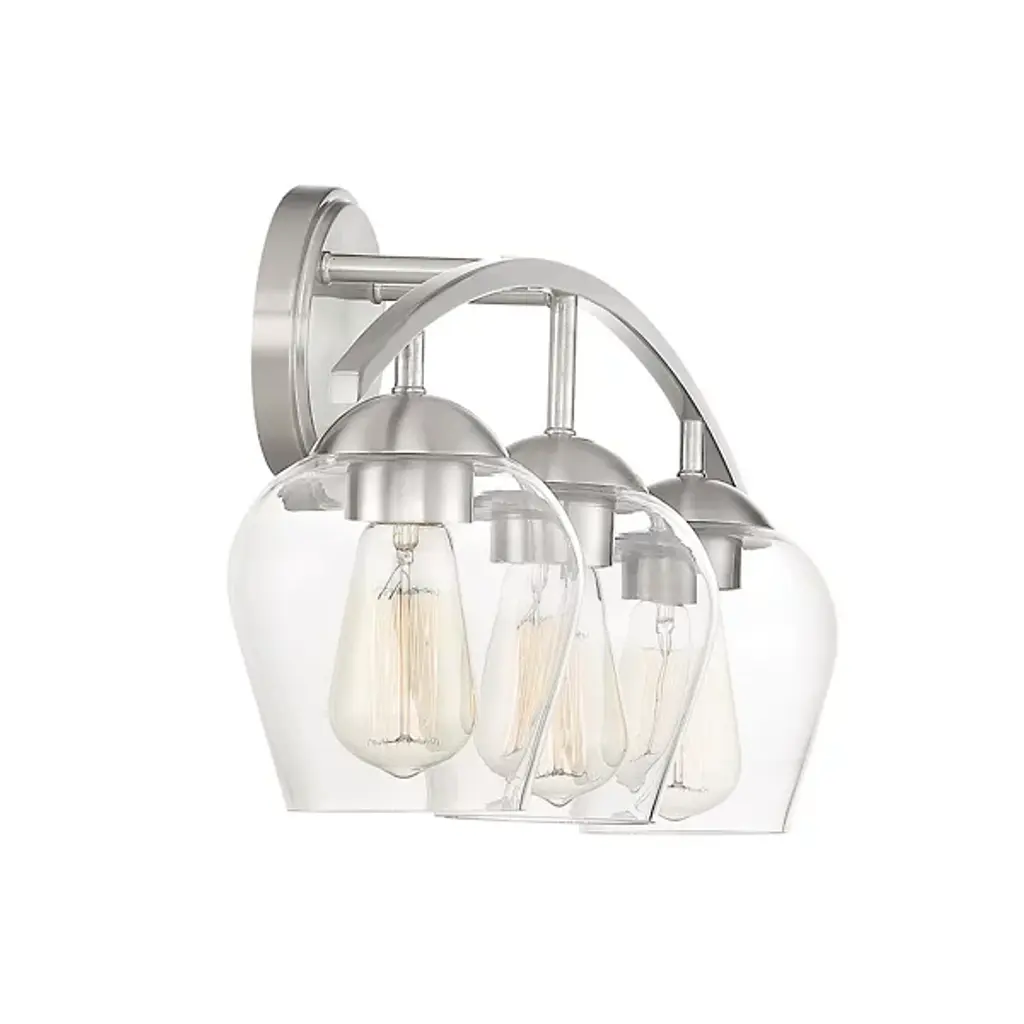A refined approach to the modern lighting, the Vanessa Vanity Light from Alder & Ore brings a welcoming layer of light to bathroom spaces. A rounded wallplate extends two brief arms that mount a gently curving metal bar. A set of clean, clear glass shades hang downward from the central bar, each containing a single bulb. An elegant and tasteful glow emits from each bulb, spreading a lovely even layer of light through the room.