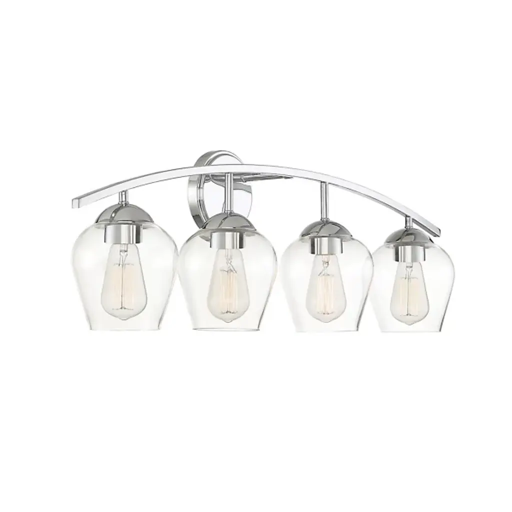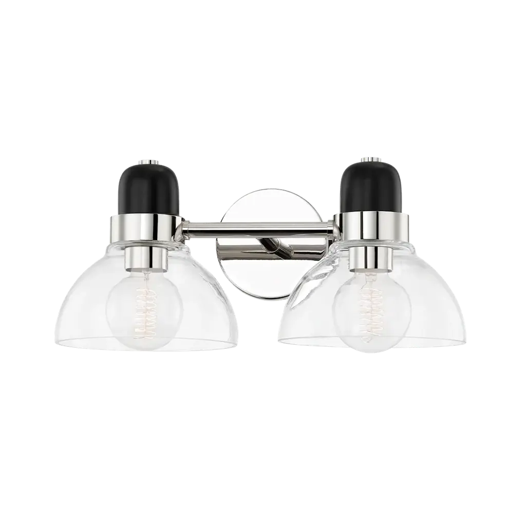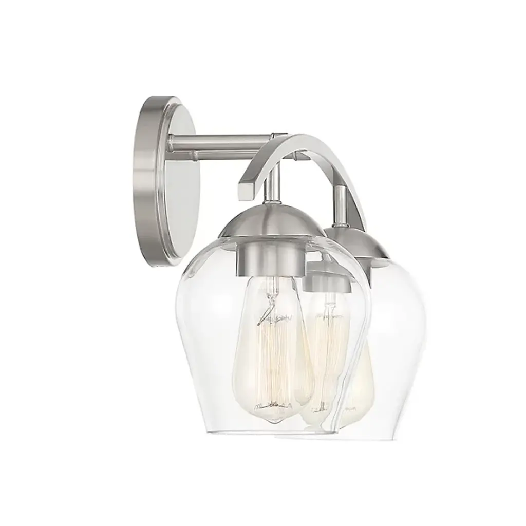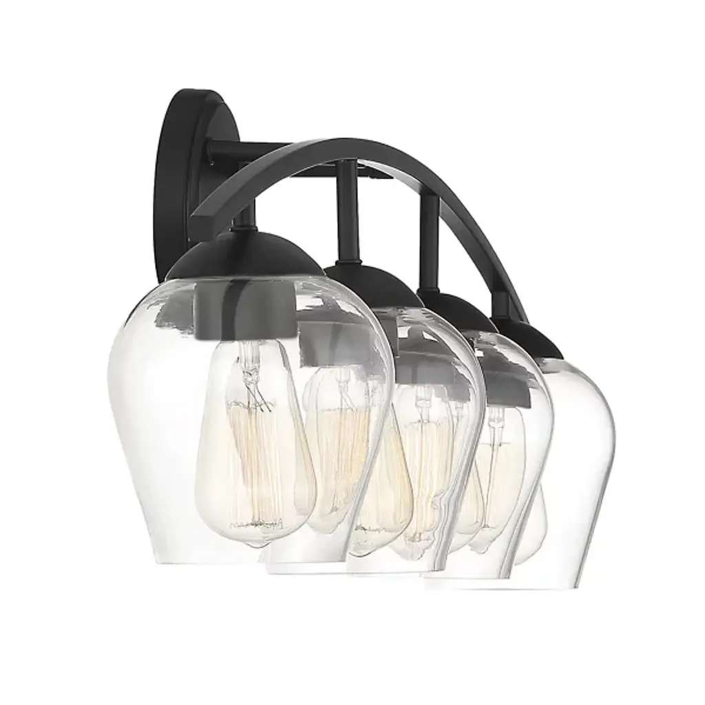 A refined approach to the modern lighting, the Vanessa Vanity Light from Alder & Ore brings a welcoming layer of light to bathroom spaces. A rounded wallplate extends two brief arms that mount a gently curving metal bar. A set of clean, clear glass shades hang downward from the central bar, each containing a single bulb. An elegant and tasteful glow emits from each bulb, spreading a lovely even layer of light through the room.