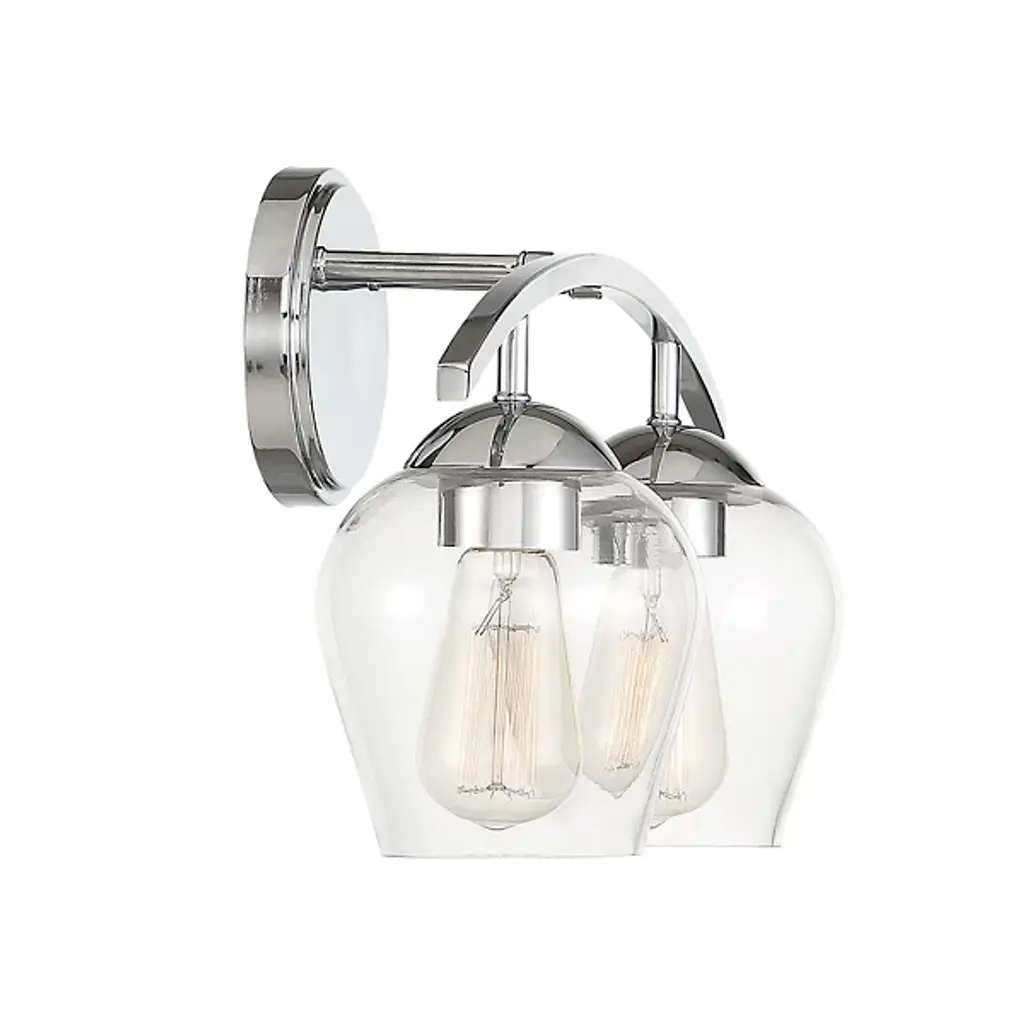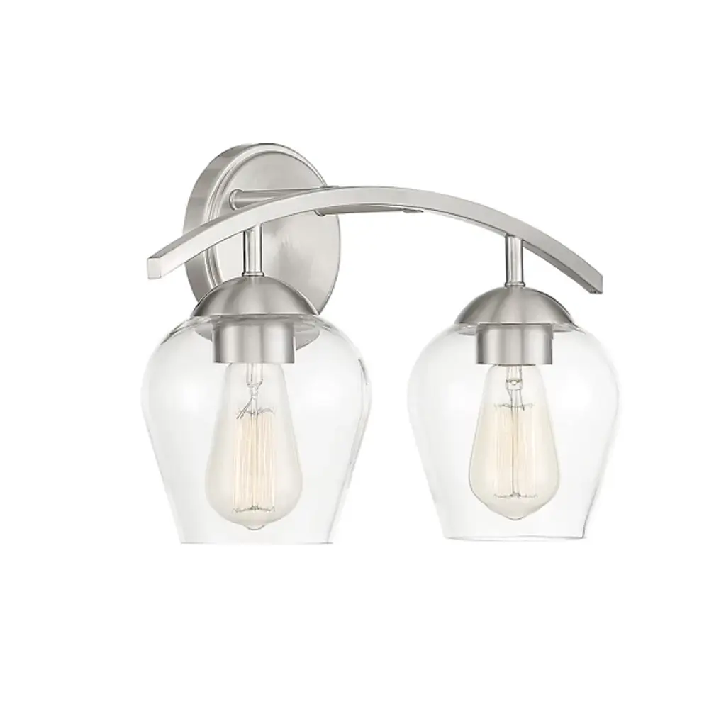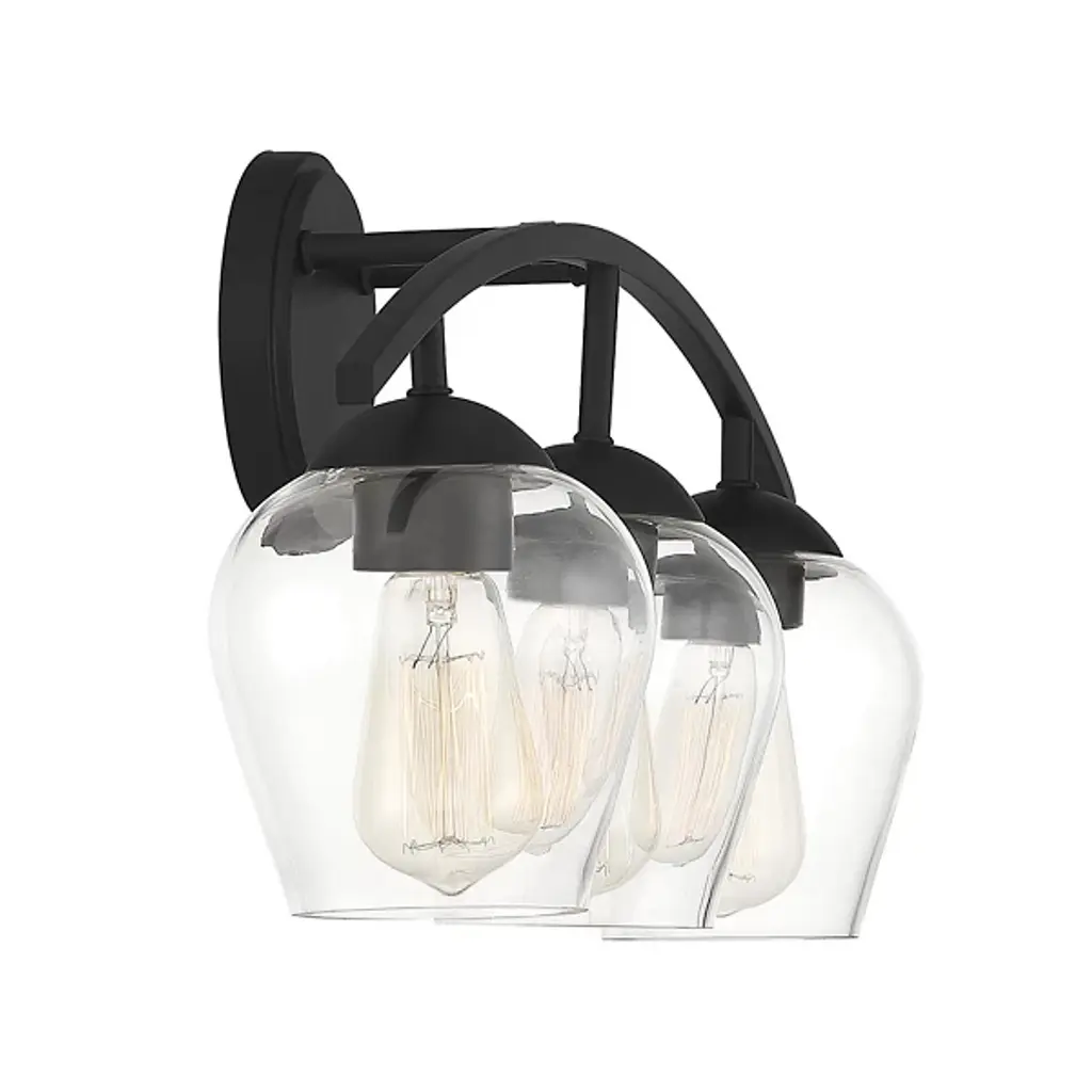 A refined approach to the modern lighting, the Vanessa Vanity Light from Alder & Ore brings a welcoming layer of light to bathroom spaces. A rounded wallplate extends two brief arms that mount a gently curving metal bar. A set of clean, clear glass shades hang downward from the central bar, each containing a single bulb. An elegant and tasteful glow emits from each bulb, spreading a lovely even layer of light through the room.