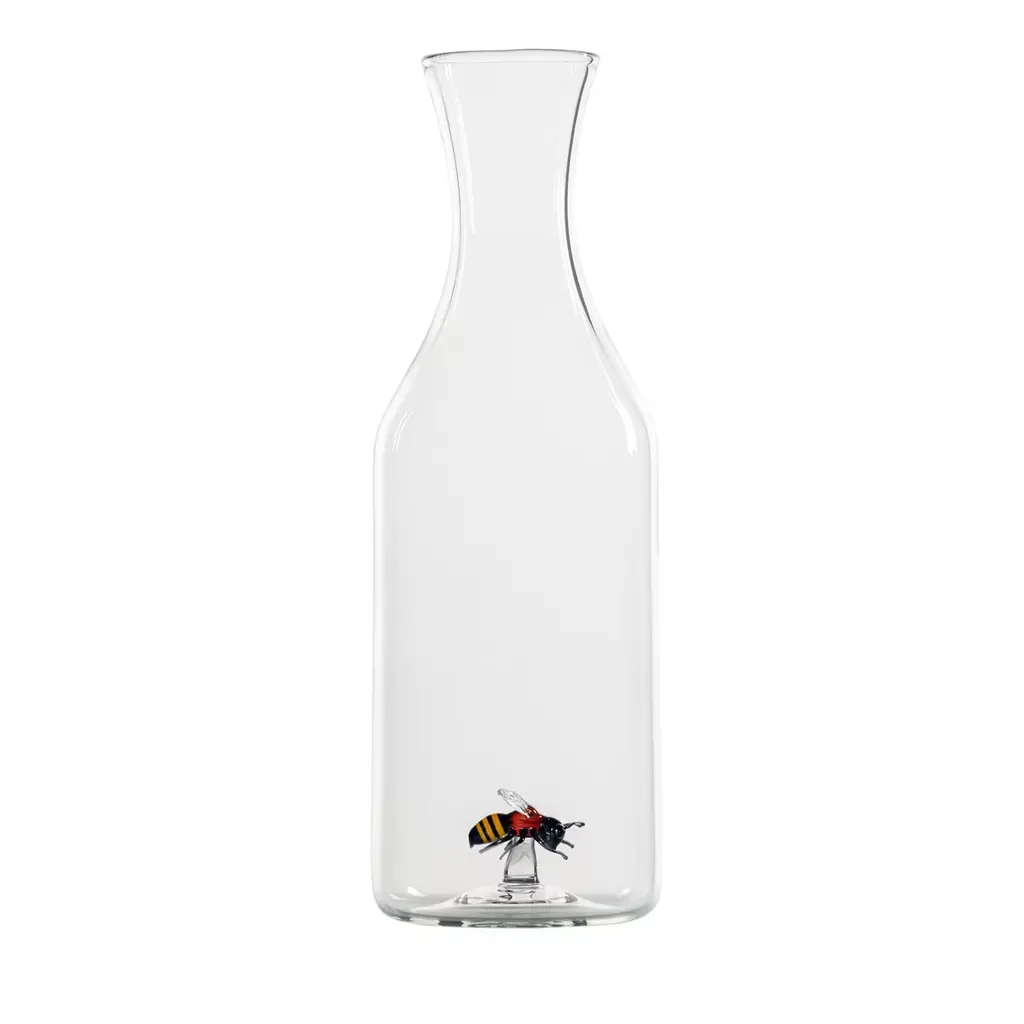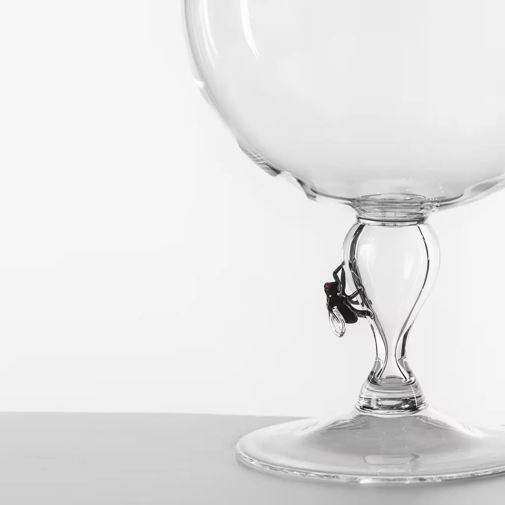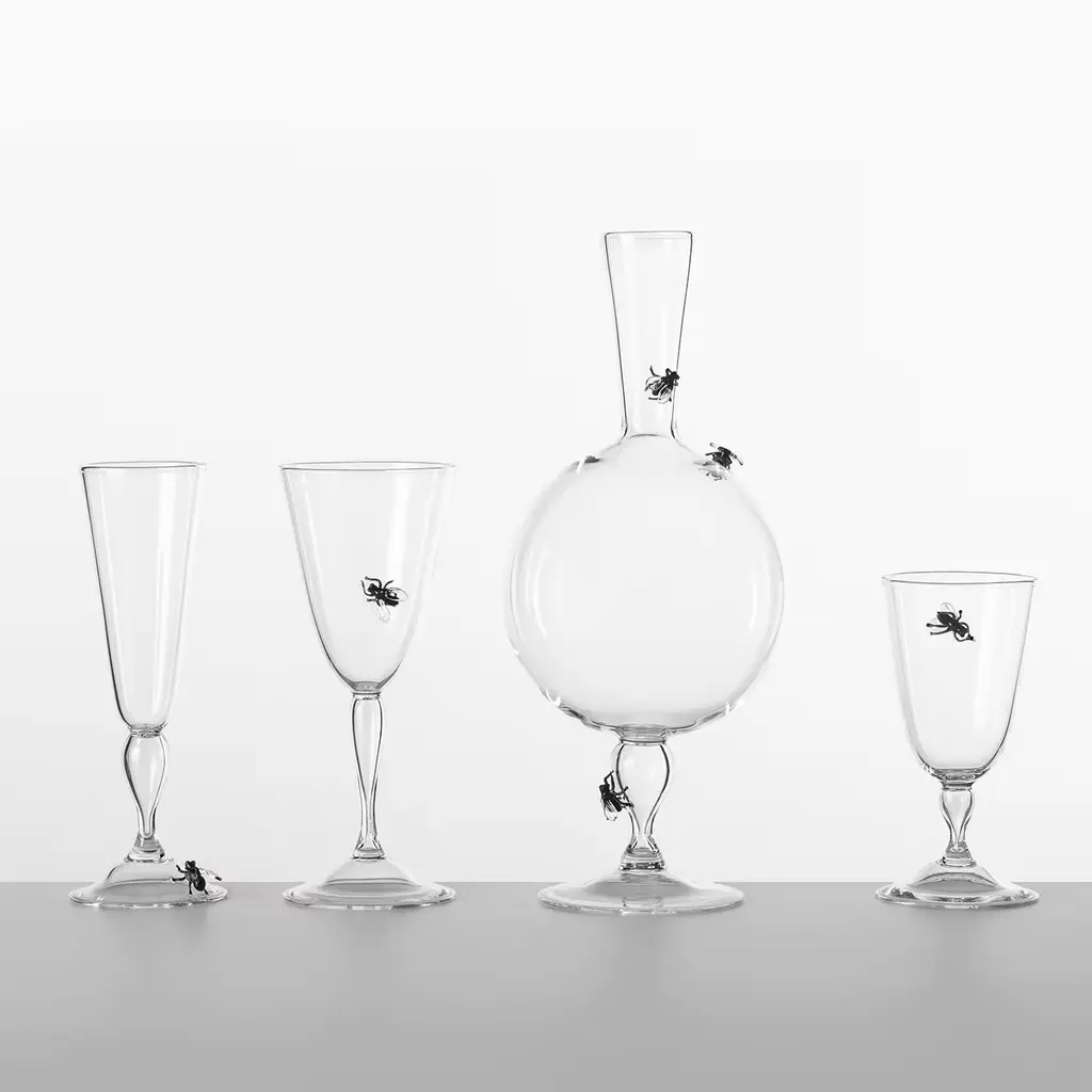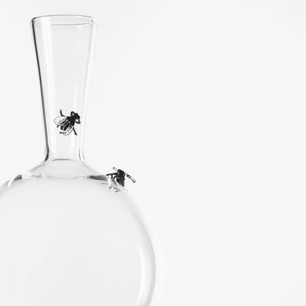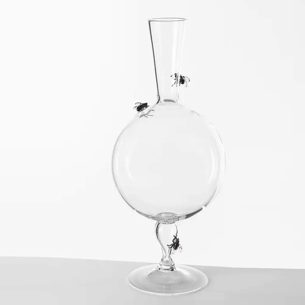An exquisite combination of contemporary art and design with traditional craftsmanship, this decanter is part of a collection of glassware inspired by XVII century still life paintings. Handcrafted of glass, its sinuous and bulging silhouette is enriched with small decorative flies also made of glass and attached to the clear surface.