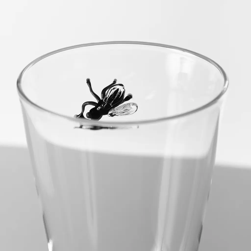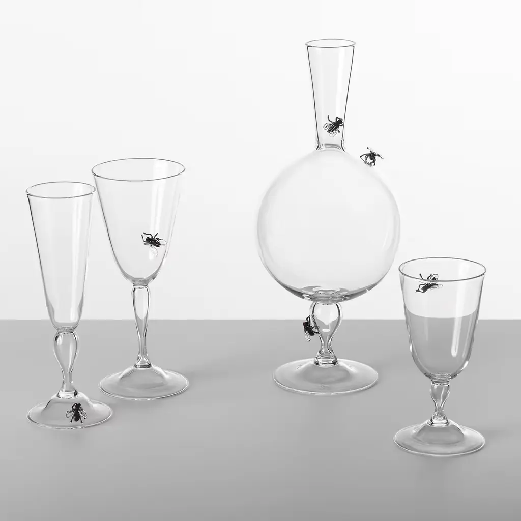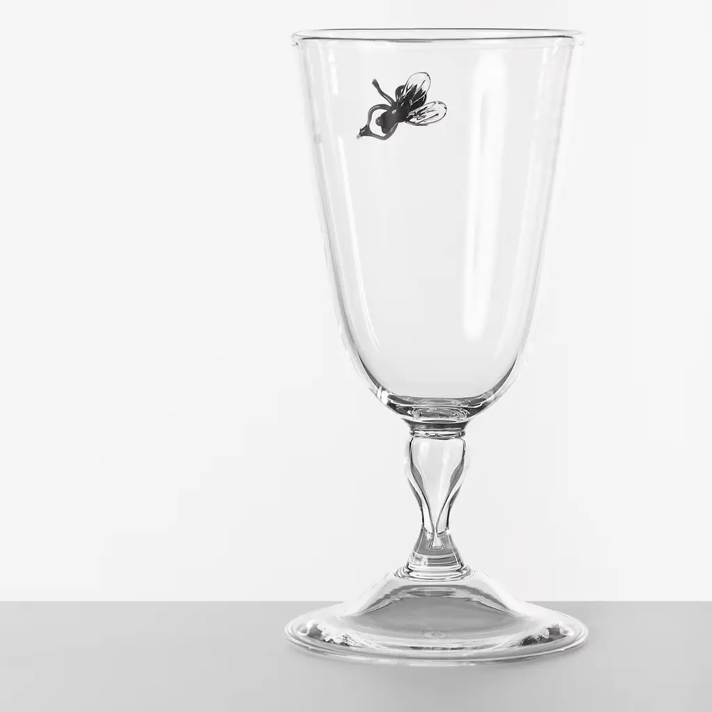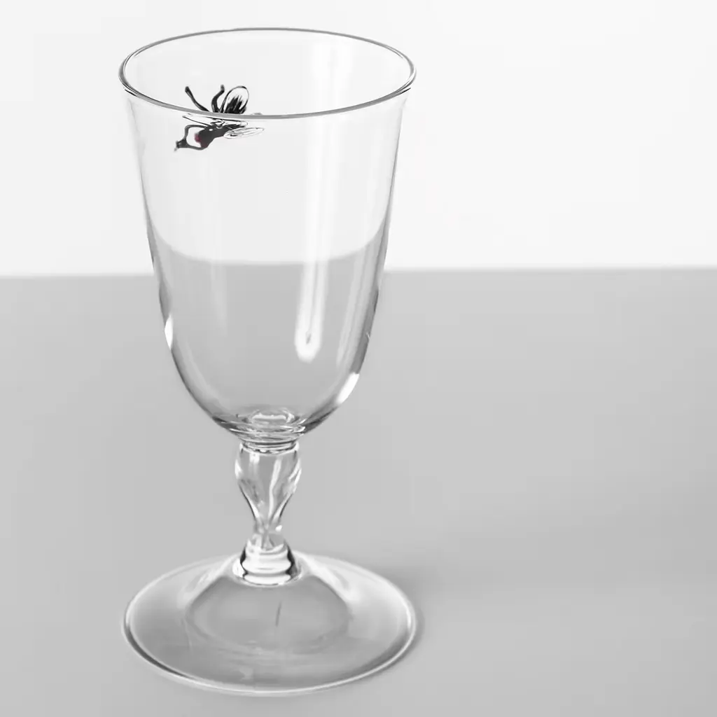 Marked by a capacious bowl with flared rims and a short and sinuous stem, this stunning drinking glass is adorned with a small decorative fly also handcrafted of glass. Part of a series of glassware inspired by XVII century still life paintings, the fly is symbolic for the connection between living things and still life.