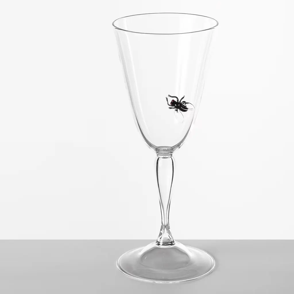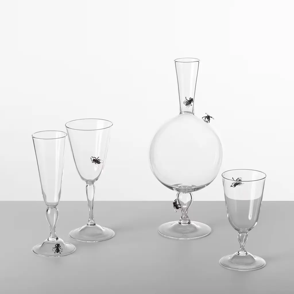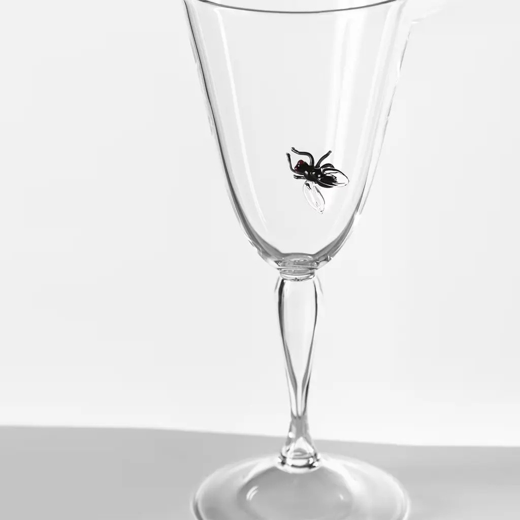 This exquisite wine glass is composed of a delicate round base, a long and refined stem, and a clear bowl with slightly flared rims. Handcrafted of glass, it is part of a series of glassware inspired by XVII century still life paintings, and is adorned with a small glass fly symbolizing the harmonious coexistence of art and life.