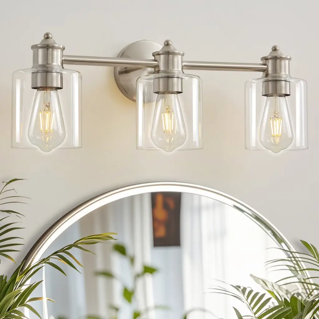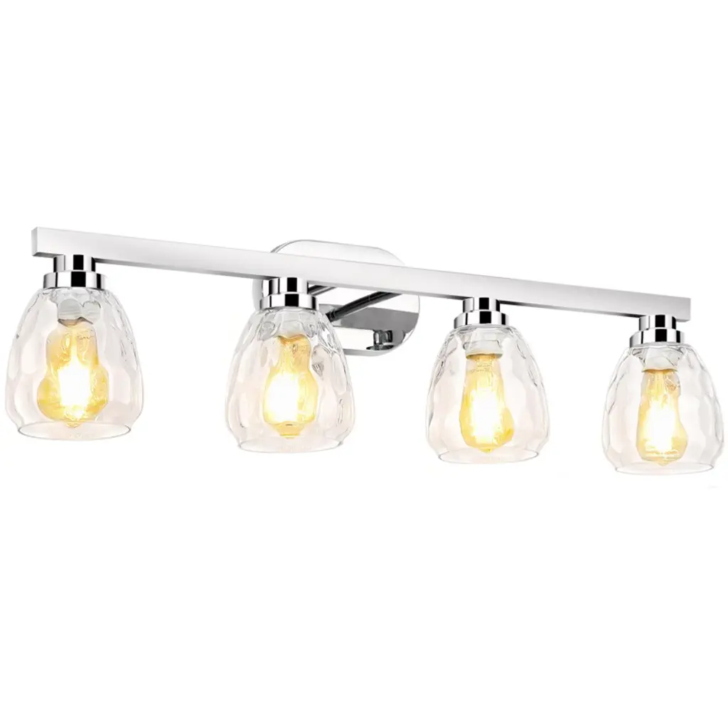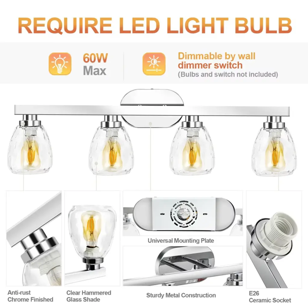 ? Clear Hammered Glass Shade for Timeless Elegance?The clear hammered glass shade of this vanity light fixture brings a luxurious, high-end texture to any space. Its unique textured surface scatters light gently, creating a warm and inviting ambiance. Whether your decor leans minimalist, modern, vintage, rural farmhouse, or industrial, this versatile shade seamlessly blends in, elevating the elegance of bathrooms, vanities, and beyond.?? Sturdy 5-Light Chrome Construction?Built with durable chrome steel, this 5-light bathroom fixture is designed to last. It features a geometric oval backplate, sleek chrome-finished sconce arms, and robust bulb sockets that work together to enhance both lighting and decor. The chrome finish adds a polished touch, ensuring it remains a stylish focal point in your home for years.?? Versatile Chrome Wall Sconce with Flexible Mounting?This wall-mounted bathroom light offers the convenience of being installed in either up or down positions, letting you adapt it to your space¡¯s needs. Crafted from premium iron with a bright chrome finish, it¡¯s breakage-proof and rust-resistant, maintaining its sleek look through daily use. It adds a subtle charm to any room, from bathrooms to hallways.?? E26 Standard Sockets for Customizable Lighting?Equipped with E26 US standard sockets, this fixture supports LED, CFL, or other bulbs up to 60W (bulbs not included). For adjustable brightness, pair it with dimmable bulbs and a compatible dimmer switch (not included) to create the perfect ambiance for any occasion, from bright morning routines to soft evening relaxation.?? Easy Installation & Wide-Ranging Use?With simple installation steps, this modern light fixture is easy to set up. It¡¯s not just for bathrooms¡ªuse it in vanities, makeup rooms, mirror cabinets, dressing tables, kitchens, bedrooms, living rooms, studies, or foyers. Its adaptability makes it a practical and stylish lighting solution for multiple areas of your home.