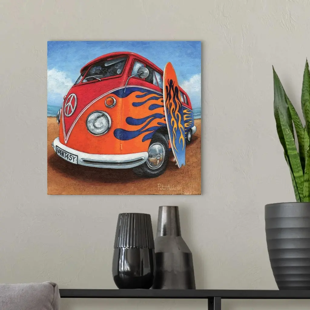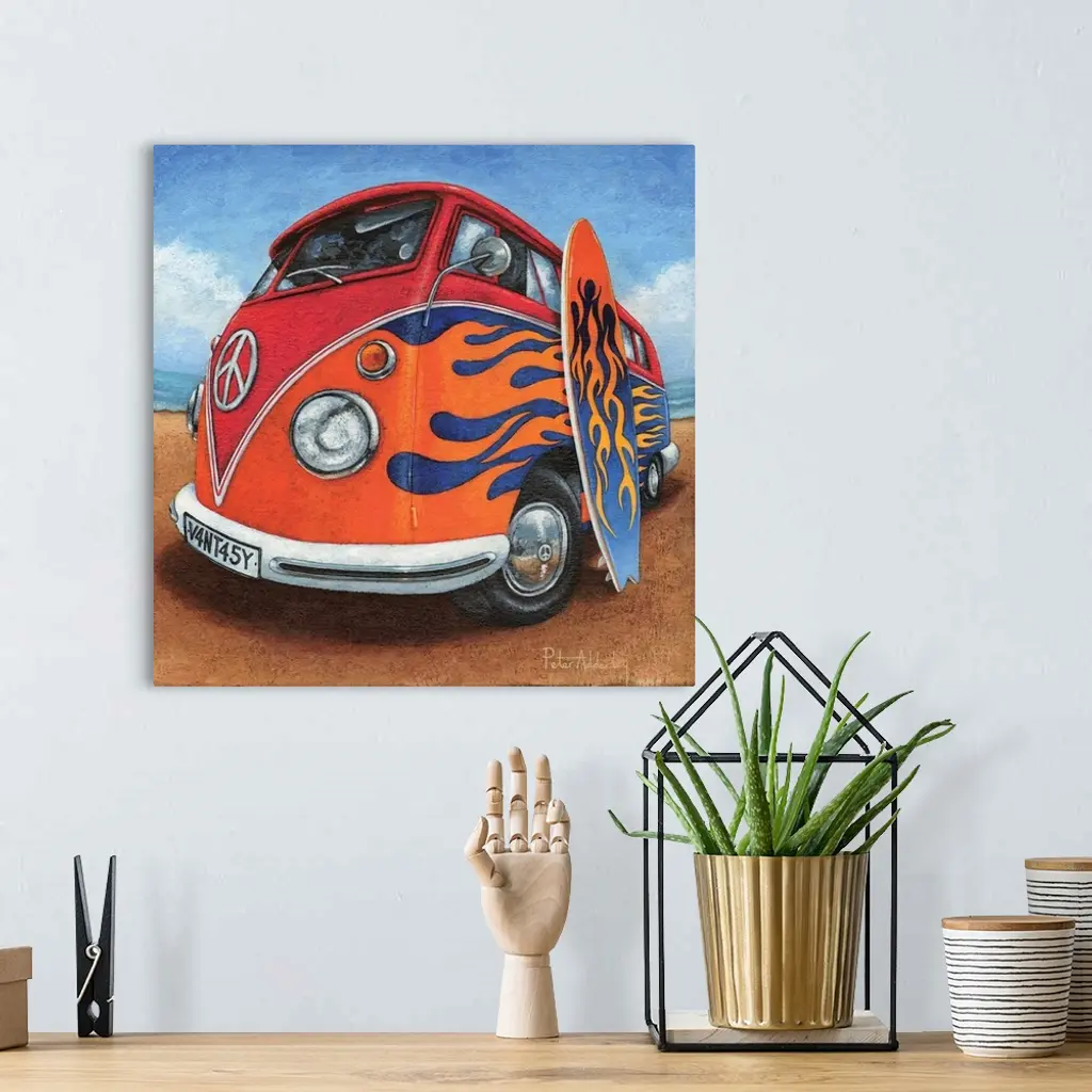 Contemporary painting of a retro VW bus with bright red flames painted on the side, with a surfboard leaning against it.