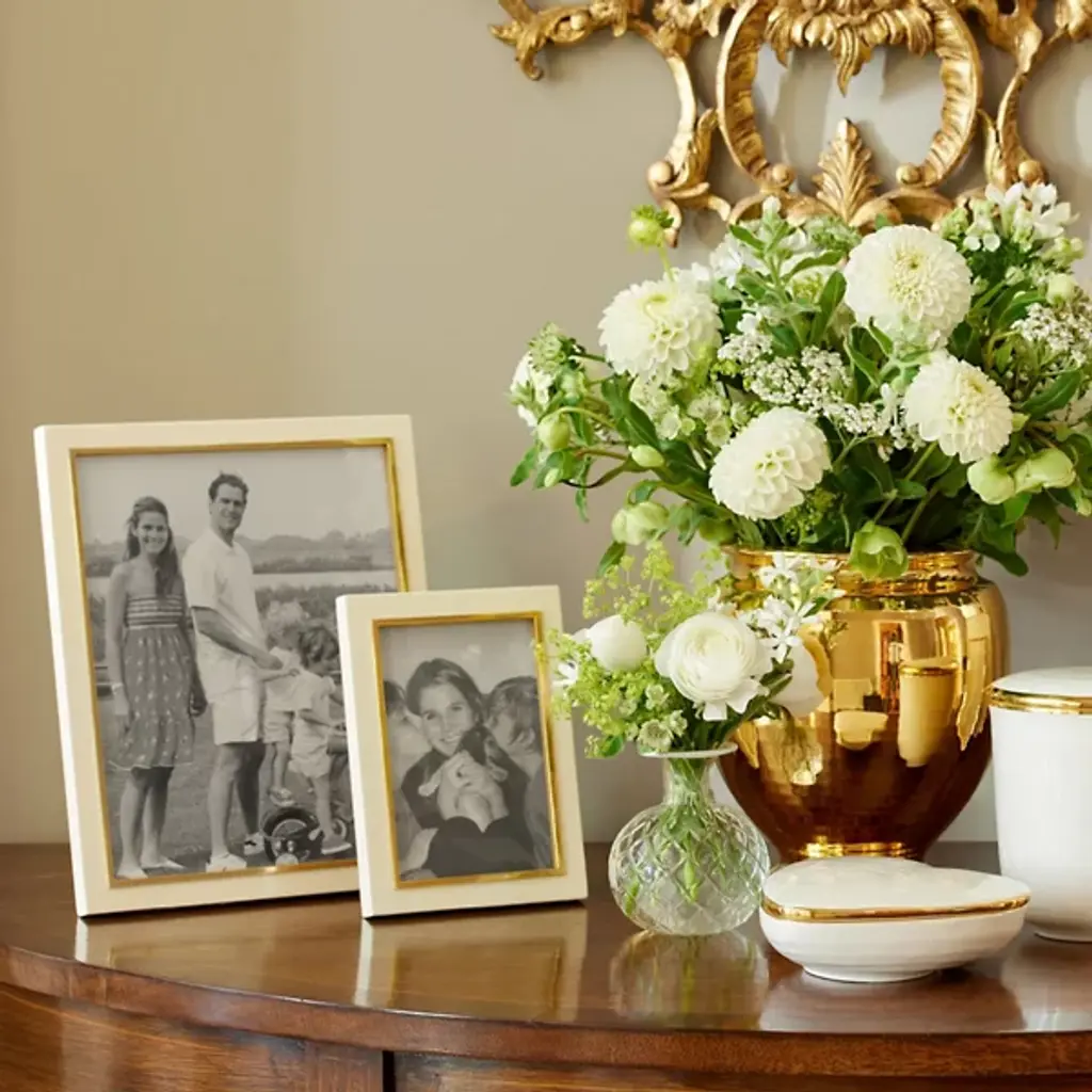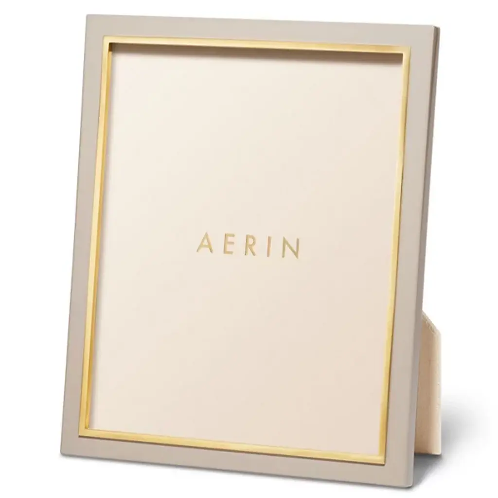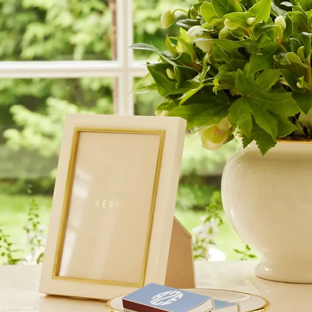 The Varda Lacquer Photo Frame from AERIN features a slim profile that keeps the focus on the photograph while providing a polished border. The lacquer finish creates a smooth, reflective surface that contrasts with the brass detailing around the photo opening. This frame's minimal design makes it suitable for both family photos and small artwork, while the lacquer construction ensures durability for regular handling. The brass accents provide a subtle metallic touch without overwhelming the frame's streamlined appearance. Each frame includes an integrated stand that keeps it upright on desks, shelves, or bedside tables.