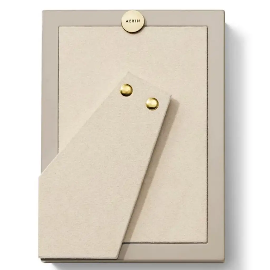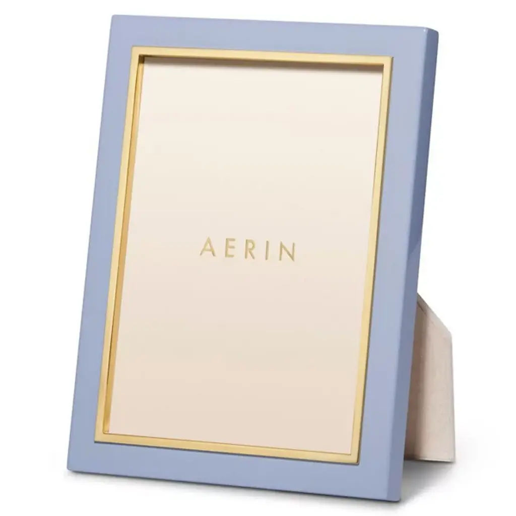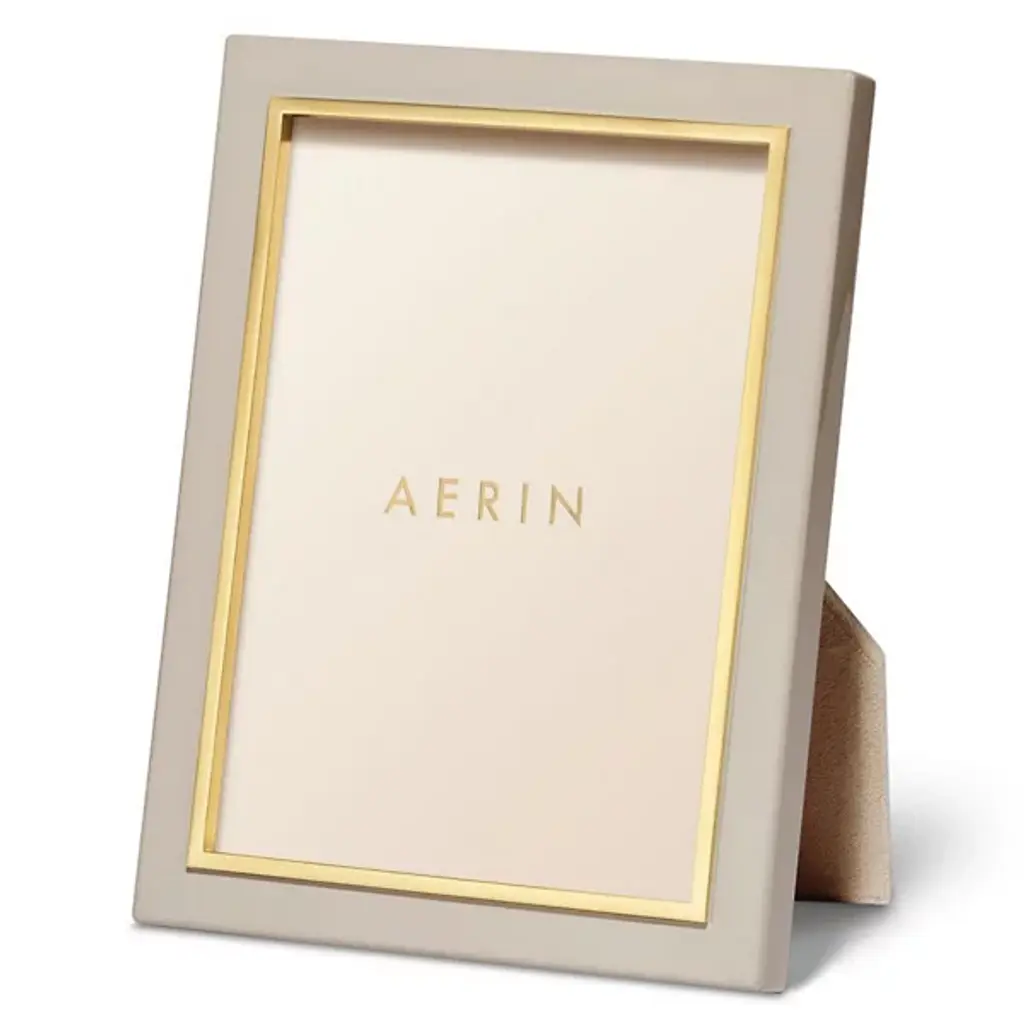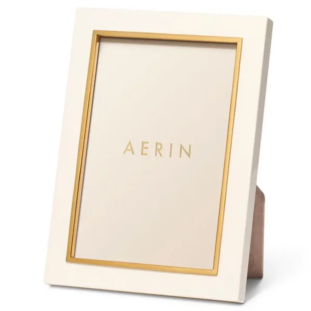 The Varda Lacquer Photo Frame from AERIN features a slim profile that keeps the focus on the photograph while providing a polished border. The lacquer finish creates a smooth, reflective surface that contrasts with the brass detailing around the photo opening. This frame's minimal design makes it suitable for both family photos and small artwork, while the lacquer construction ensures durability for regular handling. The brass accents provide a subtle metallic touch without overwhelming the frame's streamlined appearance. Each frame includes an integrated stand that keeps it upright on desks, shelves, or bedside tables.