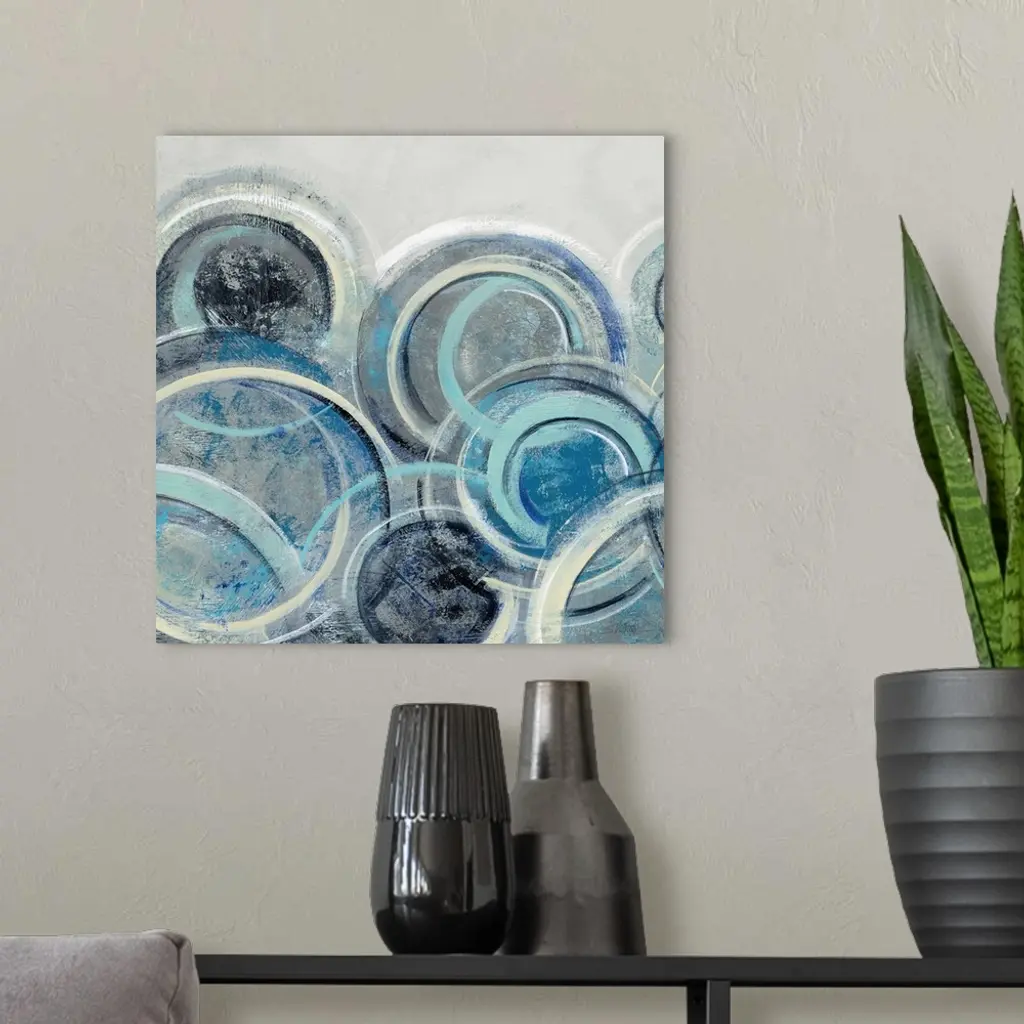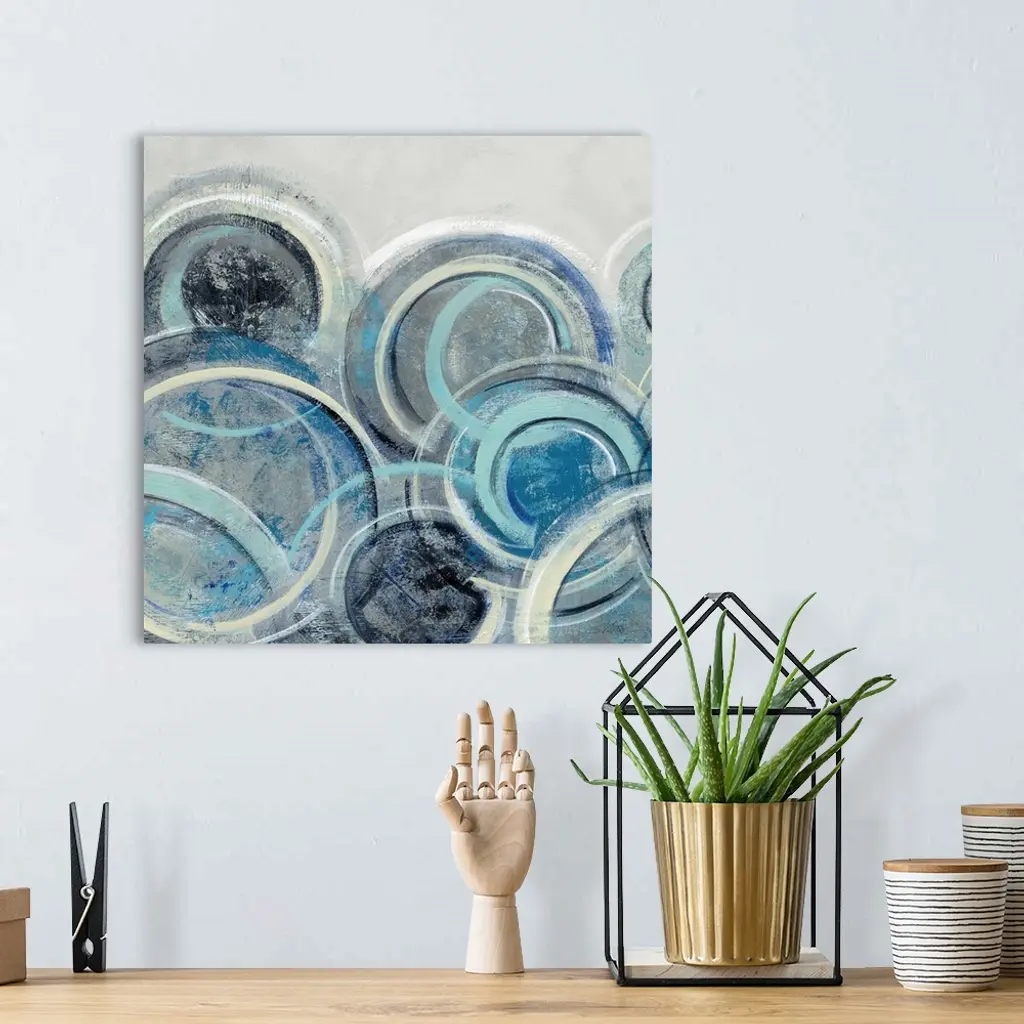Abstract painting with circular shapes layered on top of each other in shades of blue with some yellow on a grey, square background.