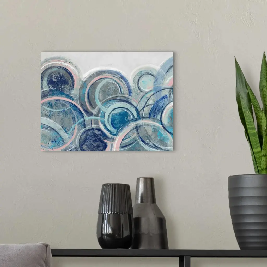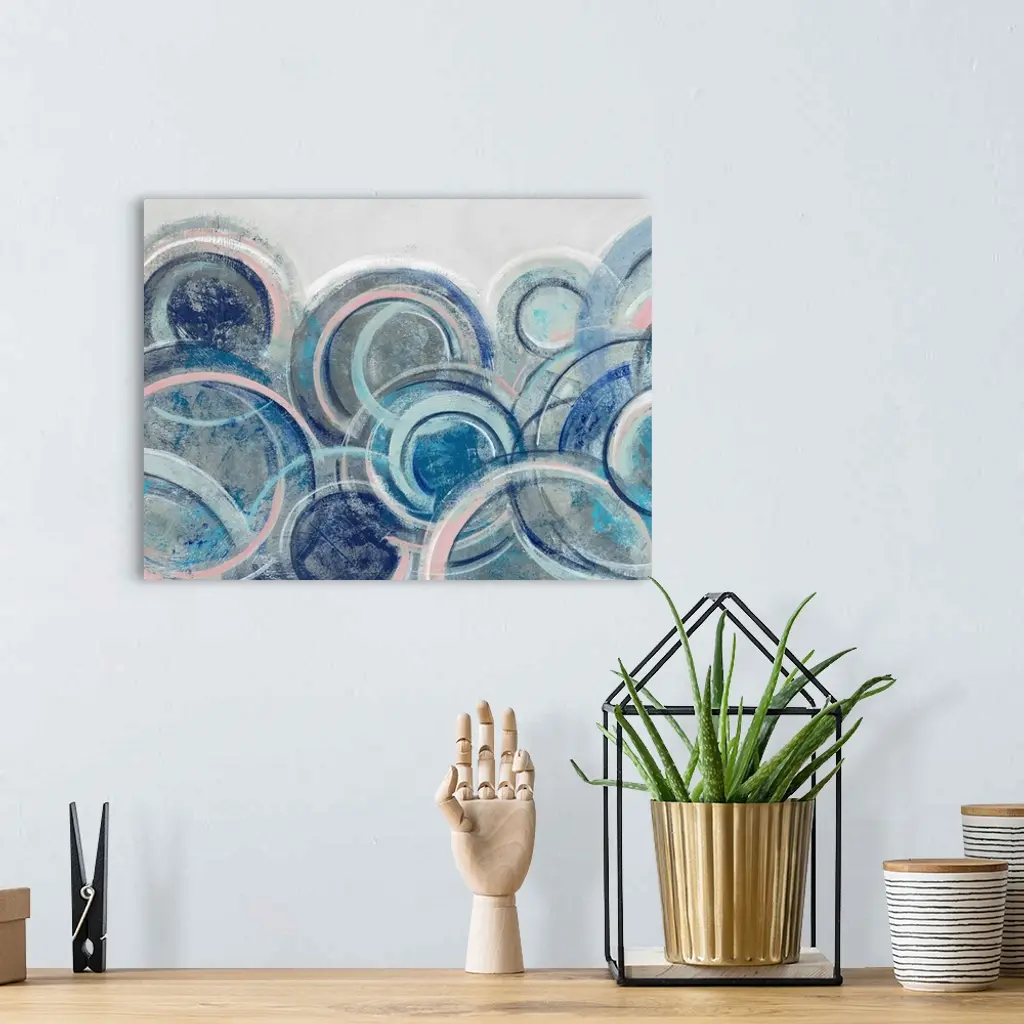 Contemporary abstract artwork featuring an array of blue circles over a light gray background.