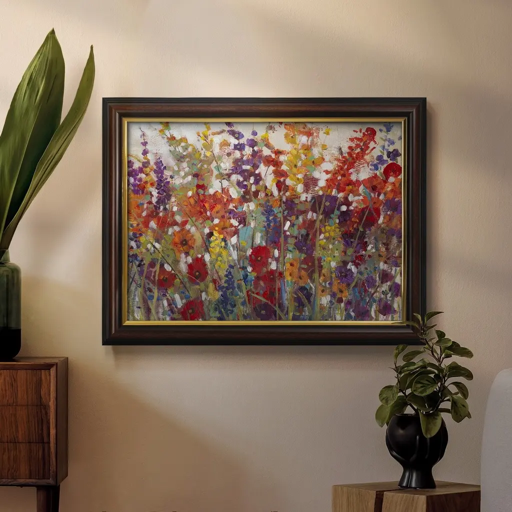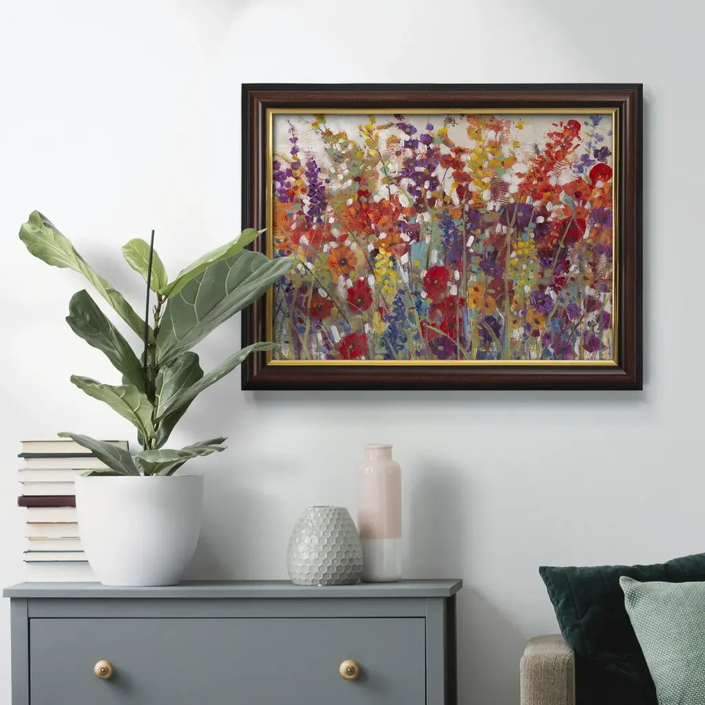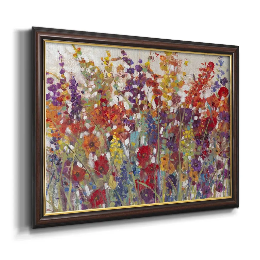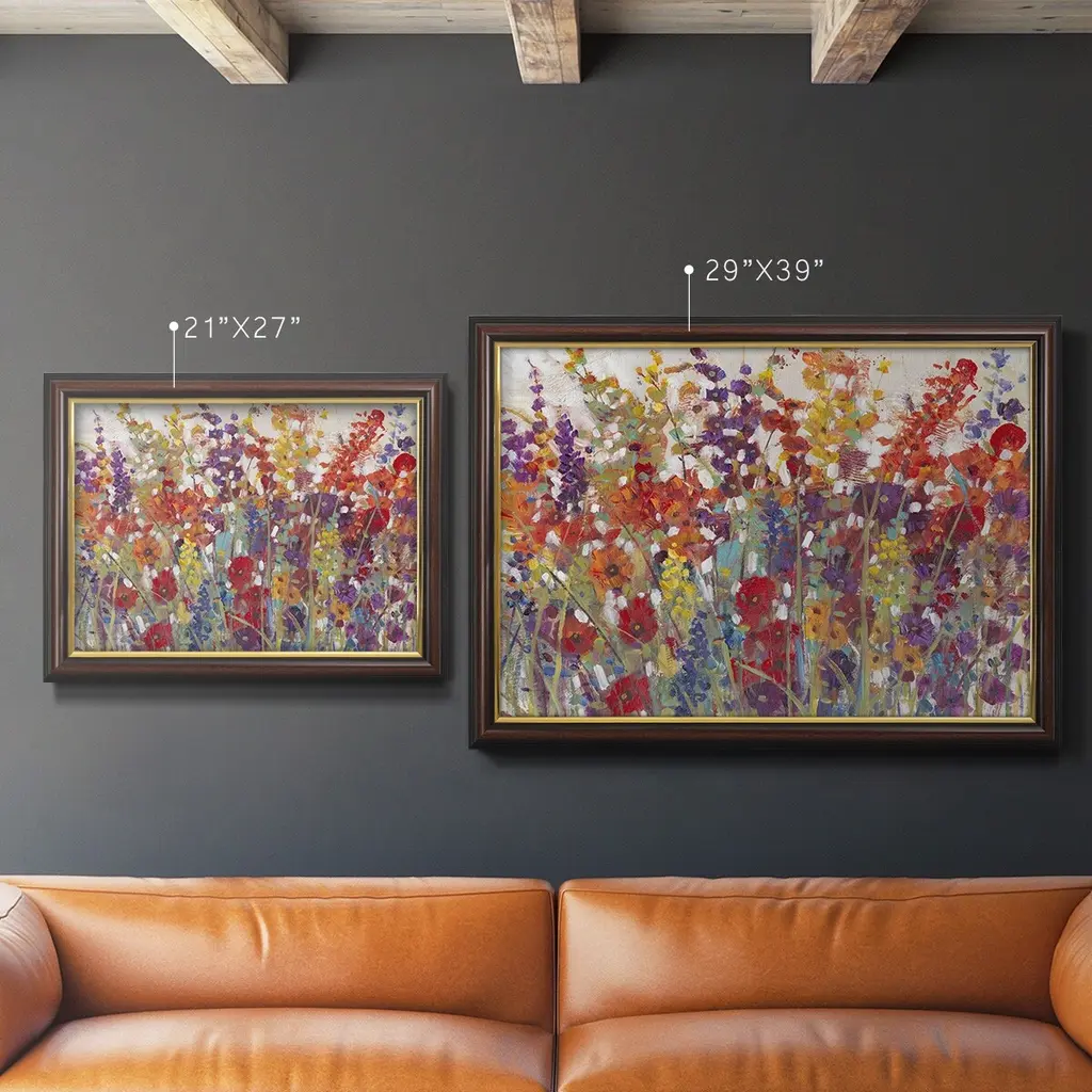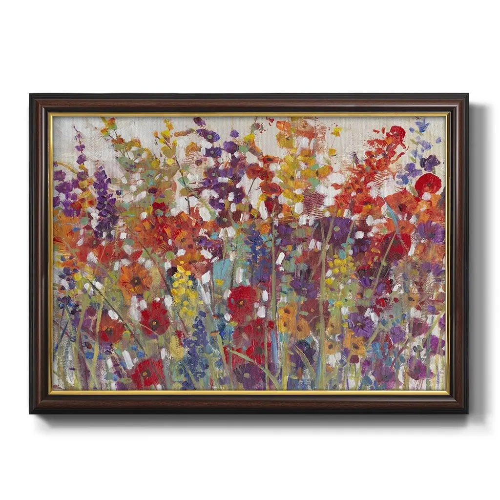 Variety of Flowers II Premium Framed Canvas- Ready to Hang A Premium Framed Canvas created to last. Framed in distressed wood and available in an array of sizes and colors Featuring a beveled a solid wood stretcher bar, each piece comes ready to hand 3 SIZES AVAILABLE 16''X20'' - Overall Size 18'X27'' - Overall Size 24''x36'' - Overall Size Each piece is made to order. Each piece comes with hanging hardware. Made in the USA Ready to Hang Giclee Paper Print Acrylic Glass Beveled Matt Board