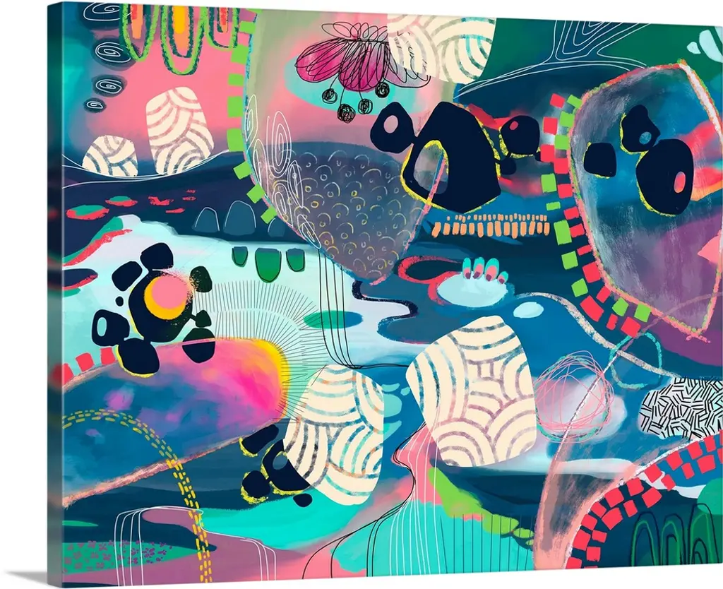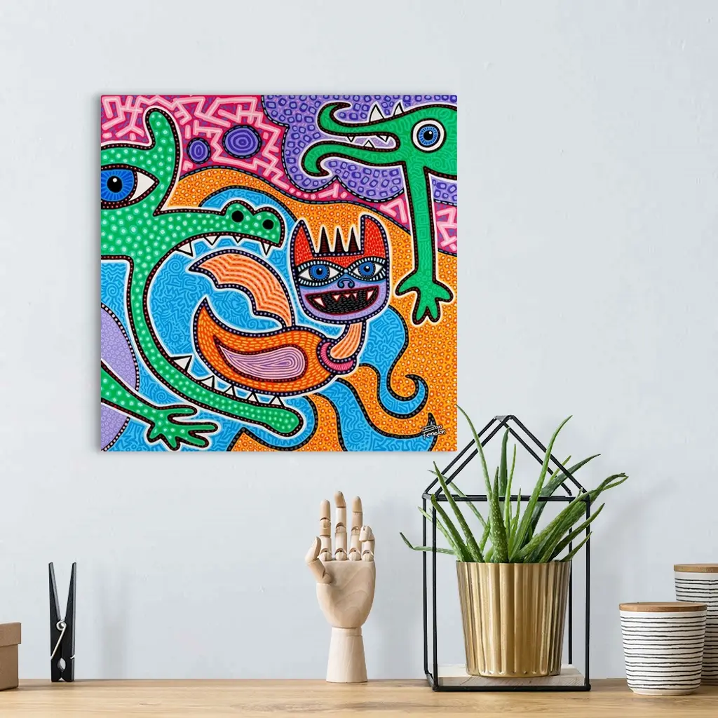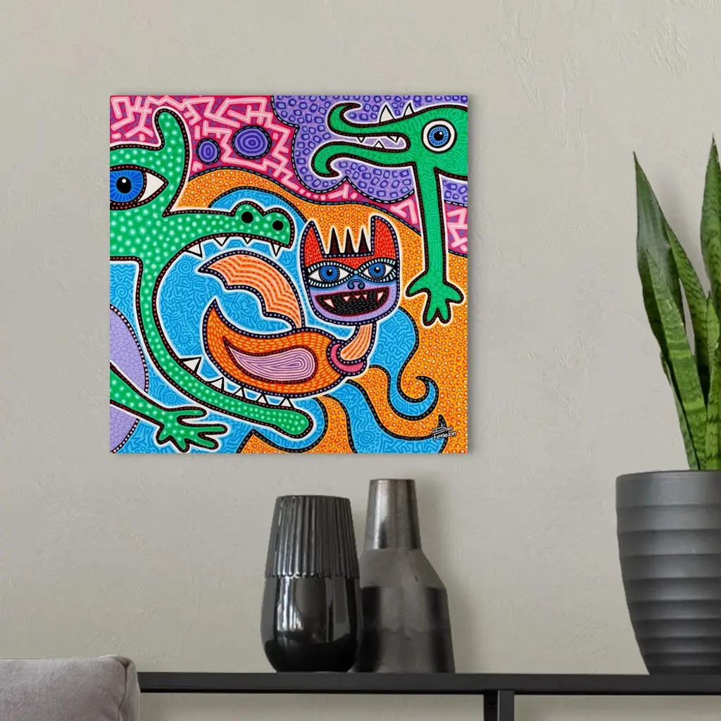 Contemporary aboriginal inspired artwork with bright colors and intricate detail.