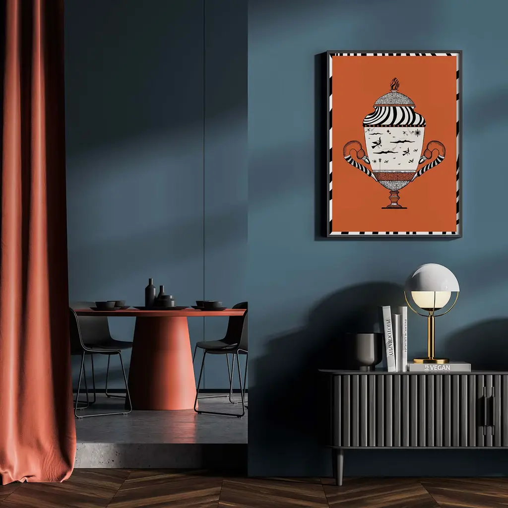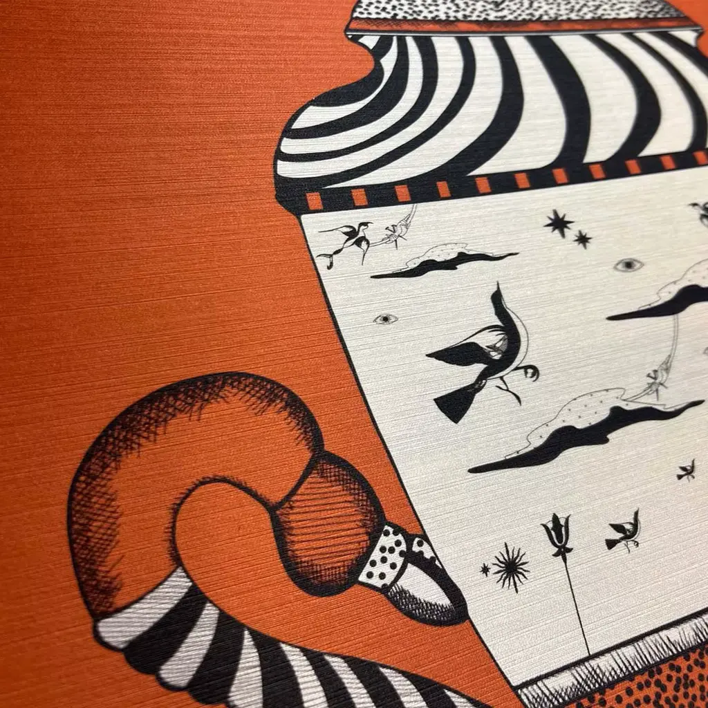 Numbered collectible print designed by Marika Tardio on 100% viscose textile. Each work is signed by the artist, numbered, and accompanied by a certificate of authenticity. The jar with a lid that contains all the charm and magic of mysterious traditions and cultures. Here interpreted with great attention to detail, according to the graphic style of the ink drawing. The drawing inside the vase features allegorical scenes of freedom. Limited Edition of 15 pieces. Made Exclusively for Artemest.