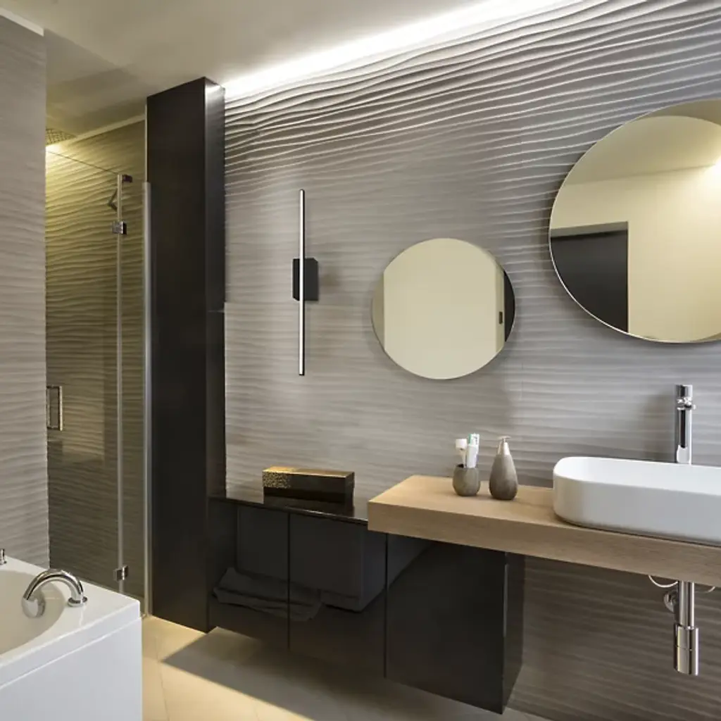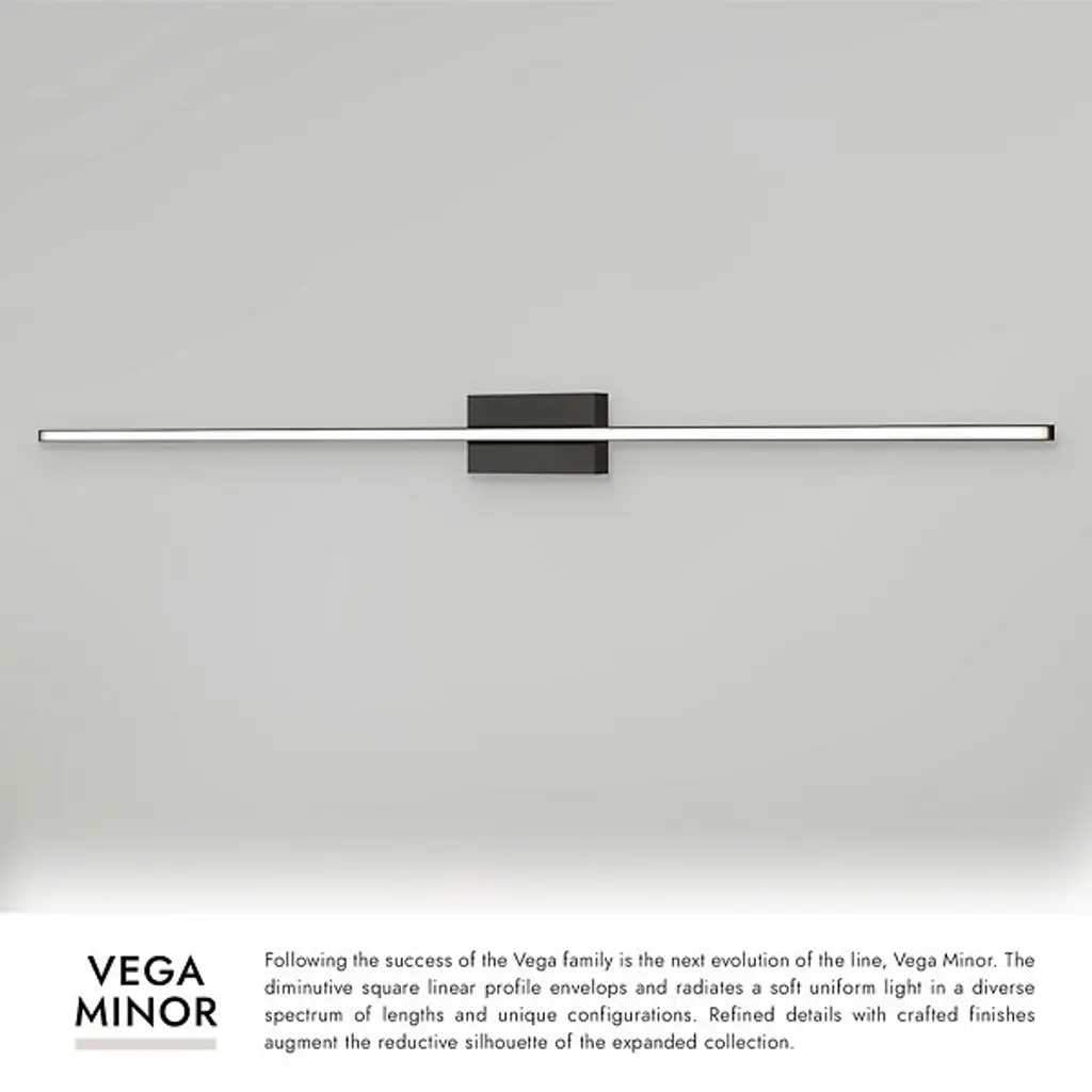 Good things come in small packages. The Vega Minor LED Outward Vanity Light from Kuzco Lighting though short packs a lighting punch with its long slender construction. At a glance, clean encompassing light produced by its LEDs almost magically flows out from its thin, sleek housing. Its rectangular mount reiterates the geometric tone of the piece while highlighting the finish of the aluminum. The piece is unique in that looks excellent horizontally atop your bathroom mirrors or vertically framing your figure with light.