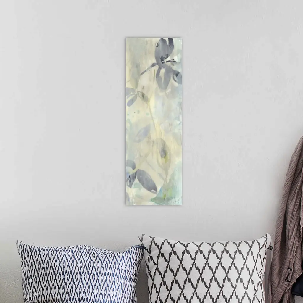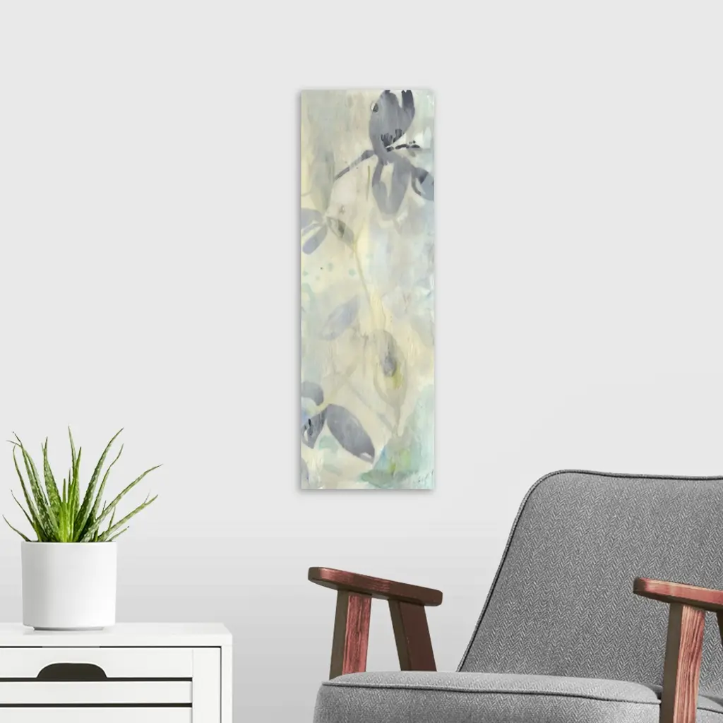 Contemporary abstract floral painting in neutral tans and grays.