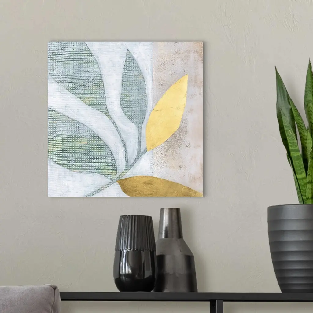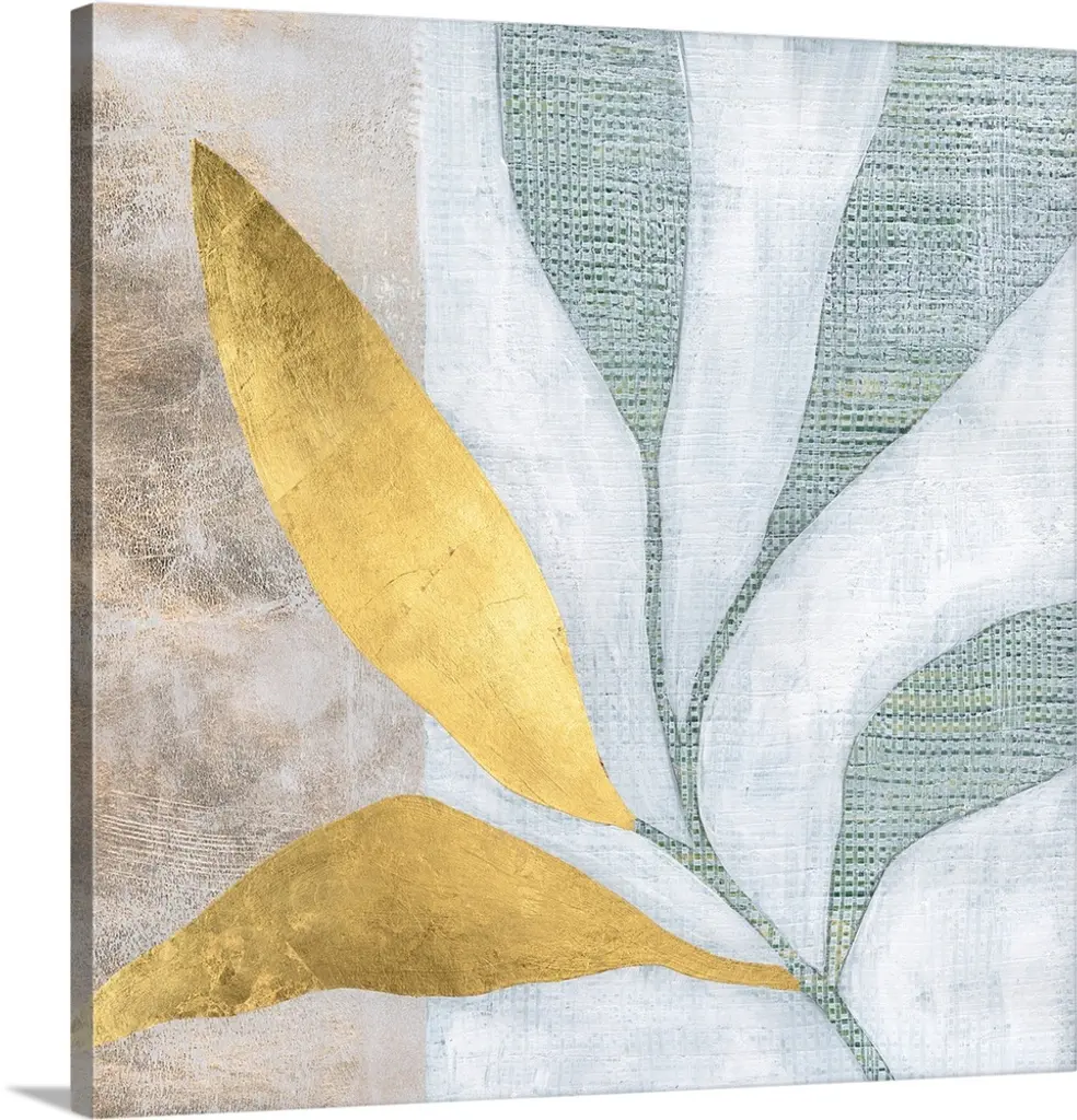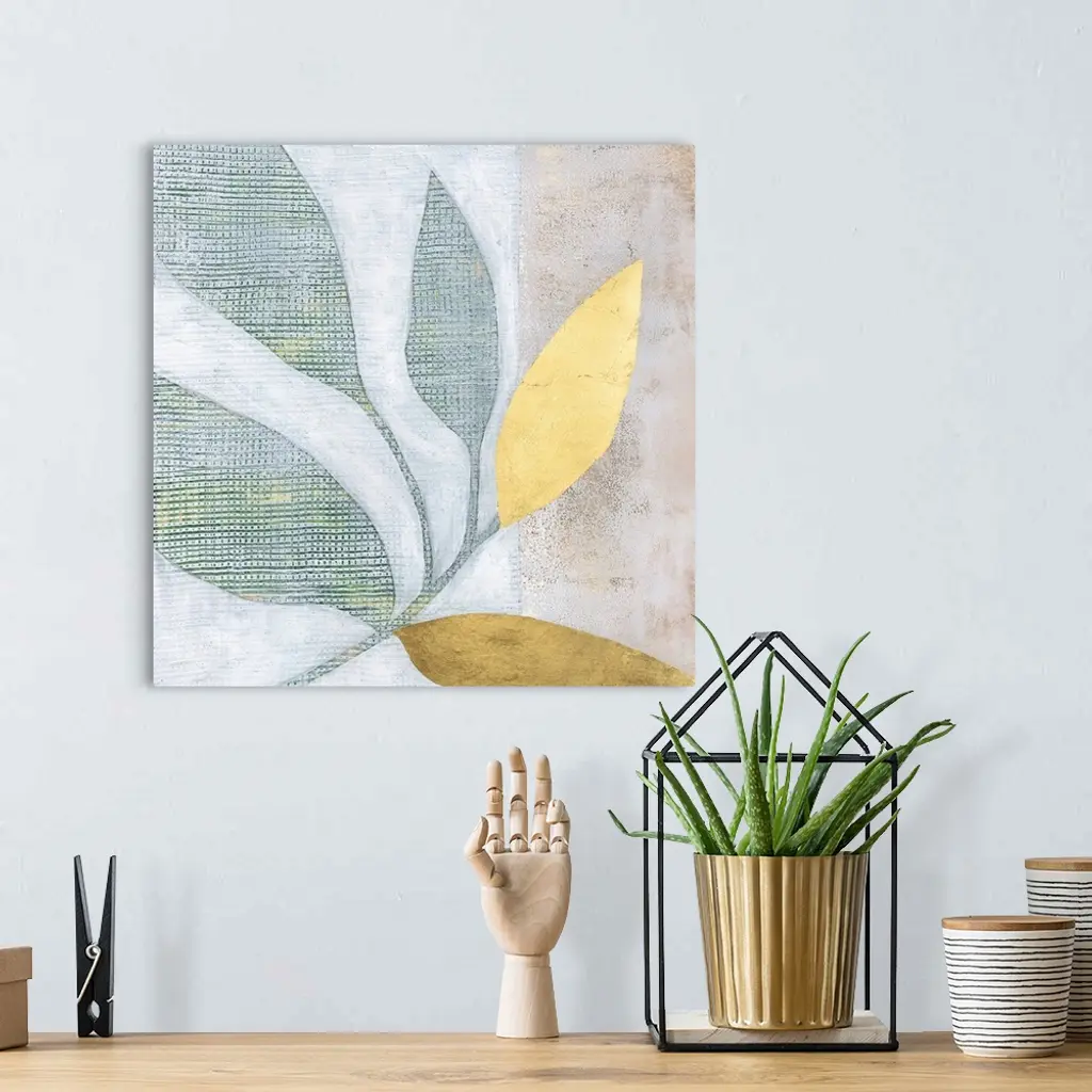 A contemporary, textured painting of green and gold leaves on a neutral background