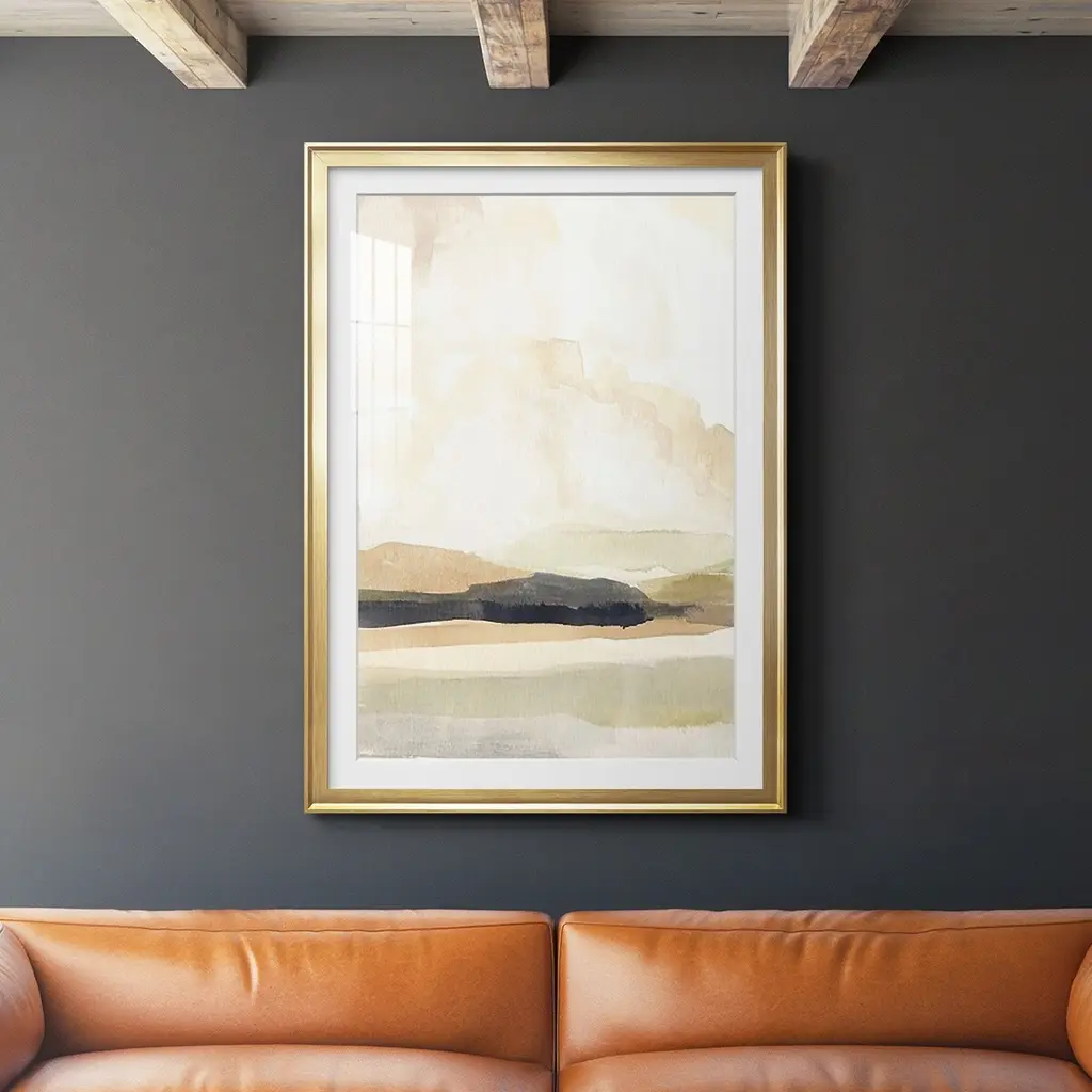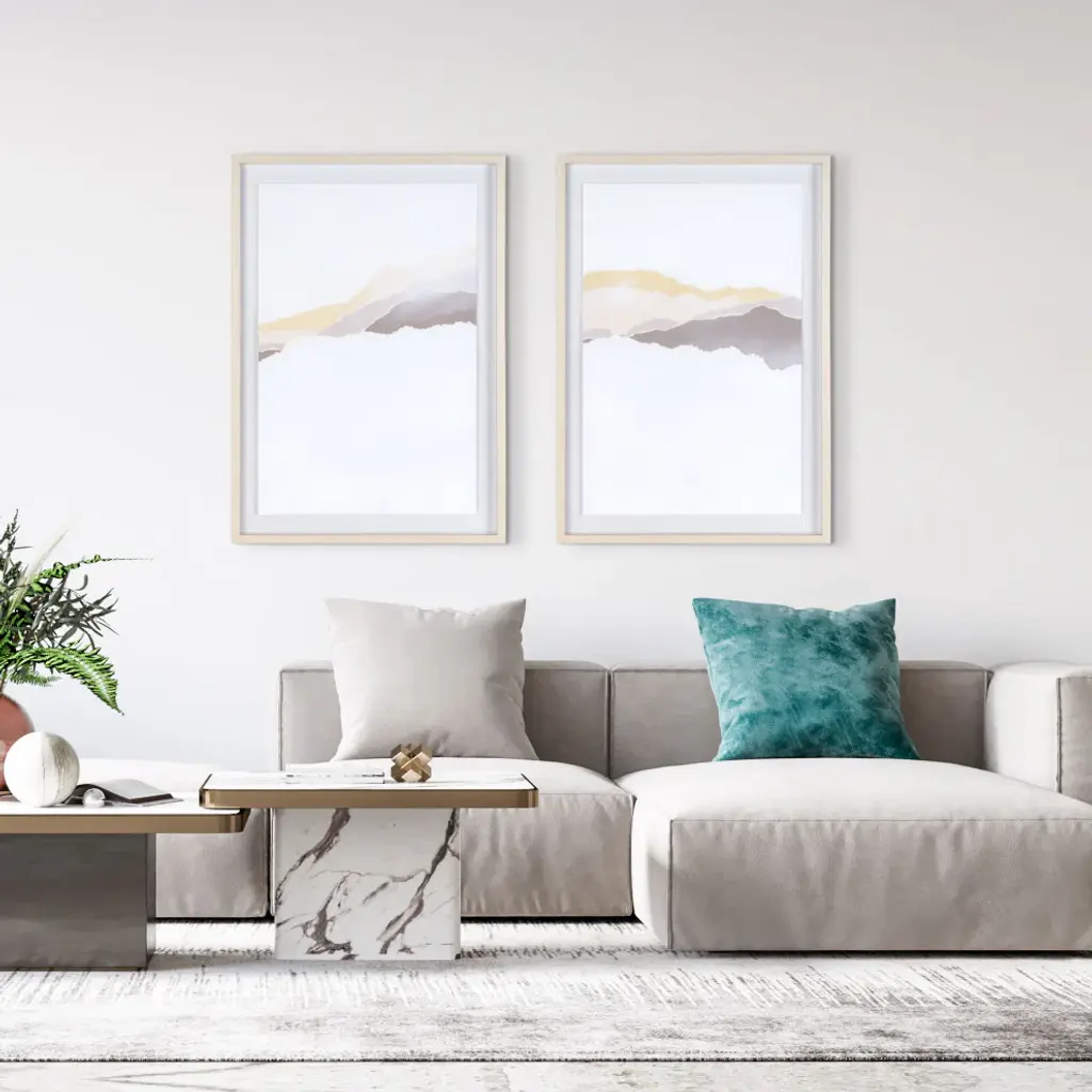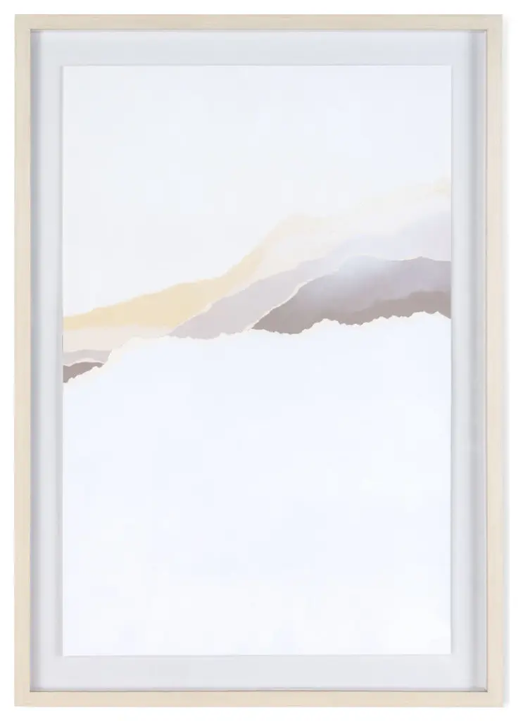 Immerse yourself in the serene beauty of this striking shadow box artwork. Standing at 26" x 2" x 37", its modern abstract design features earthy neutral tones of soft yellow and mauve, skillfully arranged torn paper evoking a majestic mountain vista. Enclosed within a polycomposite frame with a light wood finish and safeguarded by plexiglass, each piece radiates sophistication and tranquility. Sold separately but paired with a complementary counterpart, they harmonize effortlessly to create a captivating focal point in any space.Earthy neutral tones converge in a harmonious blend, evoking the serene beauty of natural landscapesWith dimensions of 26" x 2" x 37", it offers a substantial yet tasteful presence, making a notable addition to any spaceIndividualistic yet Unified: Each piece sold separately but thoughtfully designed to complement its counterpart, allowing for endless possibilities in creating a cohesive and dynamic displayReady to hang using pre-attached hooks