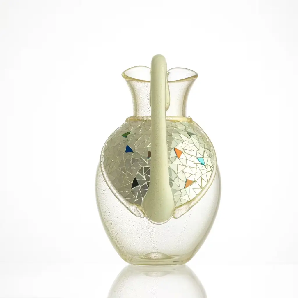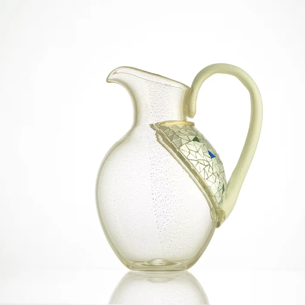 The striking Vela water carafe from the Tableware Collection is made of gold and crystal Murano blown glass. Enriched with a triangular section of irregular textured mosaic made with white gold foil tesserae between transparent gold glass bands, it is a functional art piece with a capacity of more than one liter and a must have for any elegant kitchen.