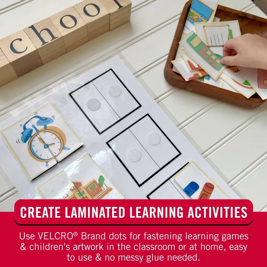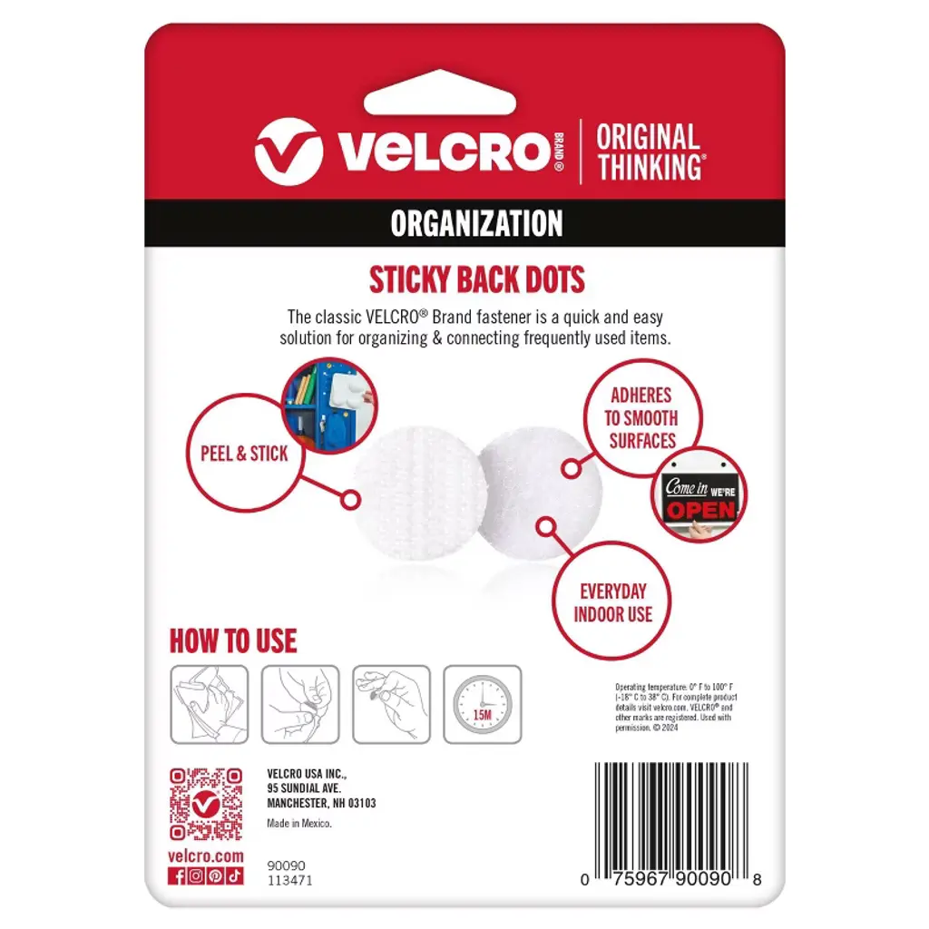 VELCRO Brand Sticky Back hook and loop fasteners deliver strong holding power.VELCRO Brand Dots are perfect for laminating machine projects. Use small VELCRO Brand adhesive dots to easily hand and move kids artwork, make calendars, weekly menus and educational games. As classroom supplies for teachers and educators, round VELCRO Brand dots keep your classroom tidy and fasten items to desks and folders, stick nametags to back the back of chairs. Simple peel and stick application. For smooth surfaces such as painted wallboard, glass, metal and most plastics, can be used for indoor or outdoor applications. VELCRO Brand is the original hook and loop fastener. Much better durability and strength than other off brand fasteners. They are available in squares, coins, strips, and tapes and come in a range of different sizes and colors. A must have for any home, school or office. Great for organization, mounting, hanging, and securing. Instructions: 1. Clean and dry surface before application. 2. Peel tape from fastener and press firmly into place. 3. Adhesive reaches maximum strength after 24 hours. Note: Not recommended for fabrics, flexible vinyl or underwater use. Continued exposure to full sunlight can damage fastener.