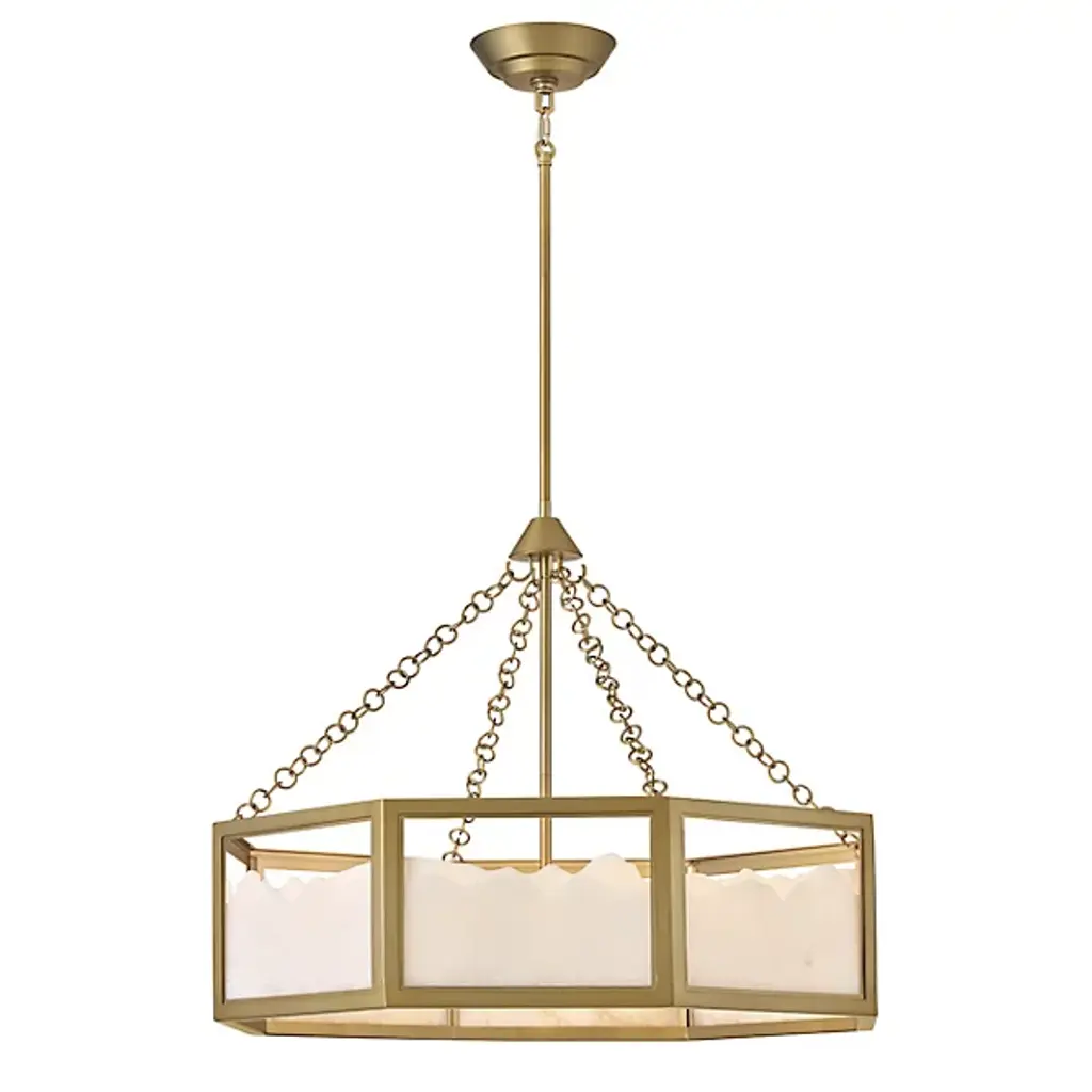 The Veleta Drum Chandelier from Fredrick Ramond translates classic Italian stonework into cylindrical drum form. The steel frame creates a circular canvas for panels of natural alabaster, crowned with irregular edges that break the geometric profile. Chain suspension adds vertical drama while maintaining visual lightness. The stone's inherent variations in density and pattern mean each fixture becomes a unique art piece. Light passing through the alabaster reveals the stone's internal structure, creating a nuanced radiance that changes with the viewing angle.