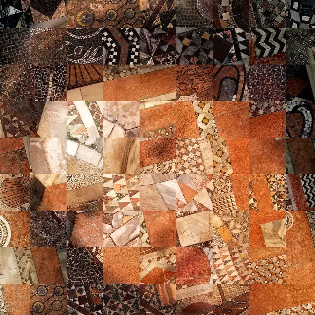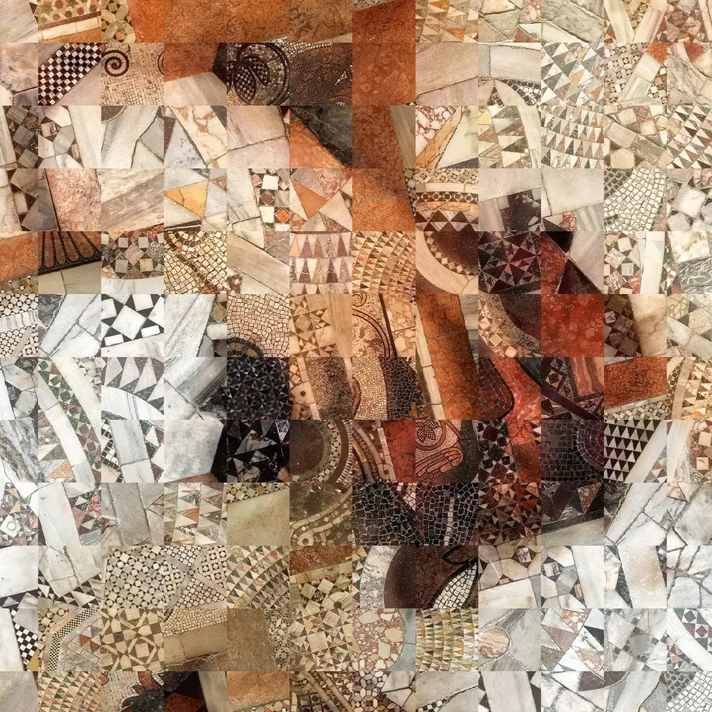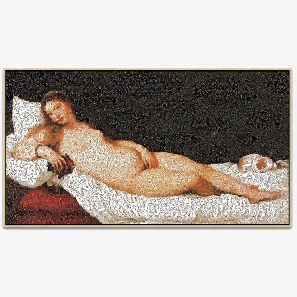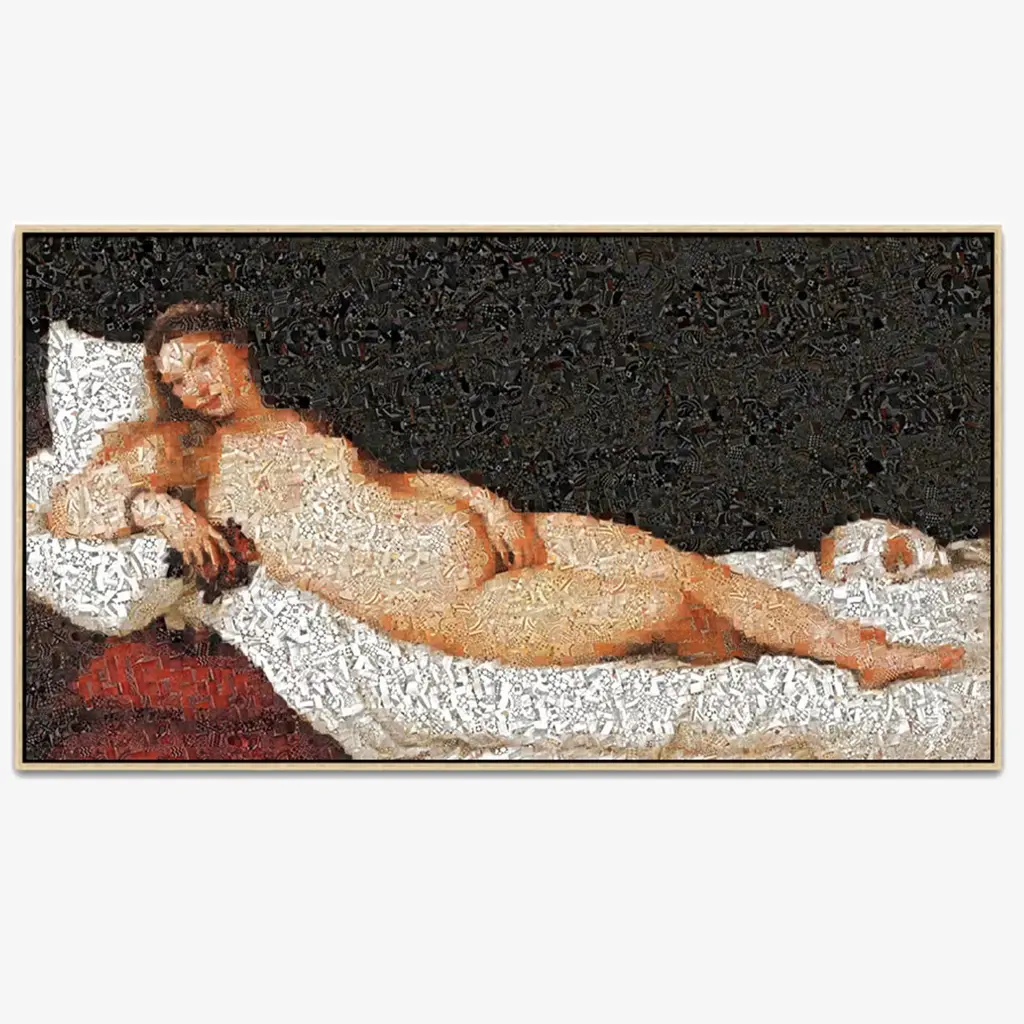 Venere Di Urbino is composed of 4.347 photographic tiles of the mosaic floor of St.Mark’s Basilica in Venice that have been used to elaborate this unique work provided with a double certificate of authenticity and uniqueness countersigned by the artist and blockchain registered. The work can be ordered with a handcrafted wood frame. Revisiting Tiziano’s 'Venere di Urbino' 92×172 cm, 2023, pigment print on fine art paper, acrylic glass, aluminum. Please ask the Concierge for further information.