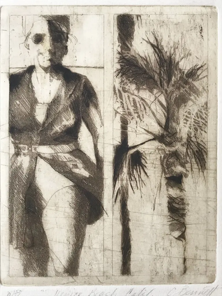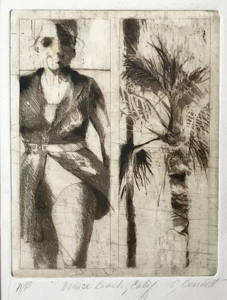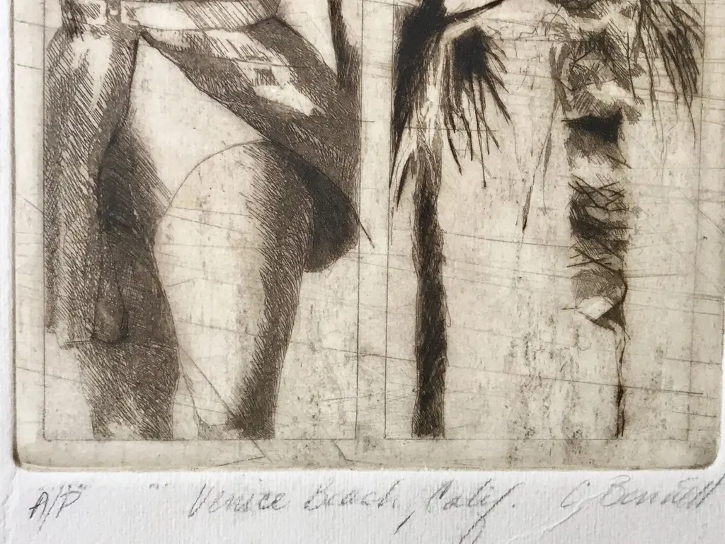 Artist proof etching of a woman and a palm tree titled "Venice Beach" and signed "C. Bennett." Circa 1974. Presented matted in a distressed giltwood frame. Image: 6"L x 7.5"H; frame: 10"L x 13"H. From the estate of an instructor at UCSB at the time that Carol Bennet earned her AA at the UCSB College of Creative Studies before completing her BFA at the Art Center College of Design in Los Angeles. Carol Bennett is now best known for her series "Women in Water." Age wear.