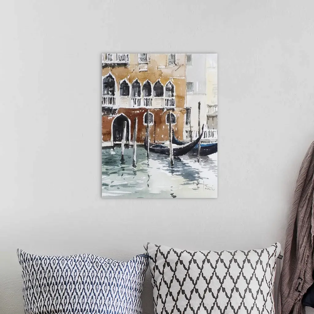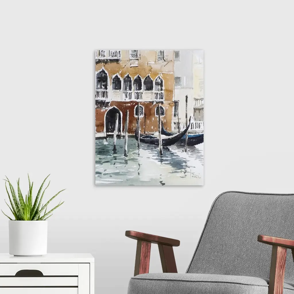 This contemporary artwork uses brown tones and rustling watercolor brush strokes to create a Venice canal with gondolas and typical Venetian red building facade.
