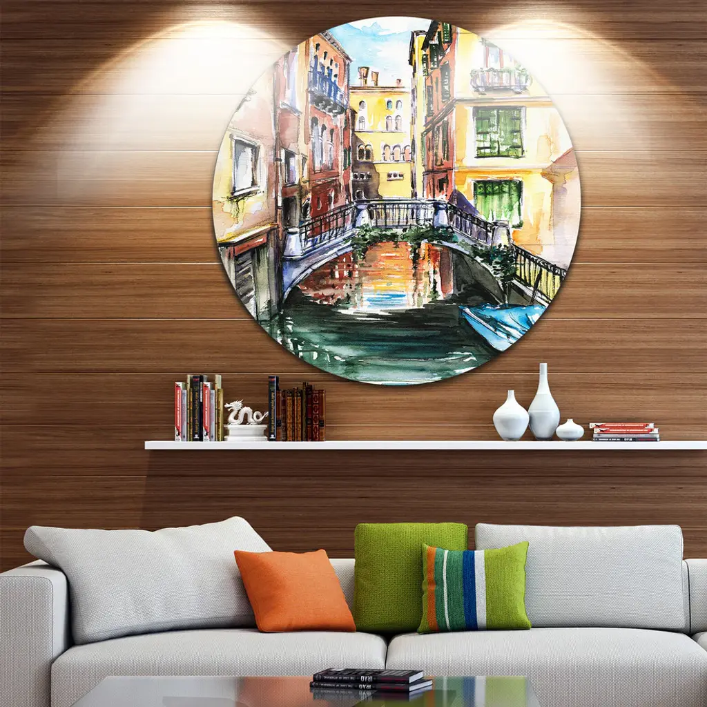 Bring Contemporary Abstraction to your home with this large Circle Metal wall art. This Venice, Canal Meeting Bridge Metal Artwork makes it the focal point of any room or office. - White Gloss Coating ensures colors are extra vibrant with light reflection.- Aluminum grade Sheet Metal with 1 inch mounting frame on the back giving the illusion that the artwork is floating on the wall..- Mounting Brackets are included along with instructions.- High Quality Digital images are created directly into a glossy aluminum panel producing a stunning and captivating print into the glossy finish of the metal.- Water, Fire and Scratch resistant HD Aluminum panels.- Looks better than any photo paper and guaranteed to last at least 20 years- Easy to clean with a microfiber cloth. Colors are far superior to regular Canvas Art. - Easy to Hang