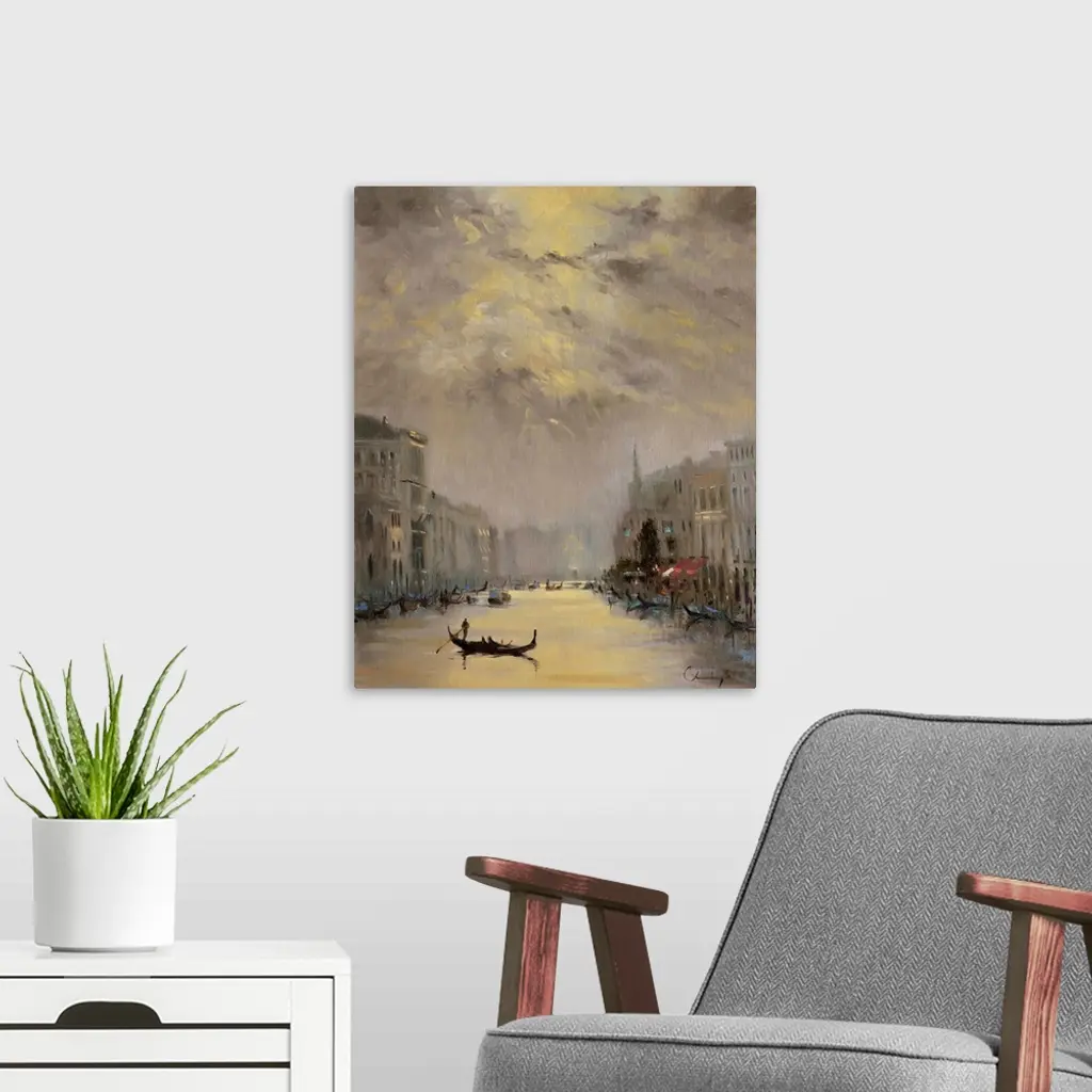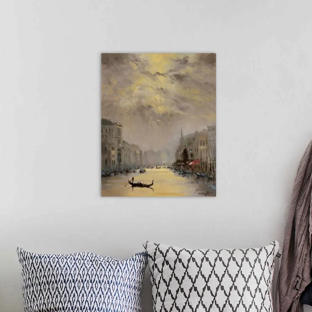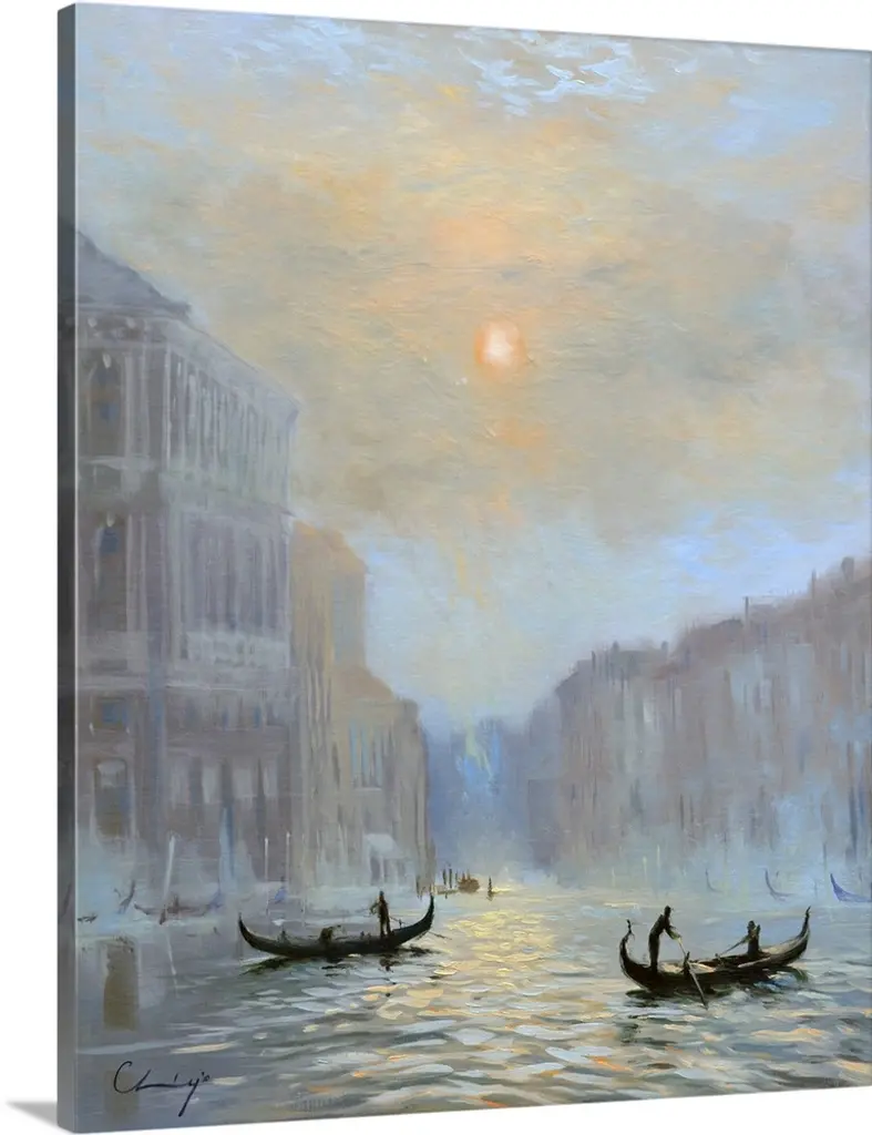 A contemporary painting of a Venetian cityscape.
