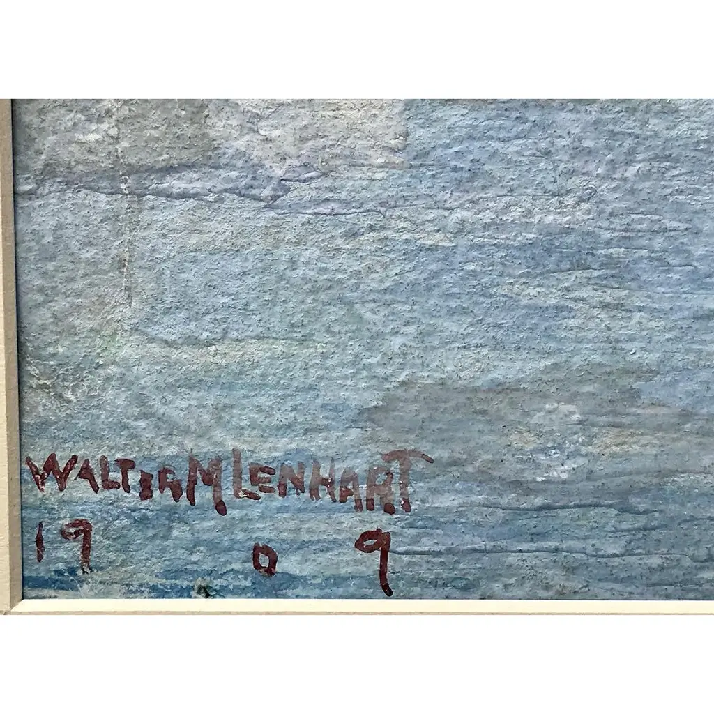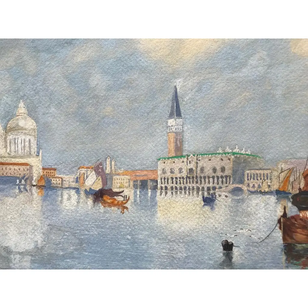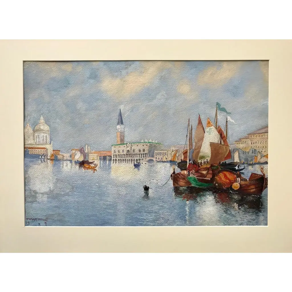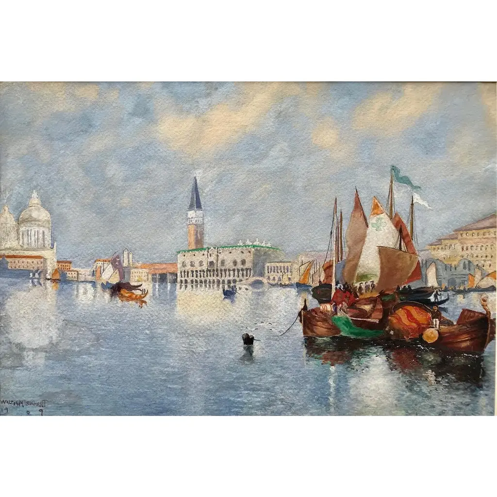 A beautiful original antique watercolor painting of the Venice Grand Canal with gondolas signed lower left Walter M Lenhart and dated 1908. Presented matted and framed in archival materials and contemporary gallery frame.