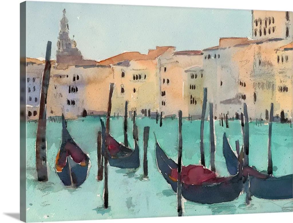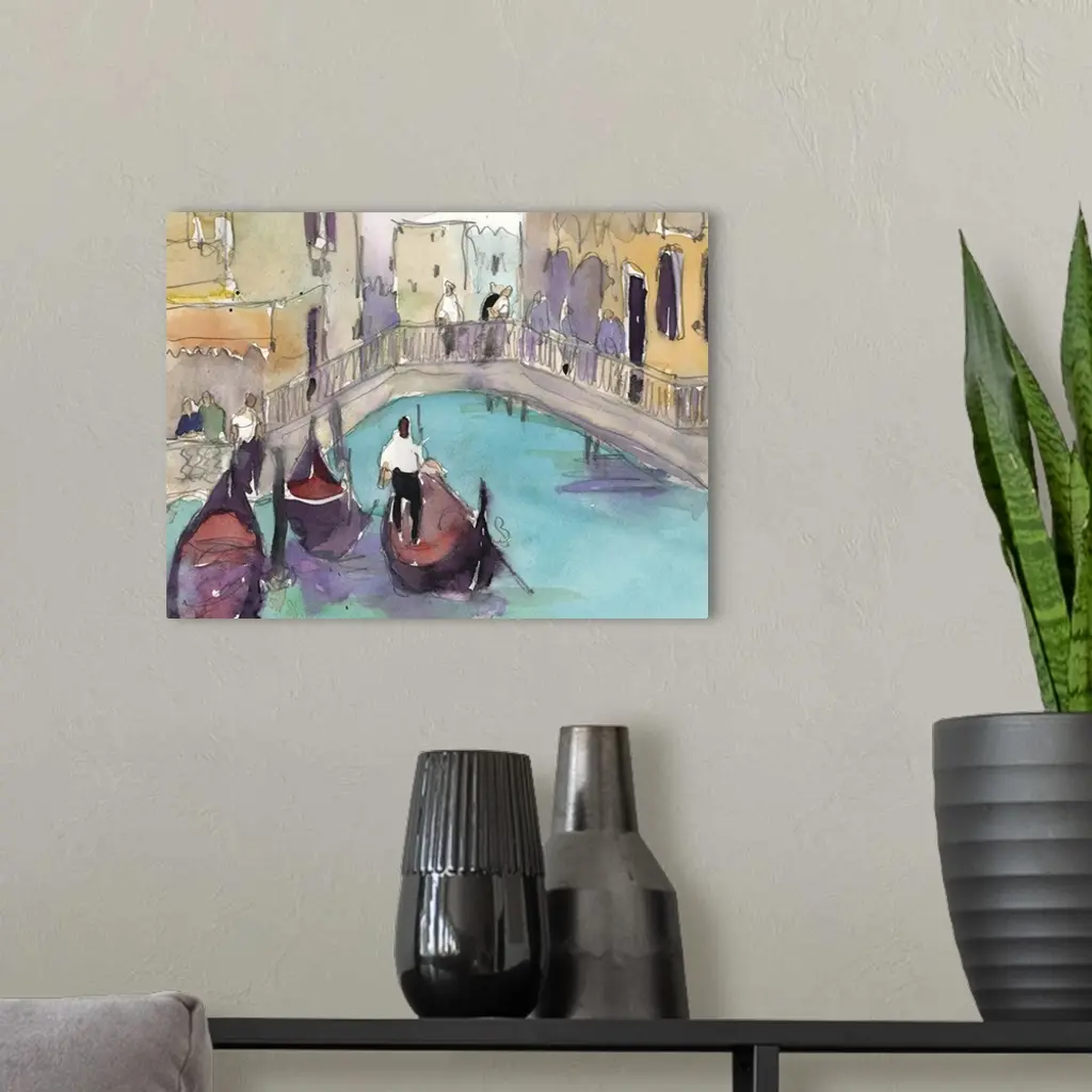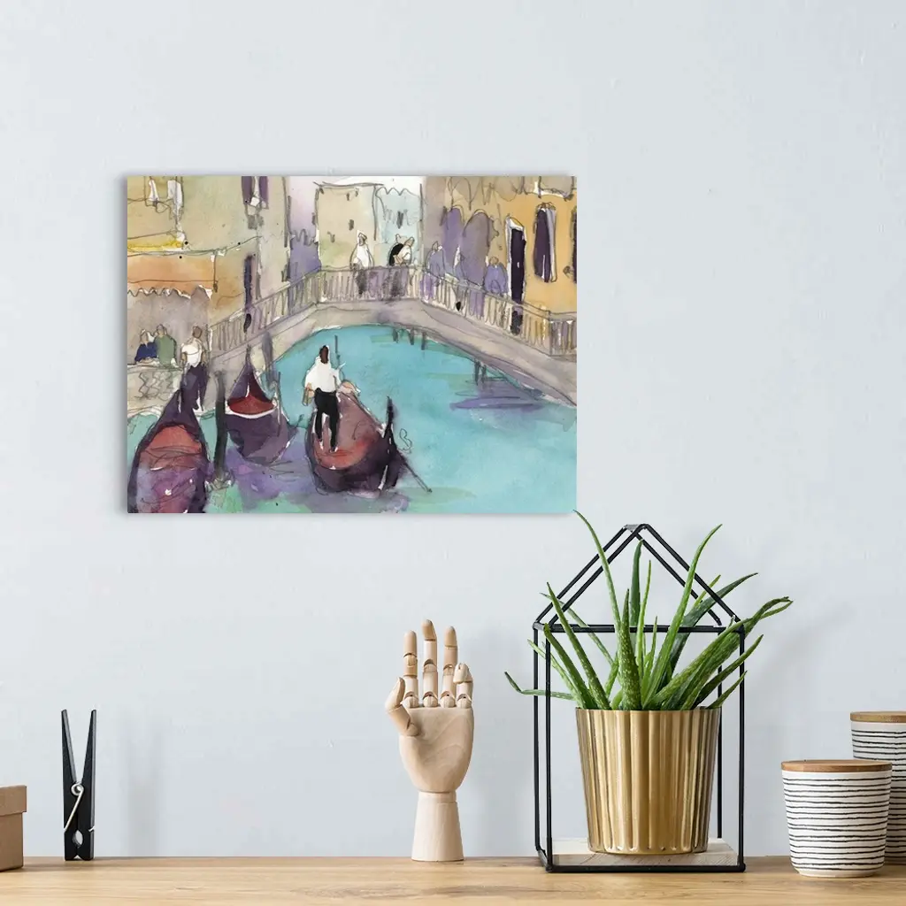 Watercolor open air painting of gondolas on the canal waters in Venice, Italy.