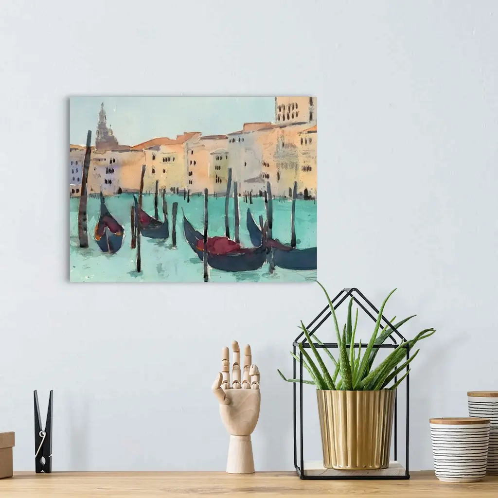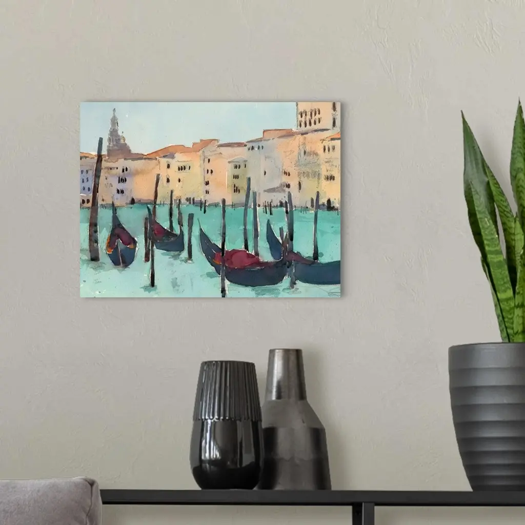 Watercolor open air painting of gondolas on the canal waters in Venice, Italy.