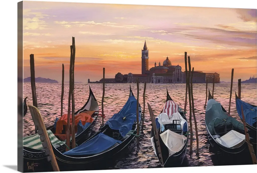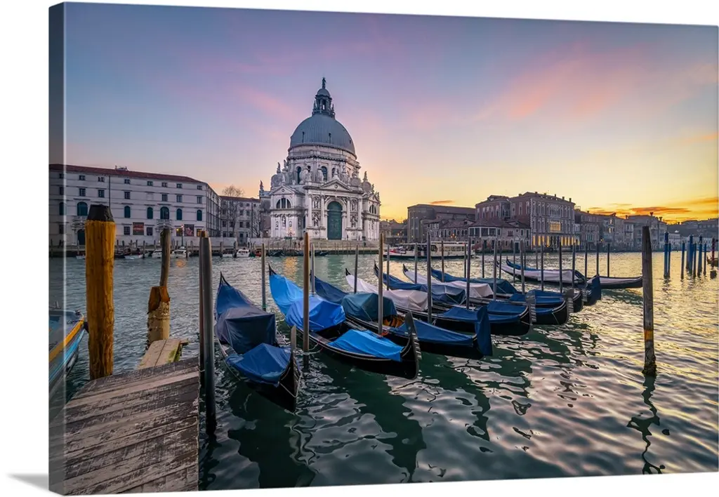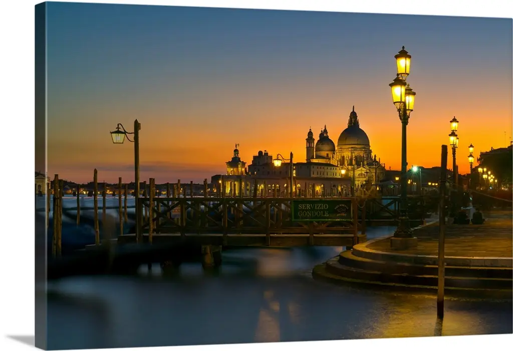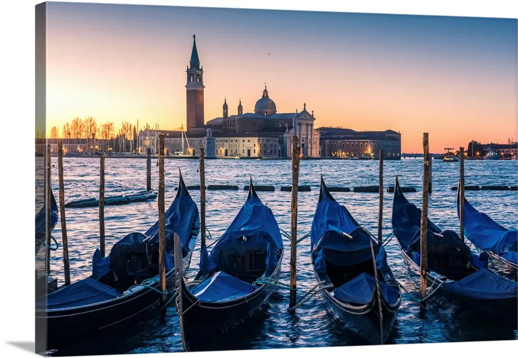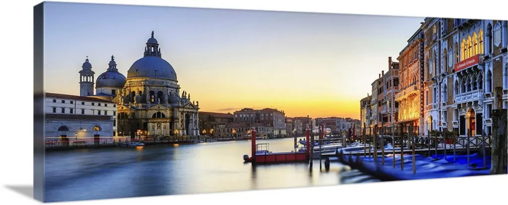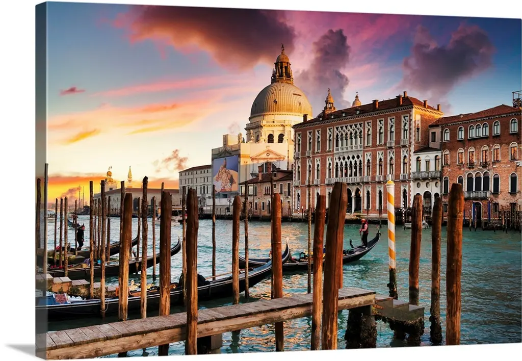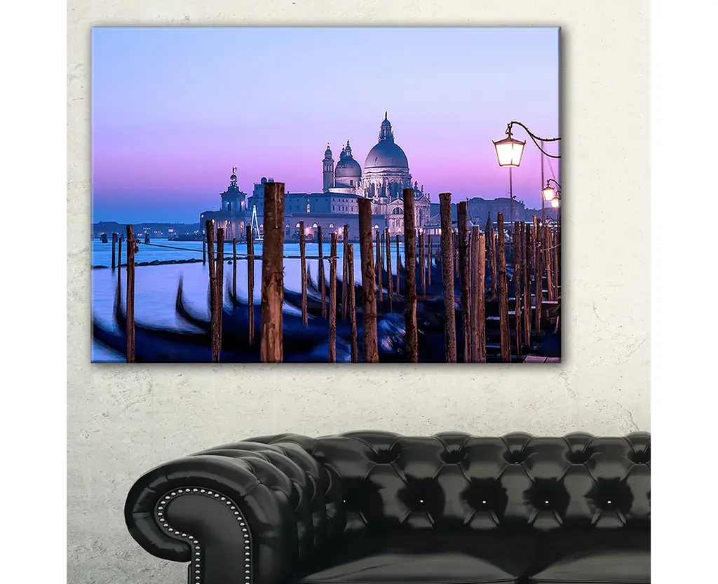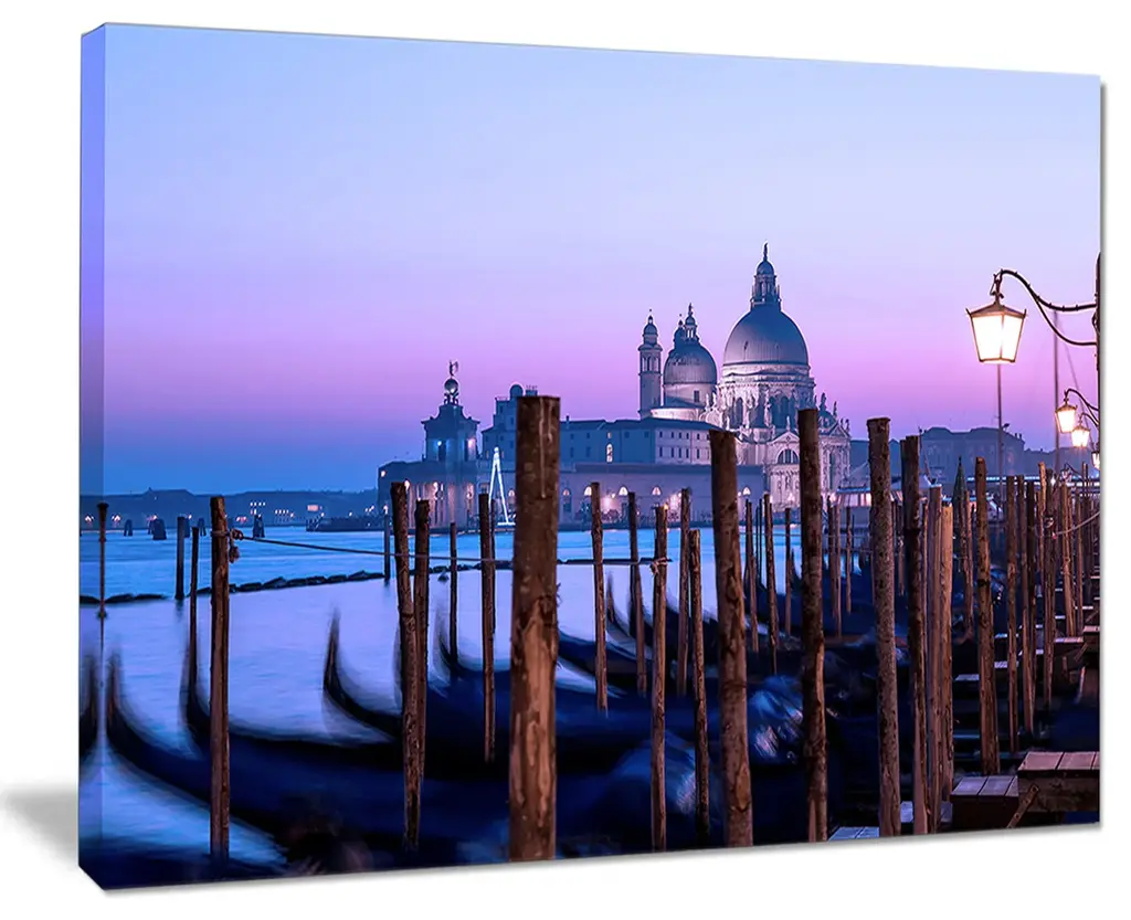 The Venice Sunset Panorama at Twilight canvas art print is sure to make an impression on anyone who sees it. This artwork is gallery wrapped around a 1-inch solid wood frame and arrives carefully packaged and entirely ready to hang on the wall. Design Art only uses the highest resolution and pigments to ensure a crisp colorful print that is never faded or pixelated. This artwork is sure to be a conversation starter in any home or office.