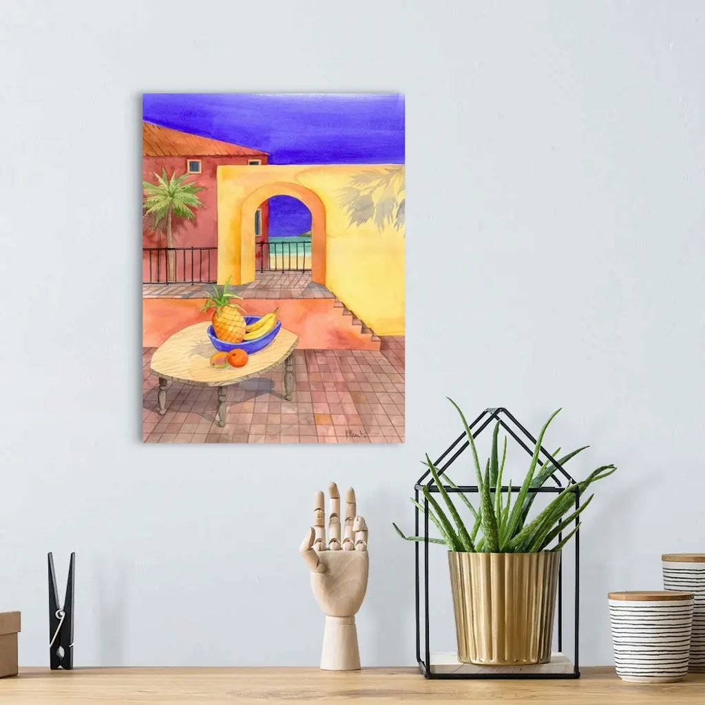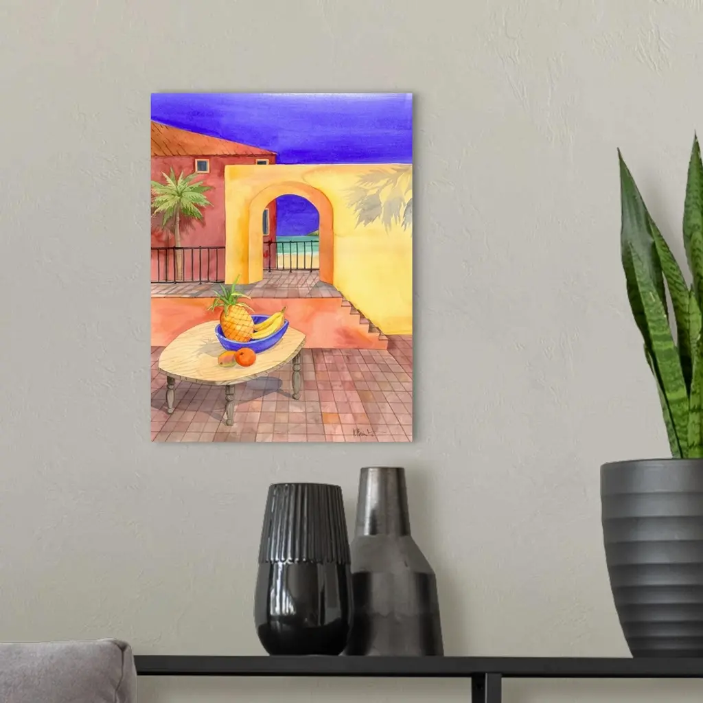Contemporary painting of a basket of fruit on a table near an adobe wall with an arched doorway.