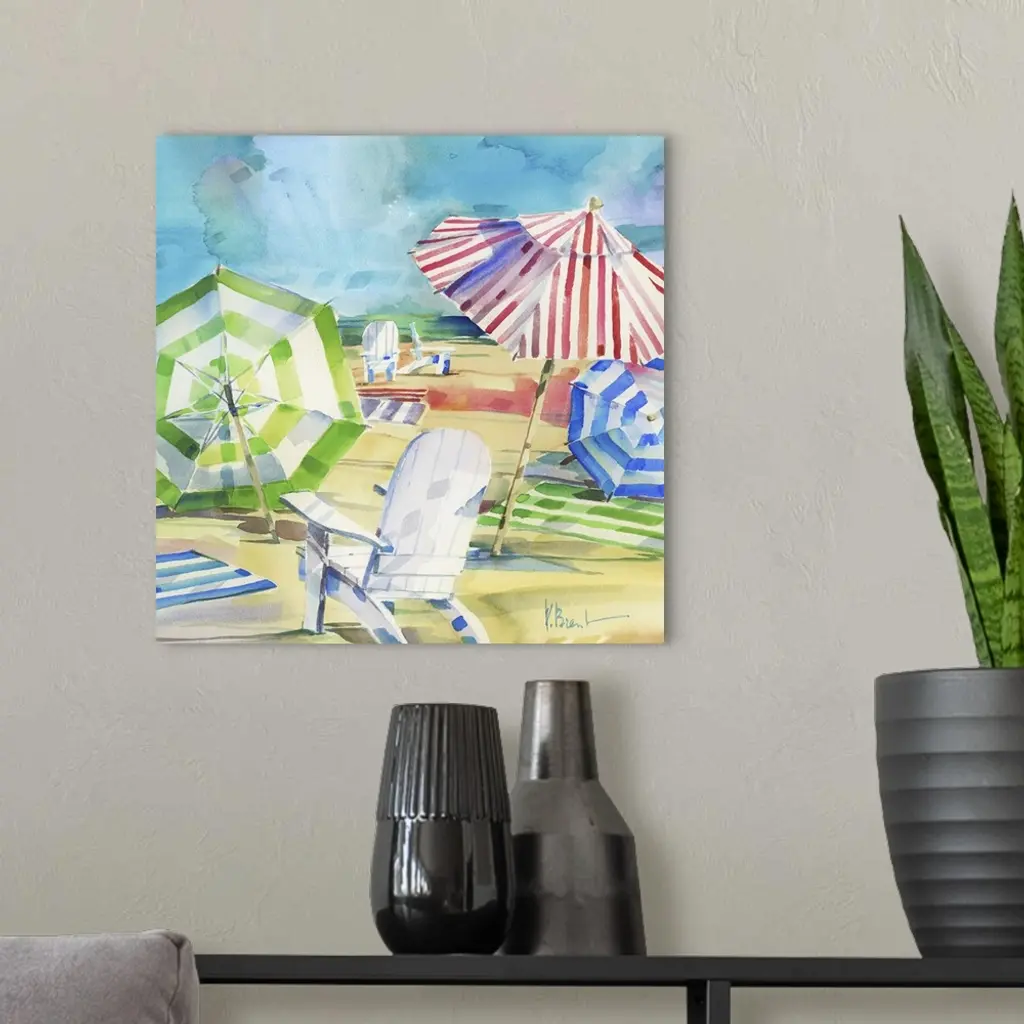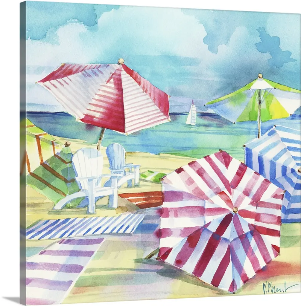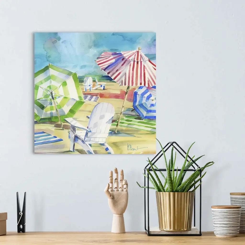 Square watercolor painting of beach chairs and umbrellas set up in the sand.