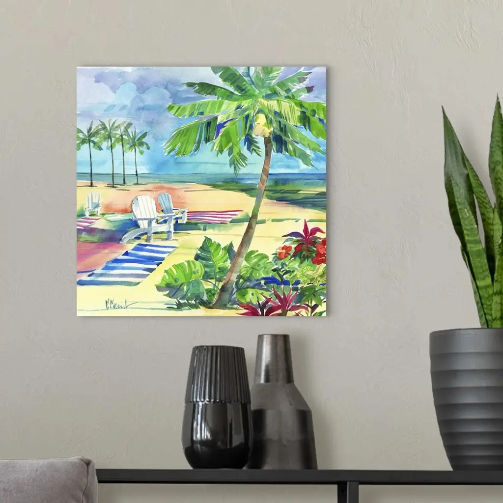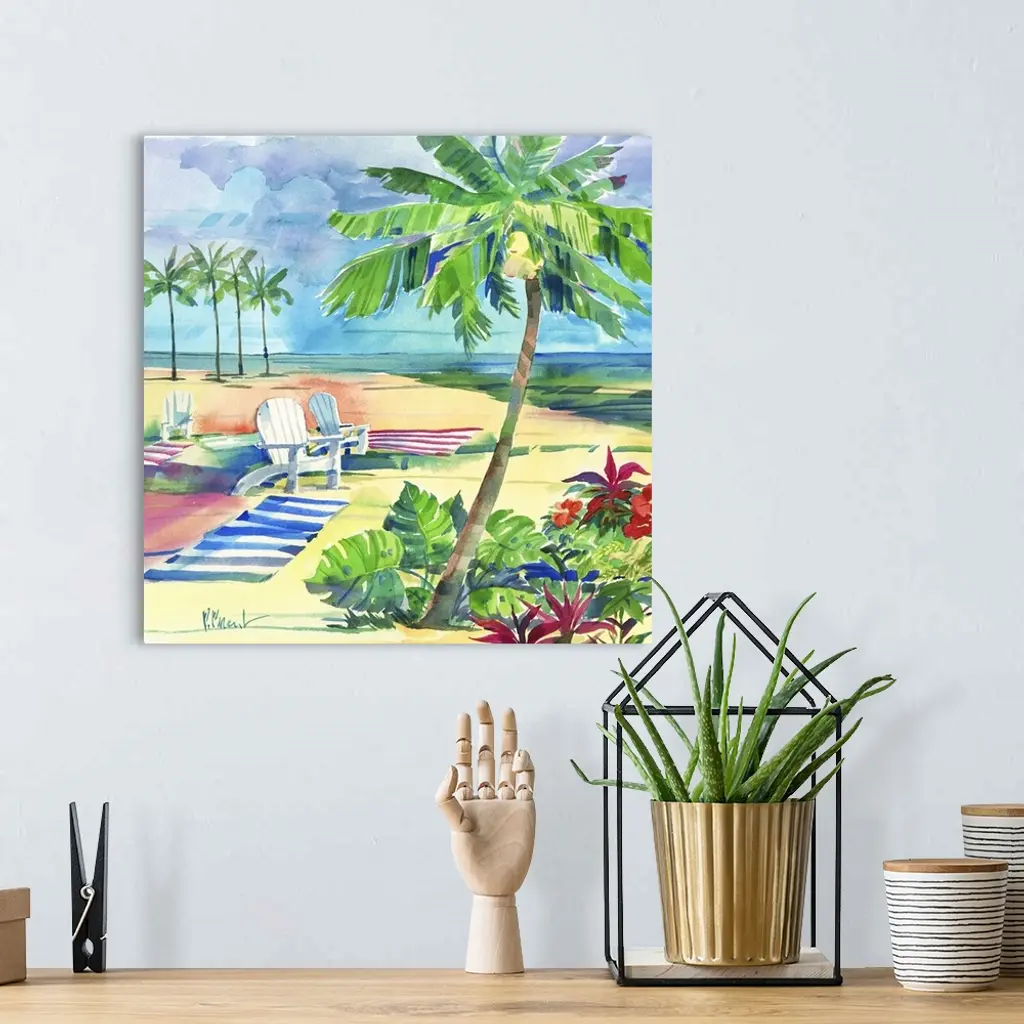 Square watercolor painting of a relaxing beach scene with beach chairs and towels set up in the sand with palm trees in the foreground and background.