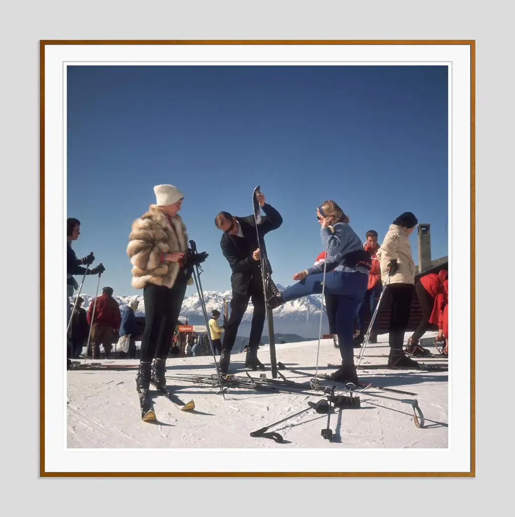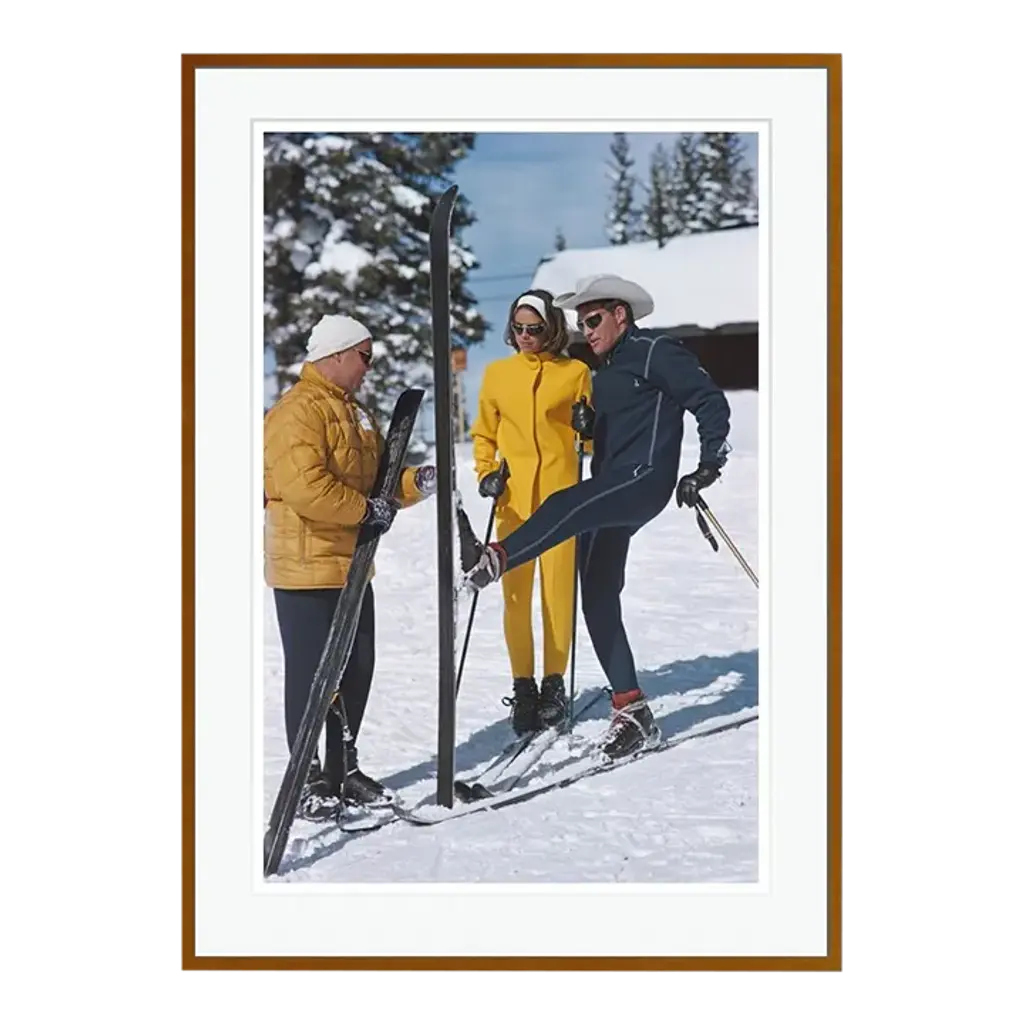 Verbier Skiers 1964 Fashionable Skiers at Verbier, 1964. (Photo by Slim Aarons) Slim Aarons was one of the twentieth century’s most prolific documenters of celebrity and socialite life. Over six decades, Aarons photographed some of the world’s most beautiful people in some of the globes most desirable destinations: jet-setting from Beverly Hills to Capri to the French Riviera, Aarons snapped the likes of the Kennedy family, Humphrey Bogart, Marilyn Monroe, and Grace Kelly. Paper size - 40 x 40 " / 101 x 101 cm Approx frame size - 47 x 47 " / 119 x 119 cm Stamped and issued by the Getty Images Archive London England (sole owners of the Slim Aarons Collection) made utilising the original transparency c print Framed in brown solid wood frame with mount and glazing - ready to hang Shipped securely, cost includes crating where necessary
