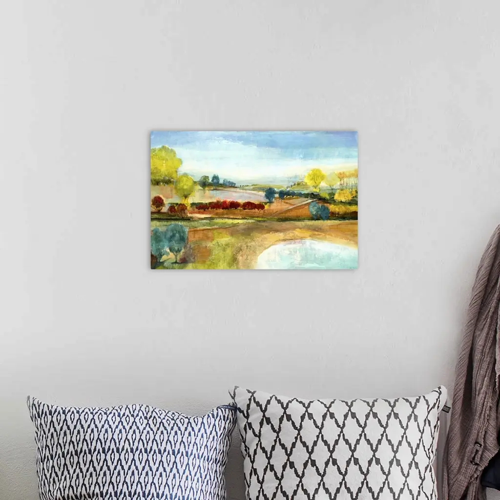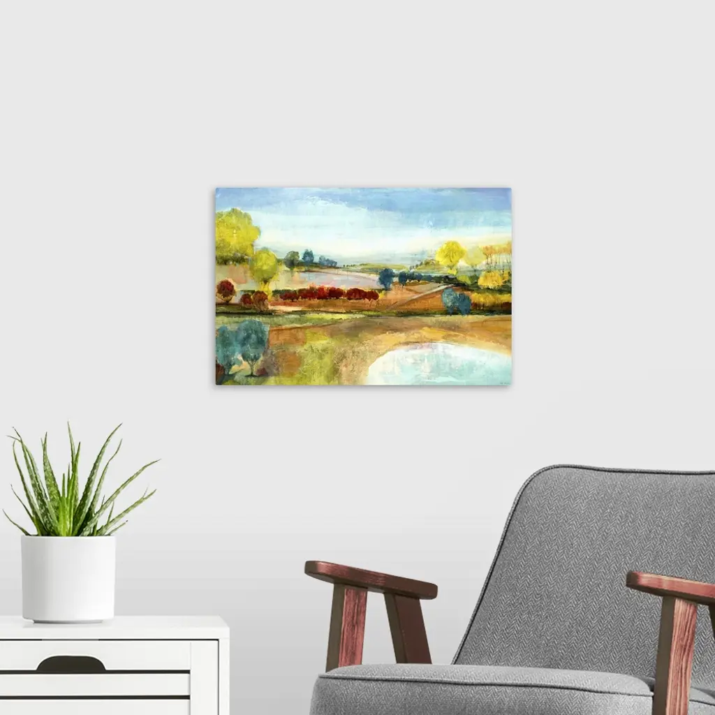 Contemporary landscape painting looking out rolling countryside.