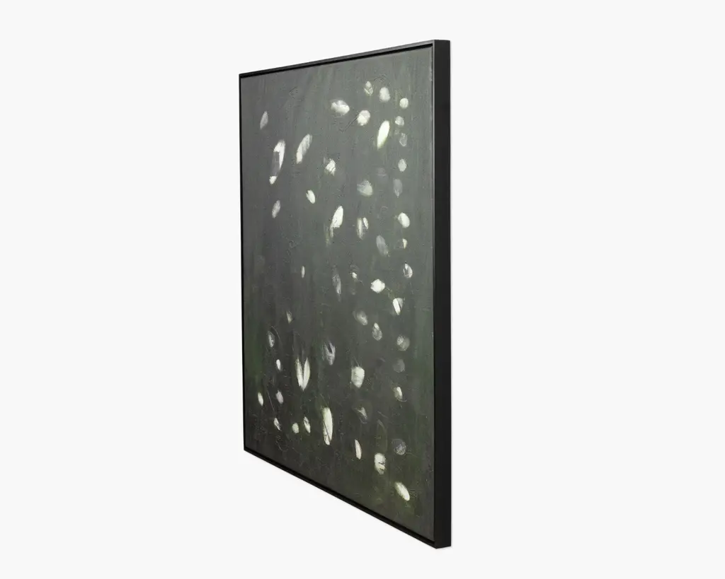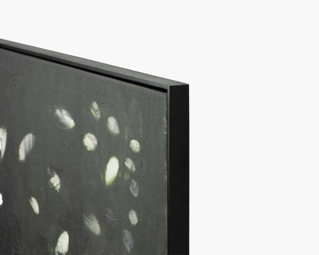 A contemporary piece inspired by nature, travel and architecture. Spot gloss detailing and framed with black-finished maple floater frame moulding for a gallery-quality look. Size shown is print size, add frame thickness to print size for total frame size Weight: 35 lbs Canvas Receives Threshold delivery.