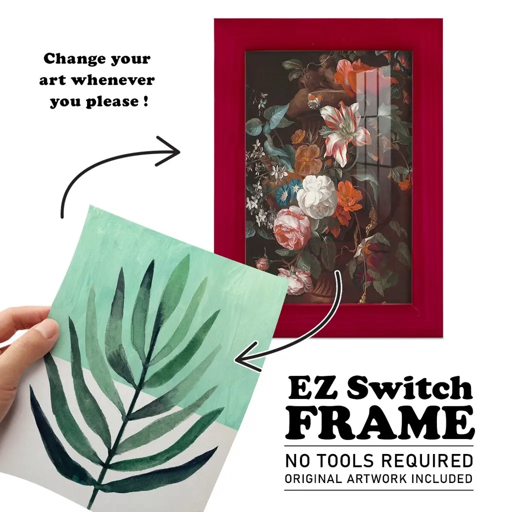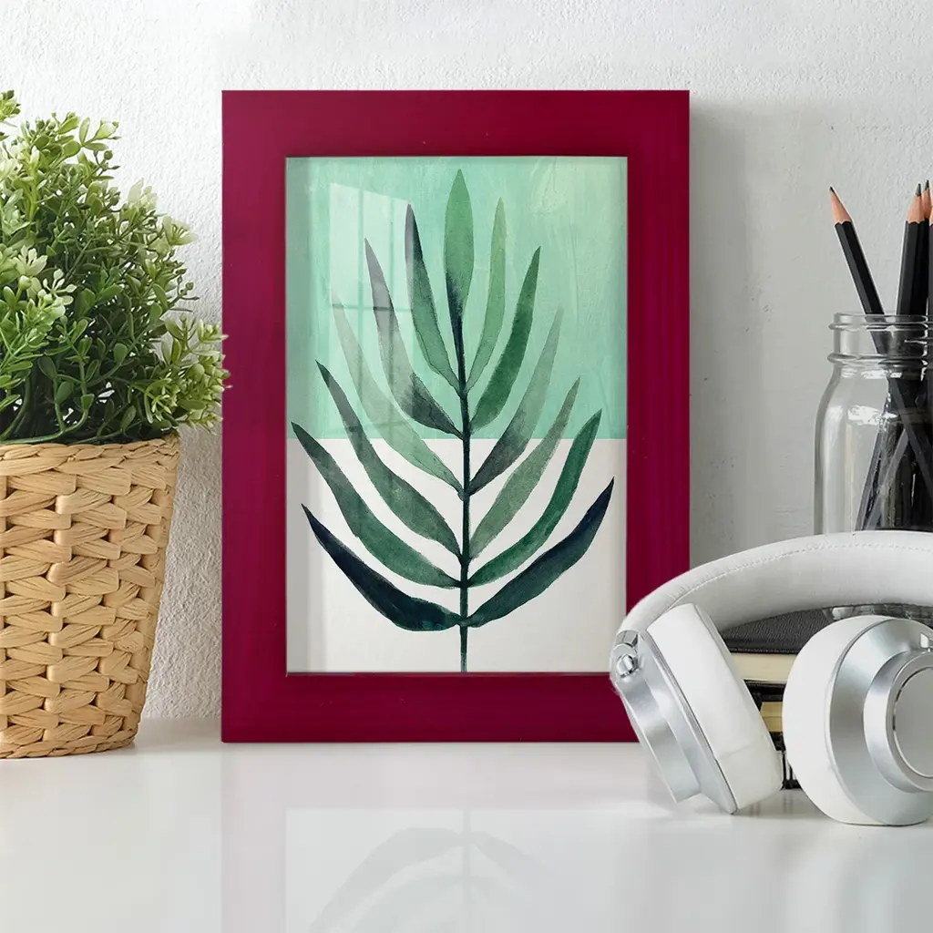 Verging Palm III -EZ SWITCH Framed Print w/glass-Cherry Red A delightful, framed print. Featuring a solid wood frame with real wood glass. This premium print is giclee quality. In addition, every frame features a removable back and table top stand. This allows you to change your art in the future or to just stand the art on a table for a new look. We are sure you'll enjoy our new series of EZ SWITCH Framed Art. Solid Wood Frame Real Glass Removable / Replaceable Art Built in Tabletop Stand Sizes range from 4x6 up to 12x15 - buy just one or pair them up as sets as you see fit.