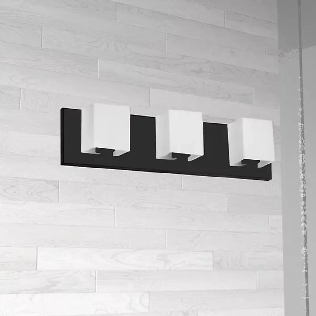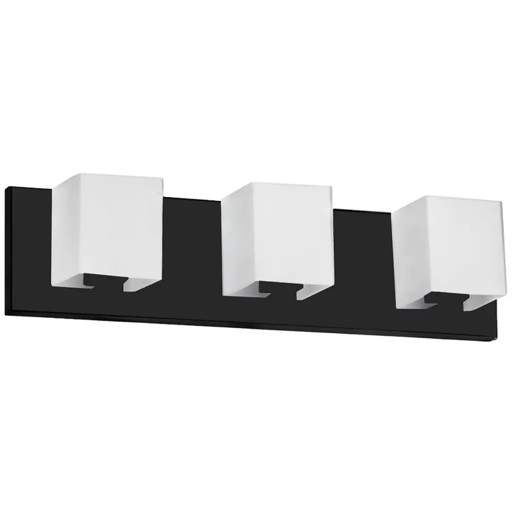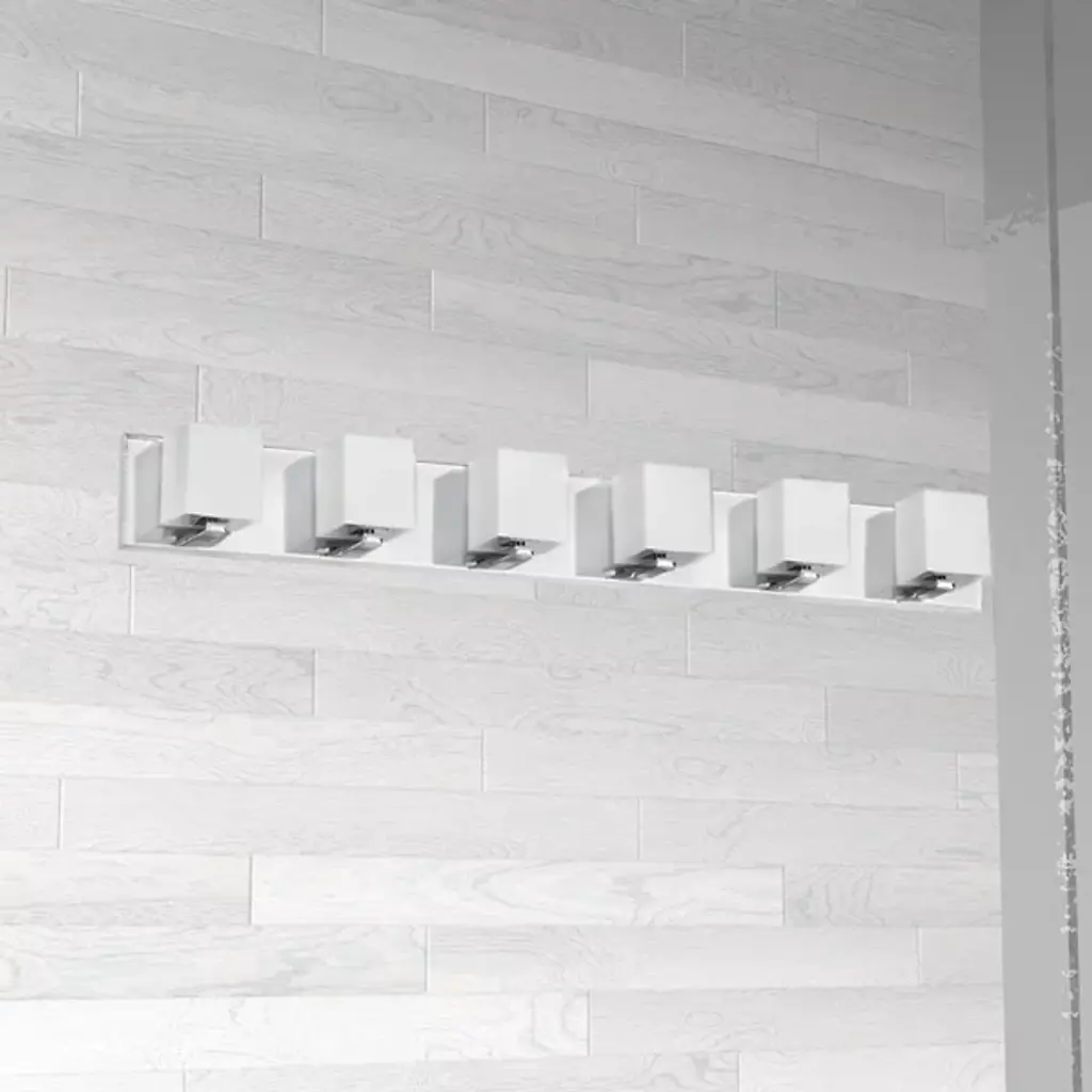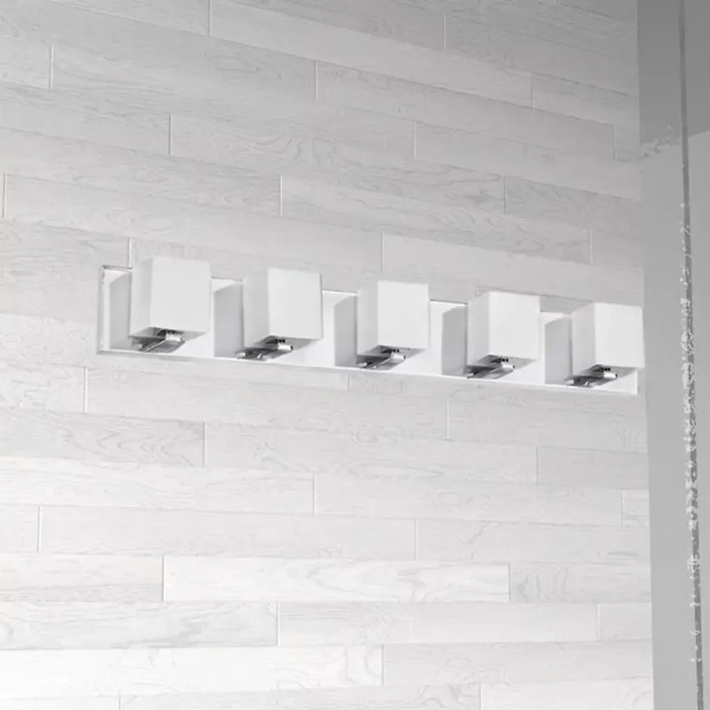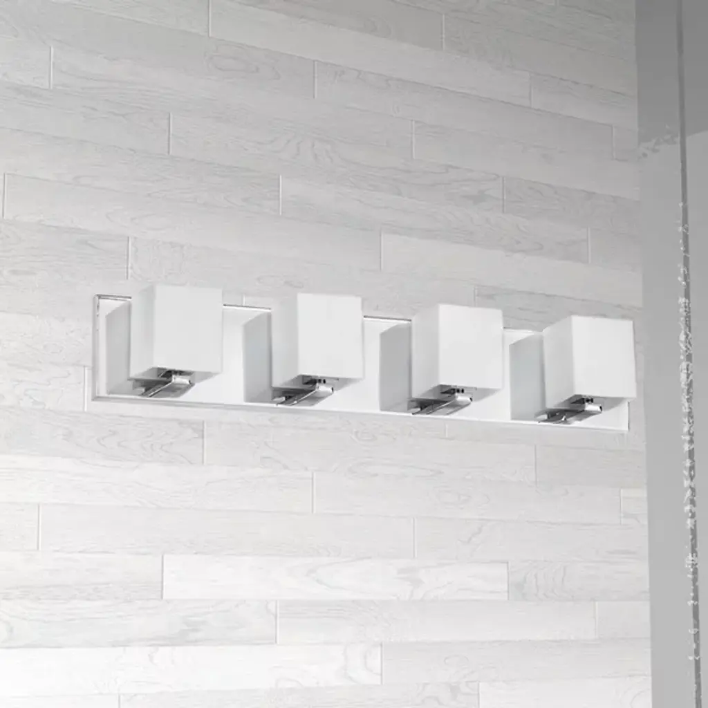 Bring light and sophisticated transitional design to your home with the Verona Vanity V1230 Vanity Light by Dainolite. Held in place by a rectangular backplate made of smooth metal, its light is contained within a series of cube-shaped frosted glass shades, with slender metal arms extending forward to support them. Incandescent light is diffused through the glass to provide ample ambient light ideal in any application perfect for illuminating a modern bathroom.