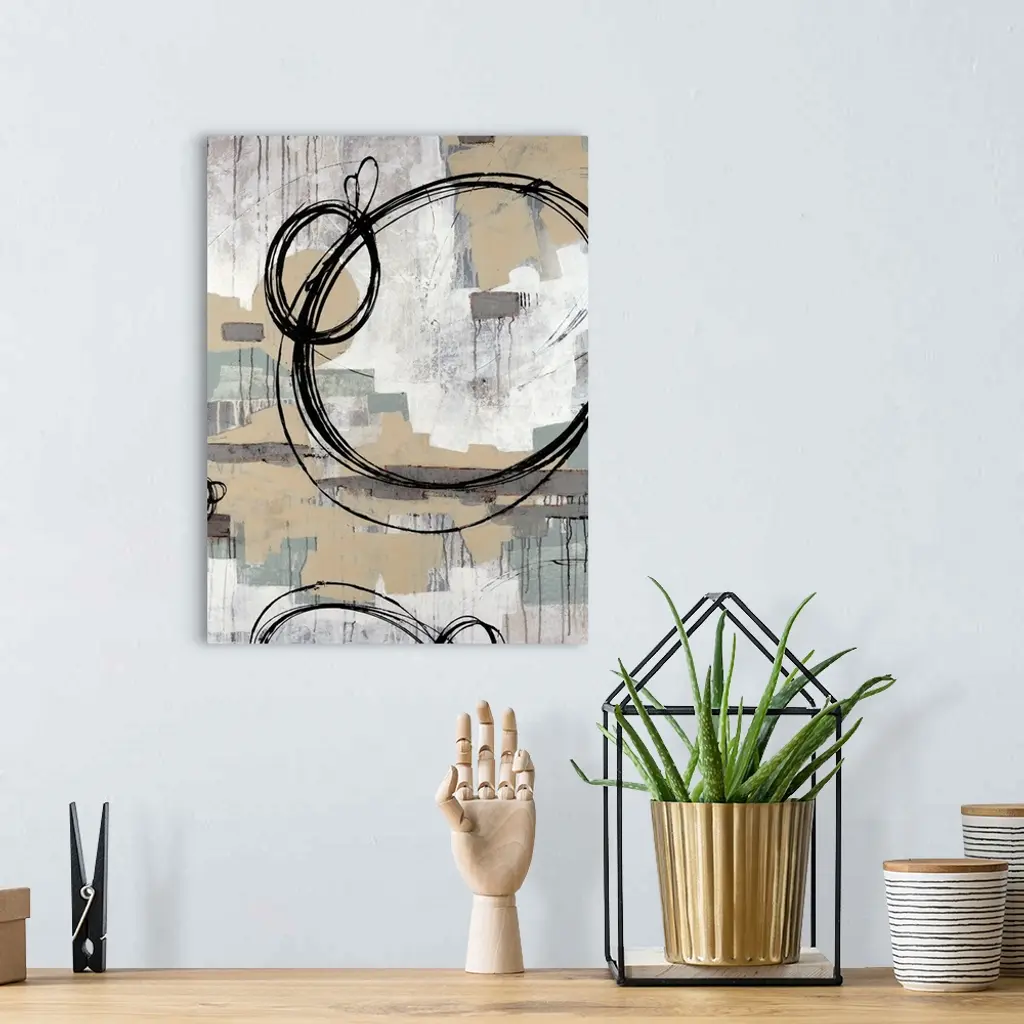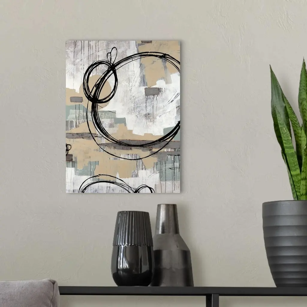 Abstract painting with neutral colors in rectangle splotches in the background with dark ring circles on top.
