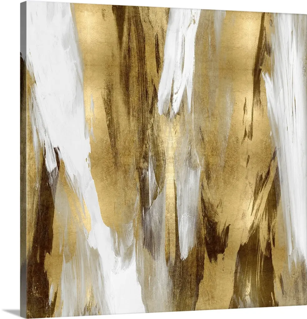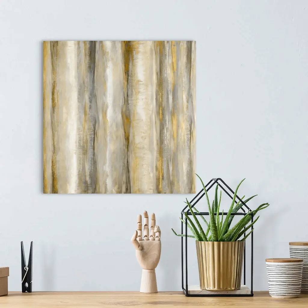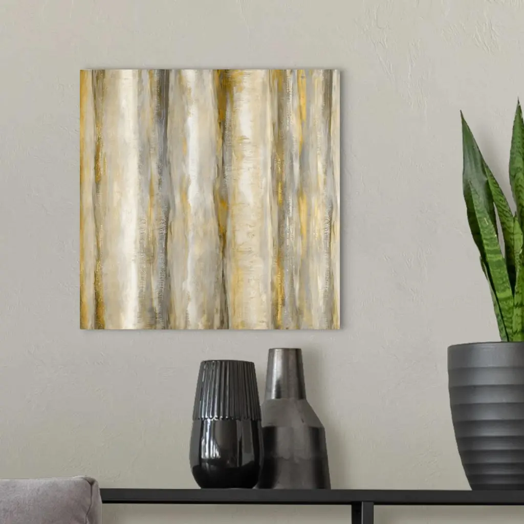 Square abstract painting with bands of metallic gold and silver running vertically across the canvas, and neutral tones in-between.