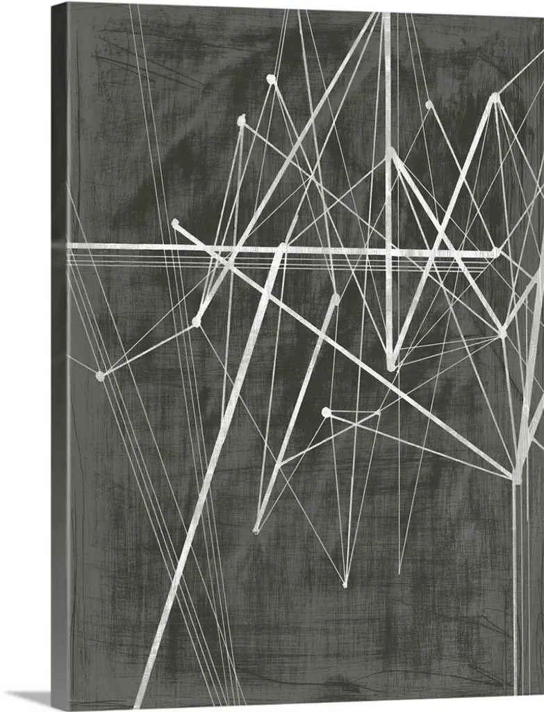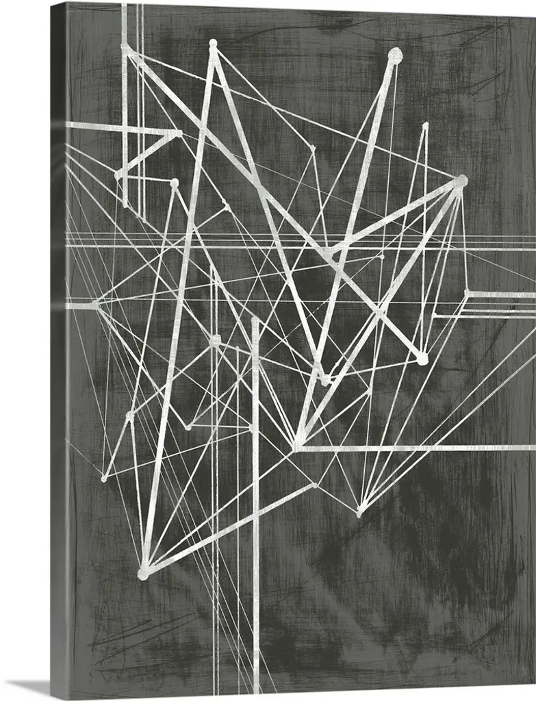 Layered geometric shapes set against a visually textured dark grey canvas give Verticles I a uniquely striking aesthetic.