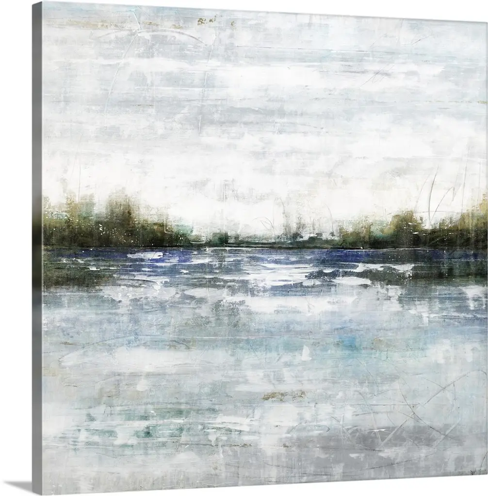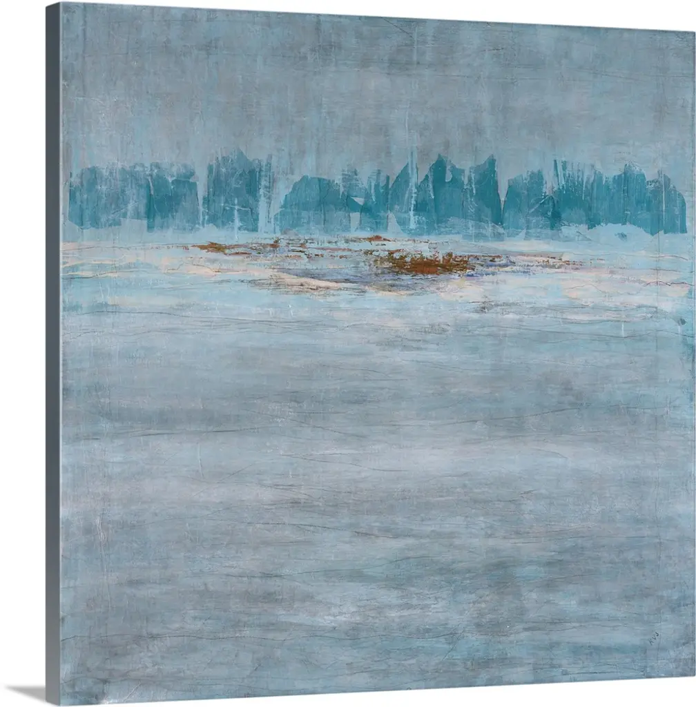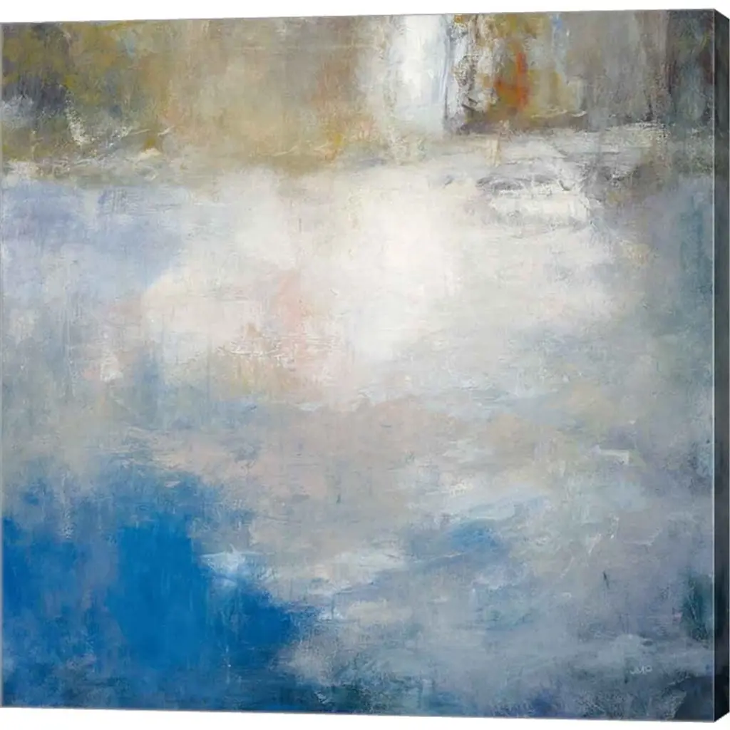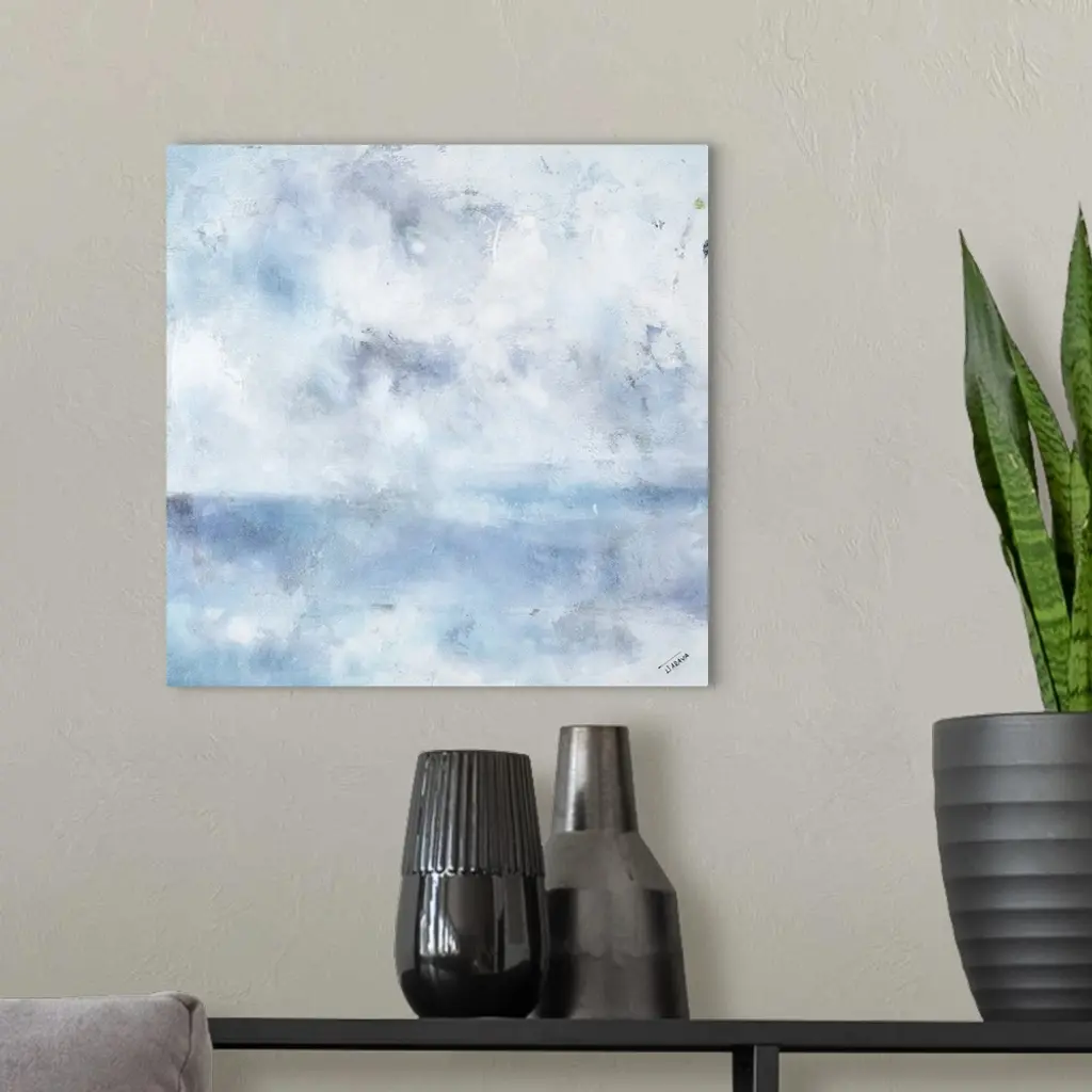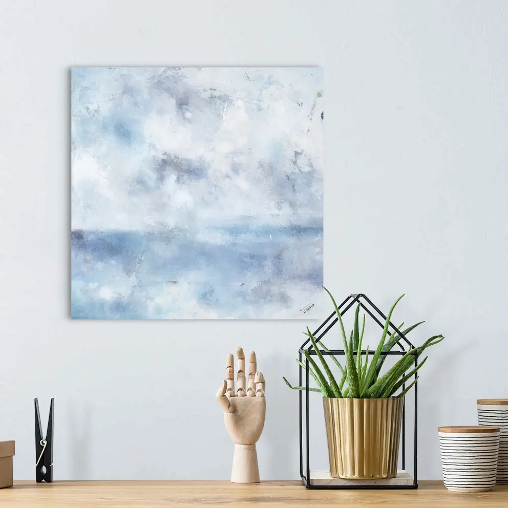 Square abstract painting in shades of blue, gray, and white with a foggy feel.