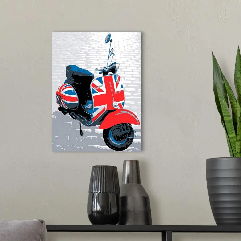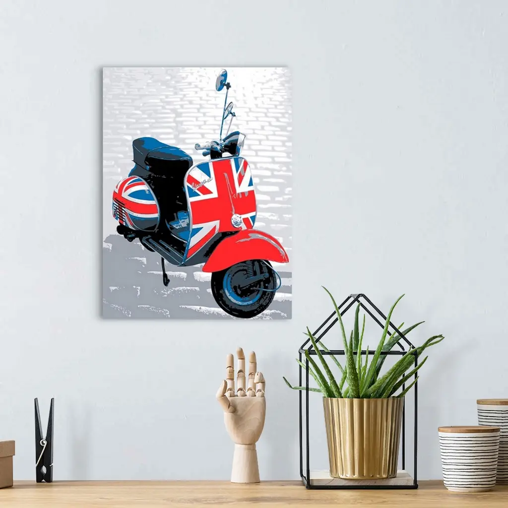 Vespa Scooter on Cobble Street, Mod style design with British flag. Pop Art Print.