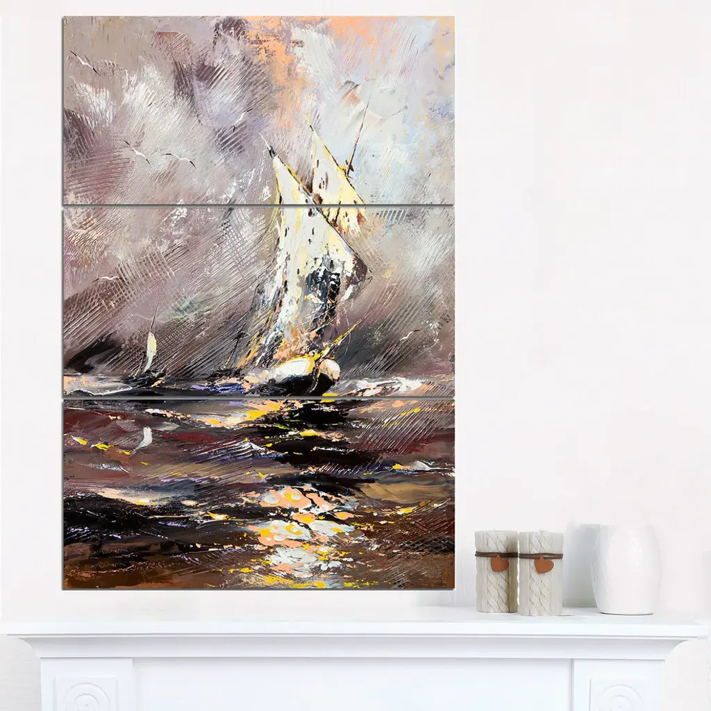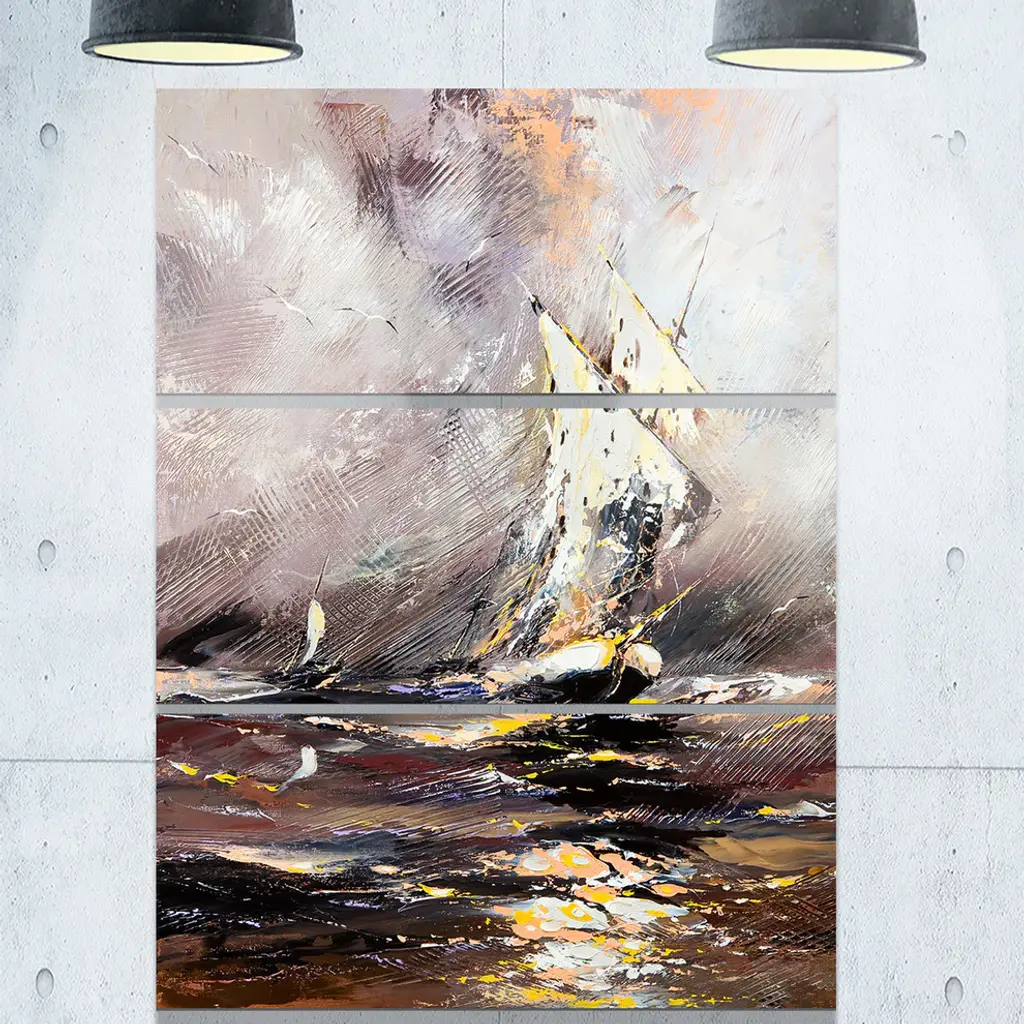"Vessel In Stormy Sea" Painting Metal Wall Art, 3 Panels, 28"x36"